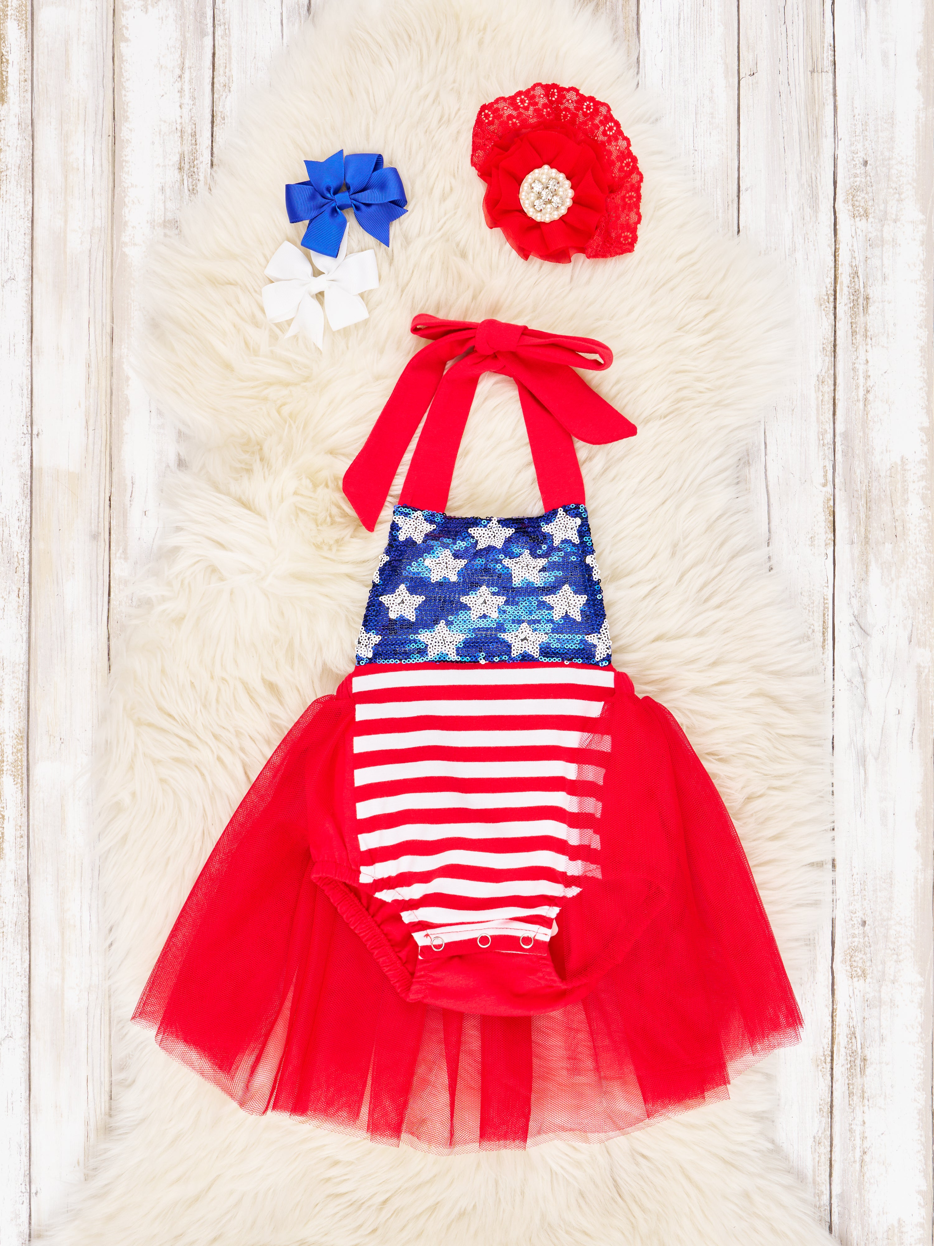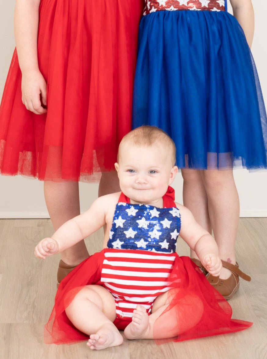 This sister set will have your kids star-gazing! An adorable outfit for 4th of July parties or any day of the week, the Stars & Stripes Sequin Red Tulle Bubble will have the kiddos looking fly! Beaming with sequin stars and tulle details, they'll be ready to dazzle!