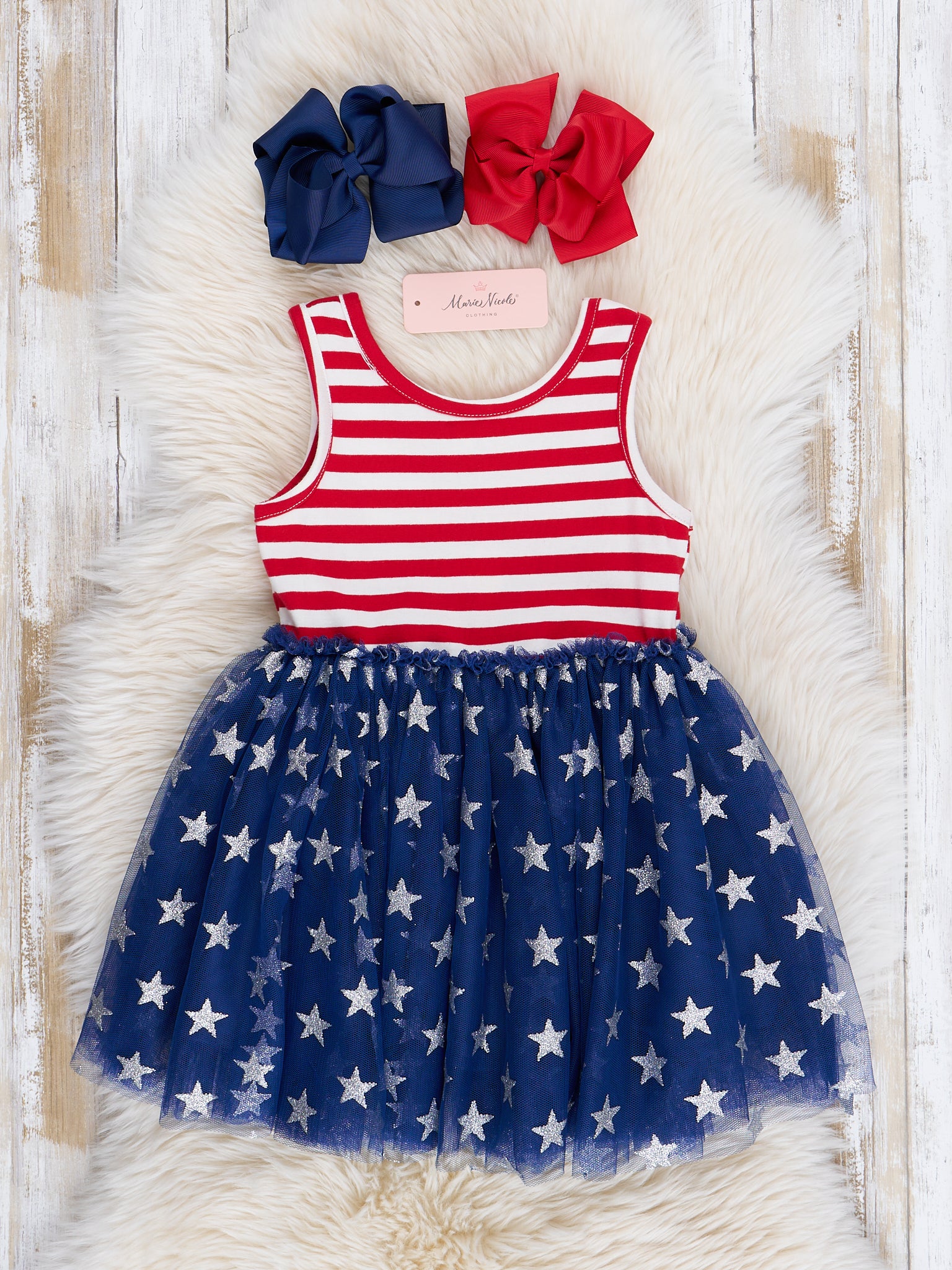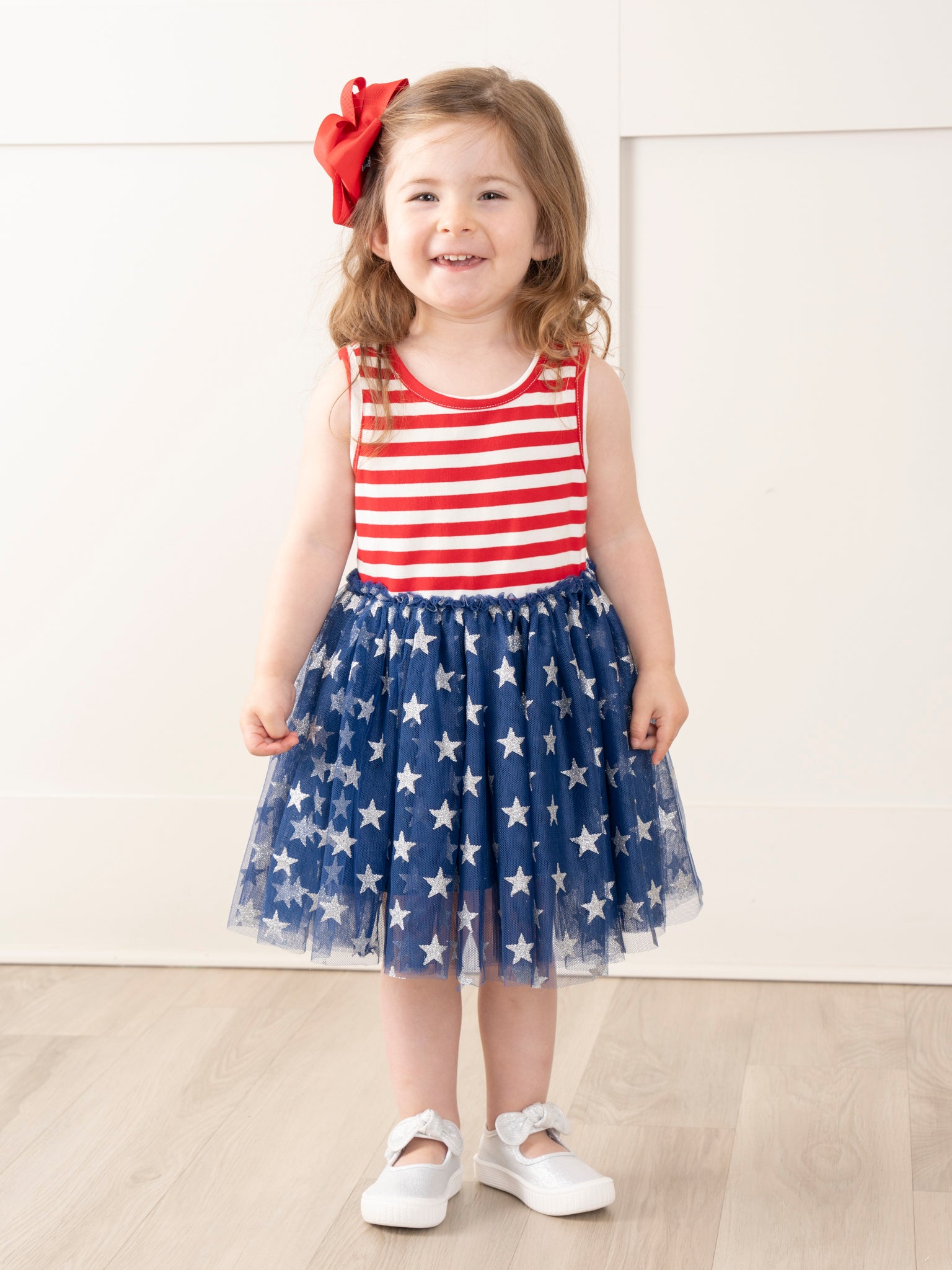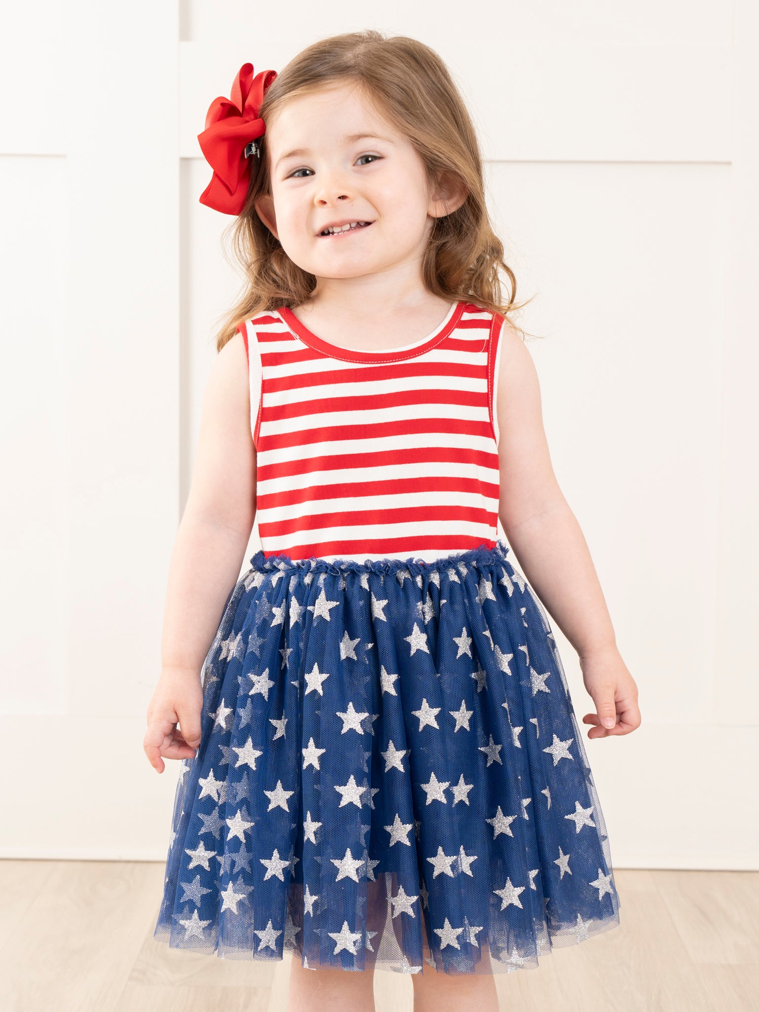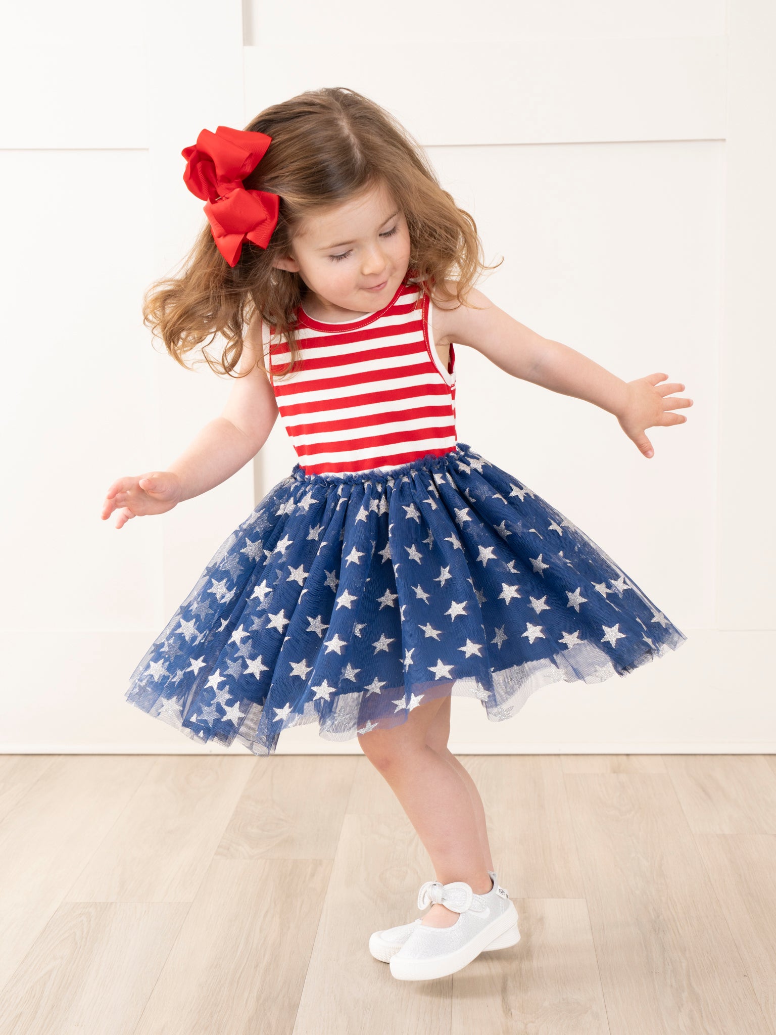 Show off your patriotic side with our Stars & Stripes Tulle Dress! This girls dress features a bold red and white striped bodice, atop a playful blue stars tulle skirt. Perfect for any celebration, stand out in style with this fun and festive dress!