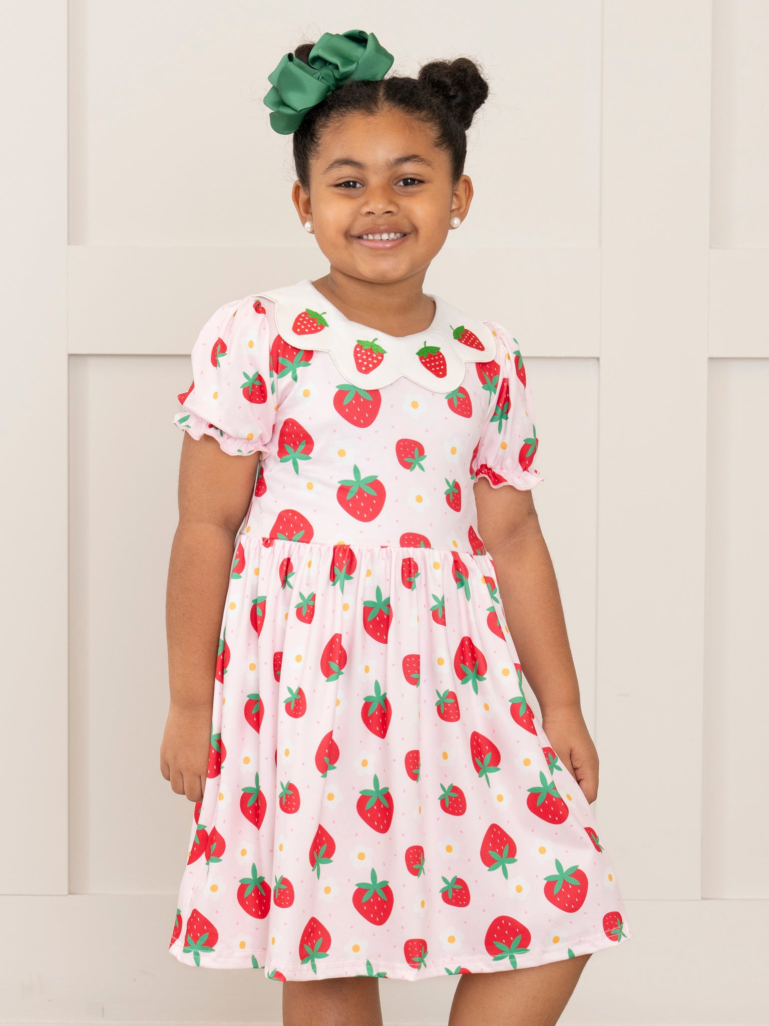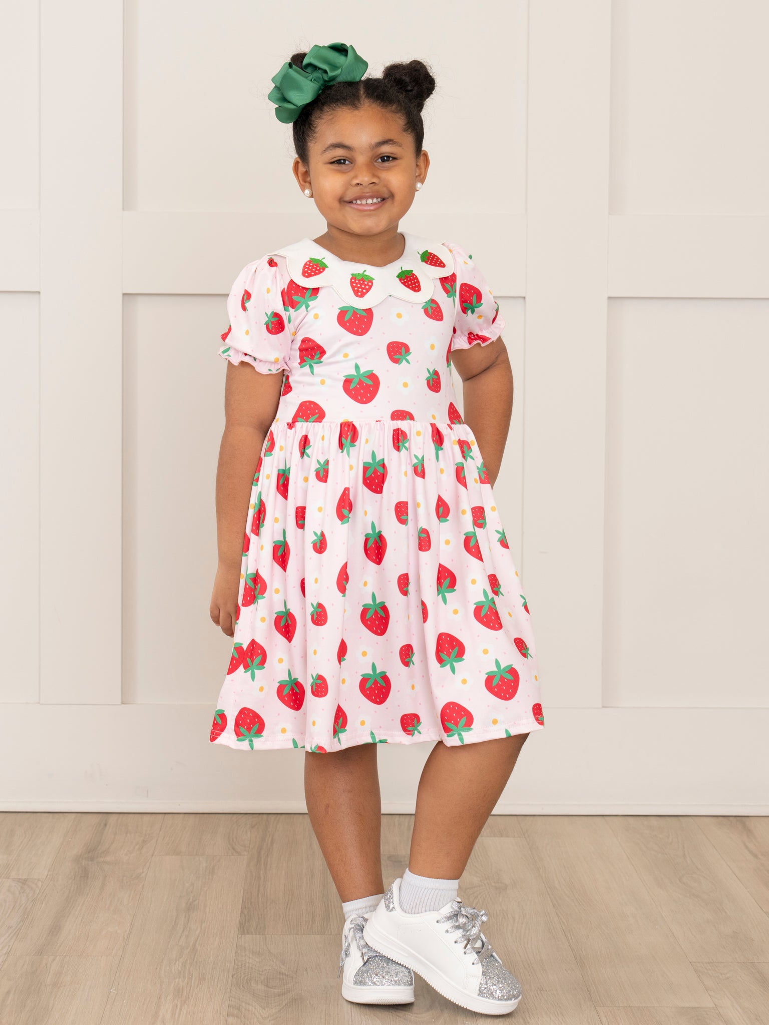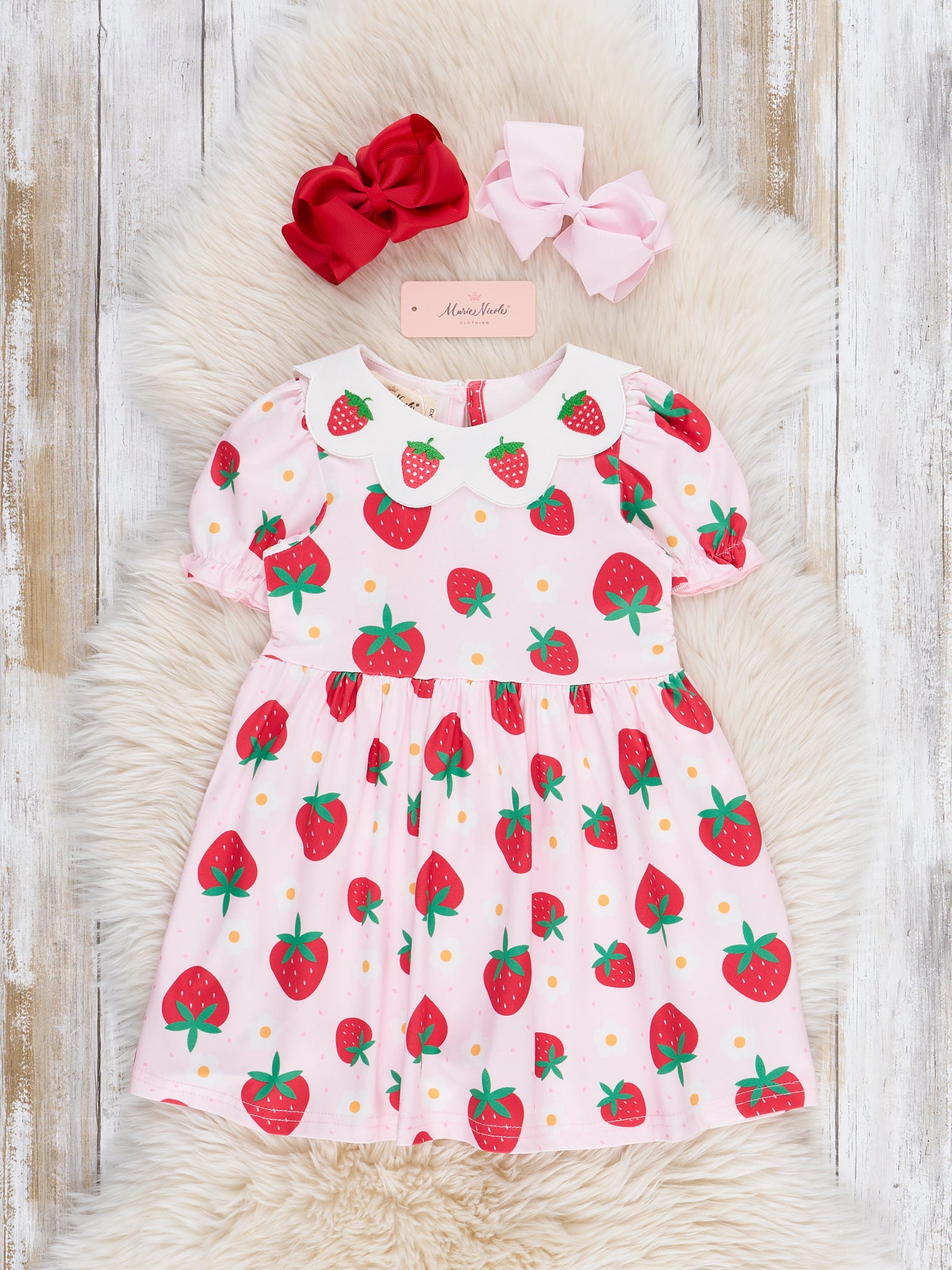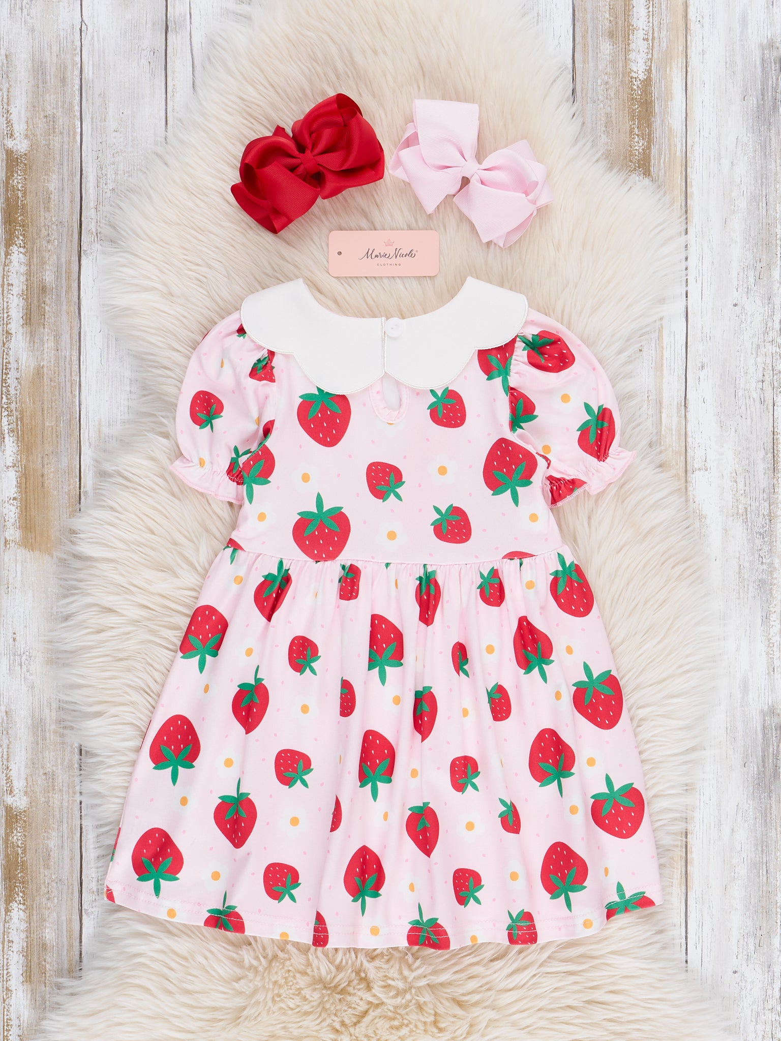 Get your little one festival-ready with our Strawberry Festival Puff Sleeve Dress! This adorable sister set features dress with a playful strawberry print on pink & embroidered strawberries on a petal collar. Boasting the perfect touch of summer charm, this dress is designed by Marie Nicole Clothing.