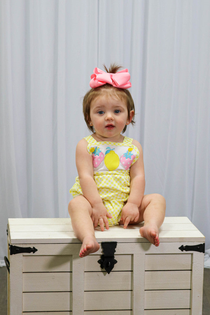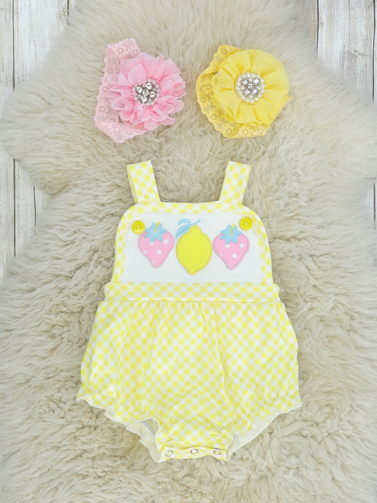 There's nothing better than strawberry lemonade on a hot day! This adorable sister set features strawberries & lemons on a yellow checked print!