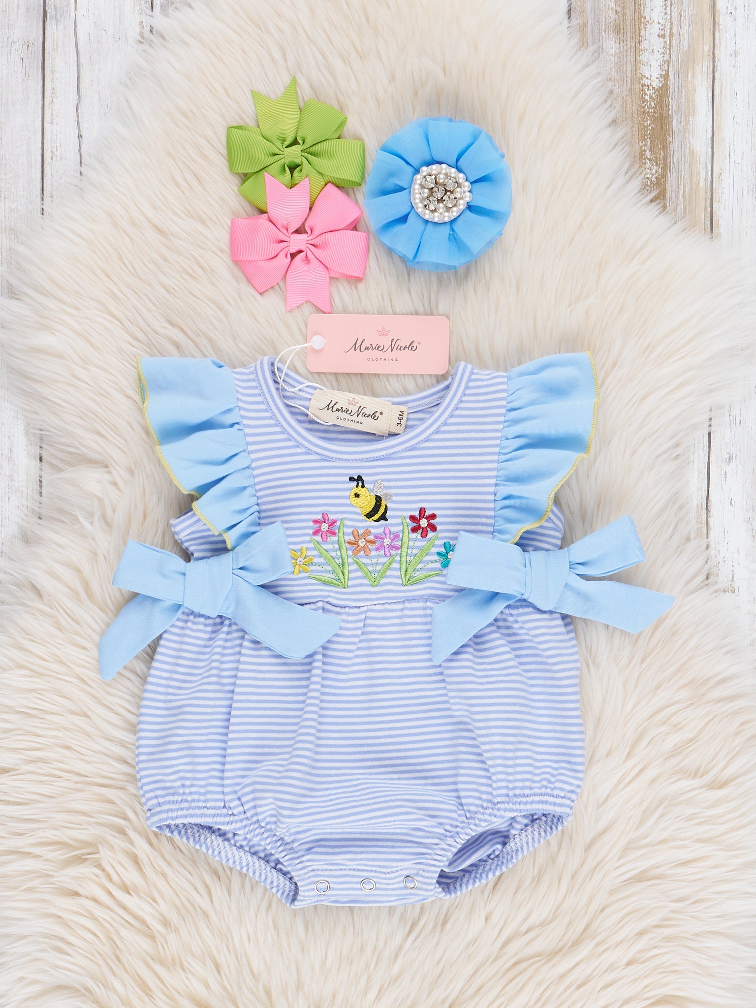 Your little busy bee will love this playful ruffle bubble by Marie Nicole Clothing. The embroidered bee adds a touch of whimsy to the blue striped design, while ruffle sleeves and bows add a charming detail. Perfect for sisters to match!
