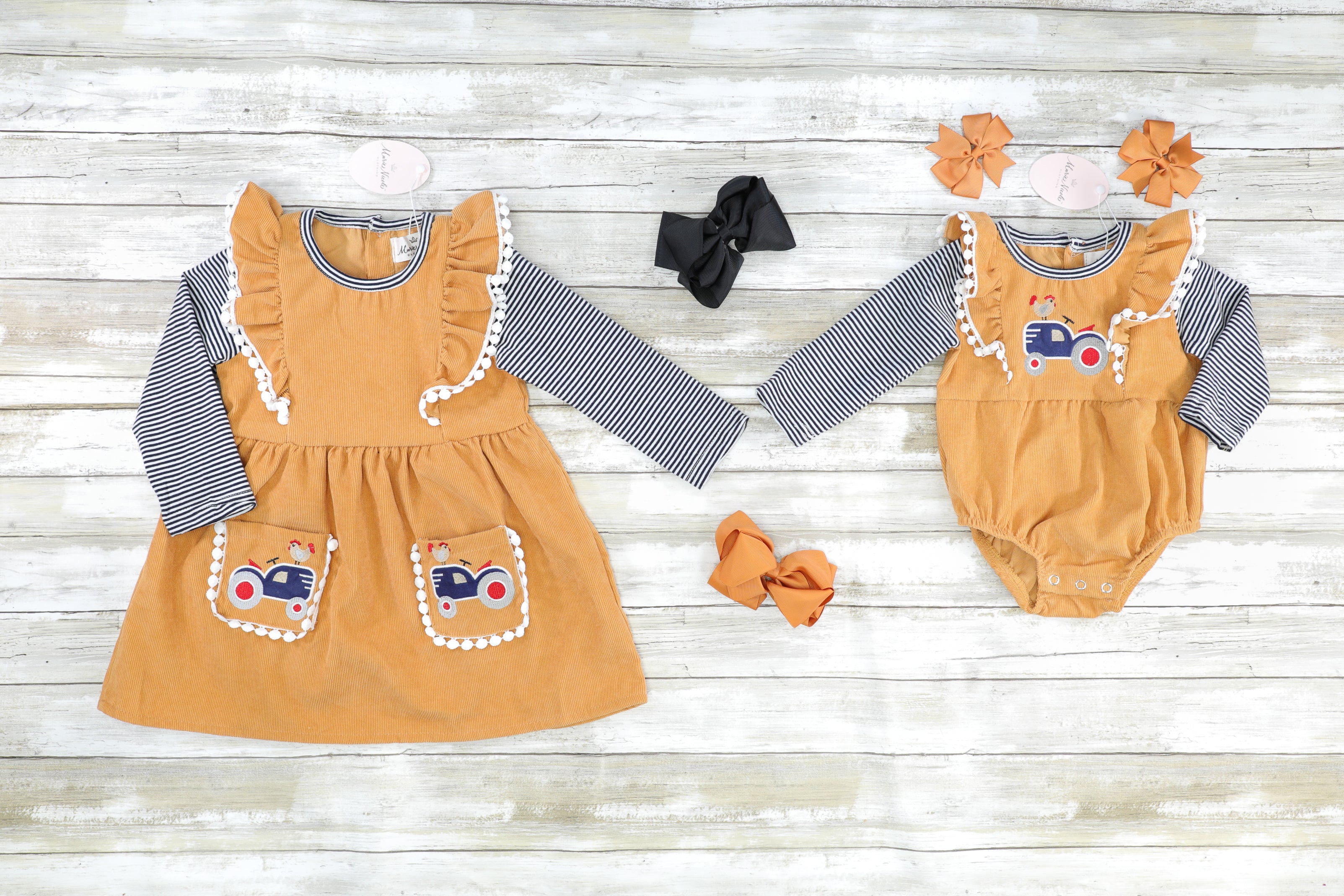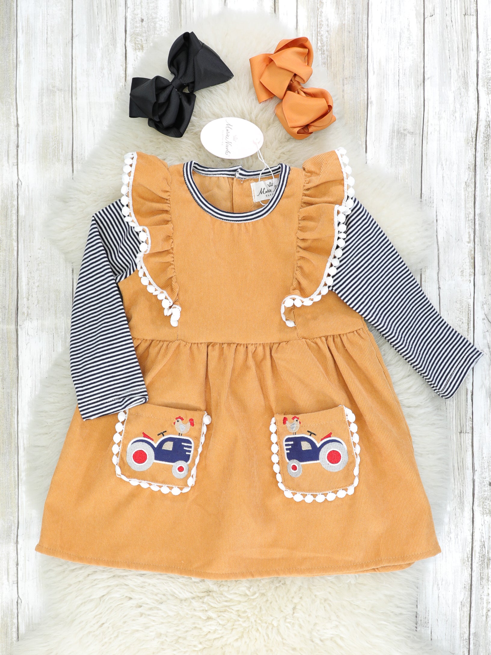 This sibling set has something for all your little chicks! This camel dress features functional pockets, chicken on a tractor appliqués, striped raglan sleeves, flutter trim, & pom pom trim.