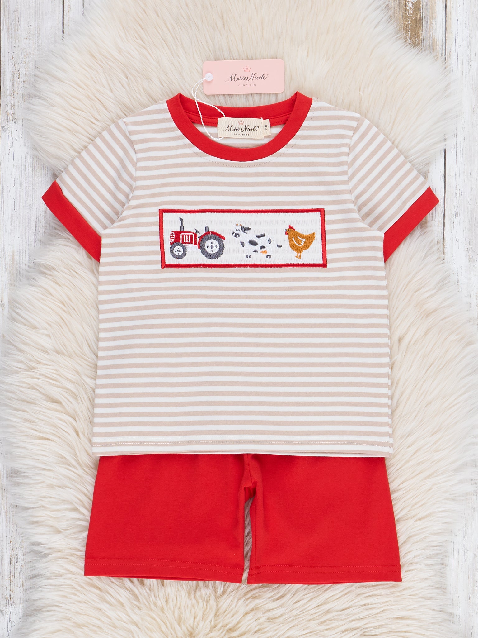 The Farm Friends Smocked Outfit is a fun and charming outfit by Marie Nicole Clothing. Featuring a playful striped pattern with adorable farm embroidery. Perfect for casual outings or everyday play, this outfit combines style, comfort, and a bit of country charm!