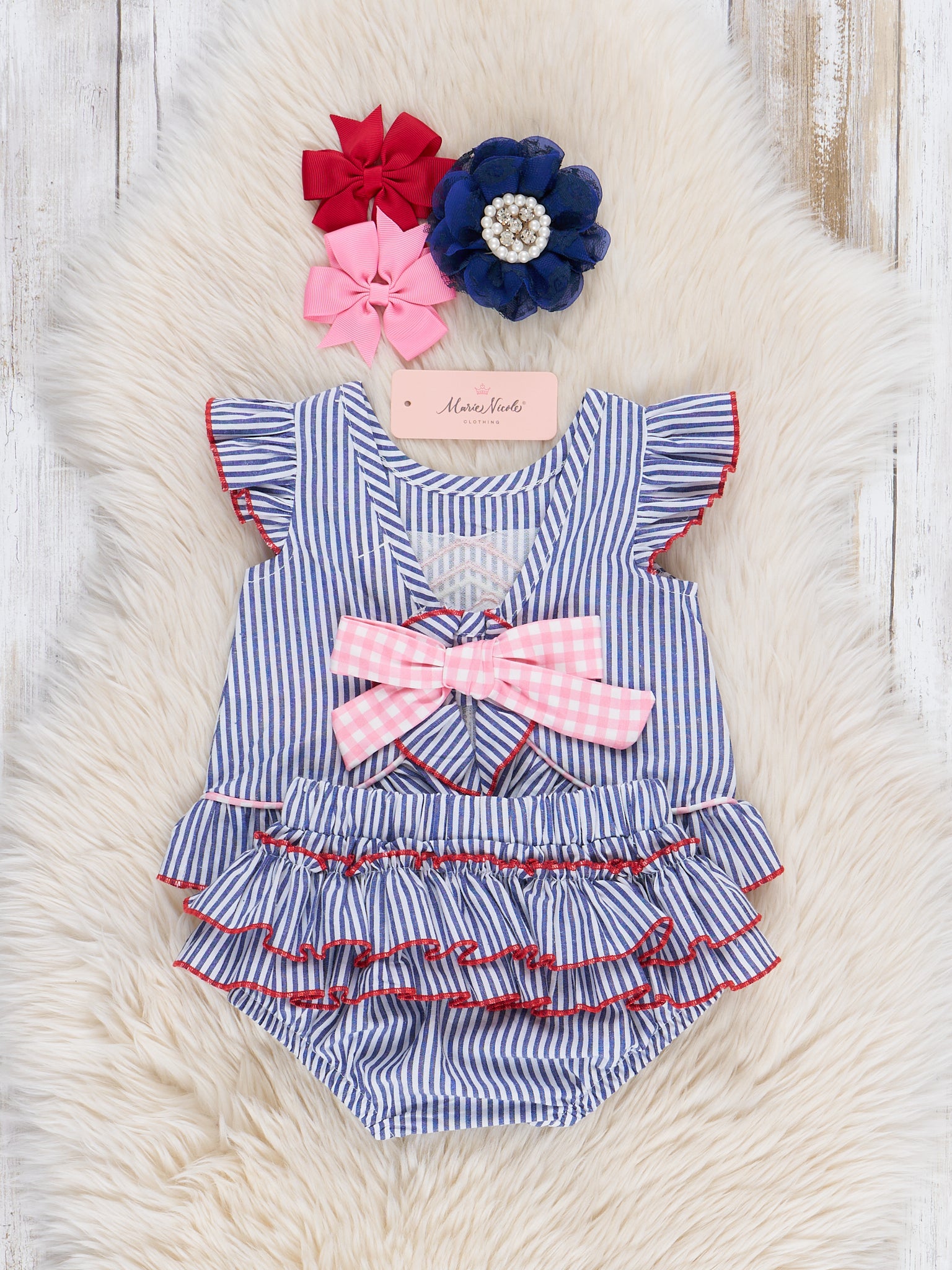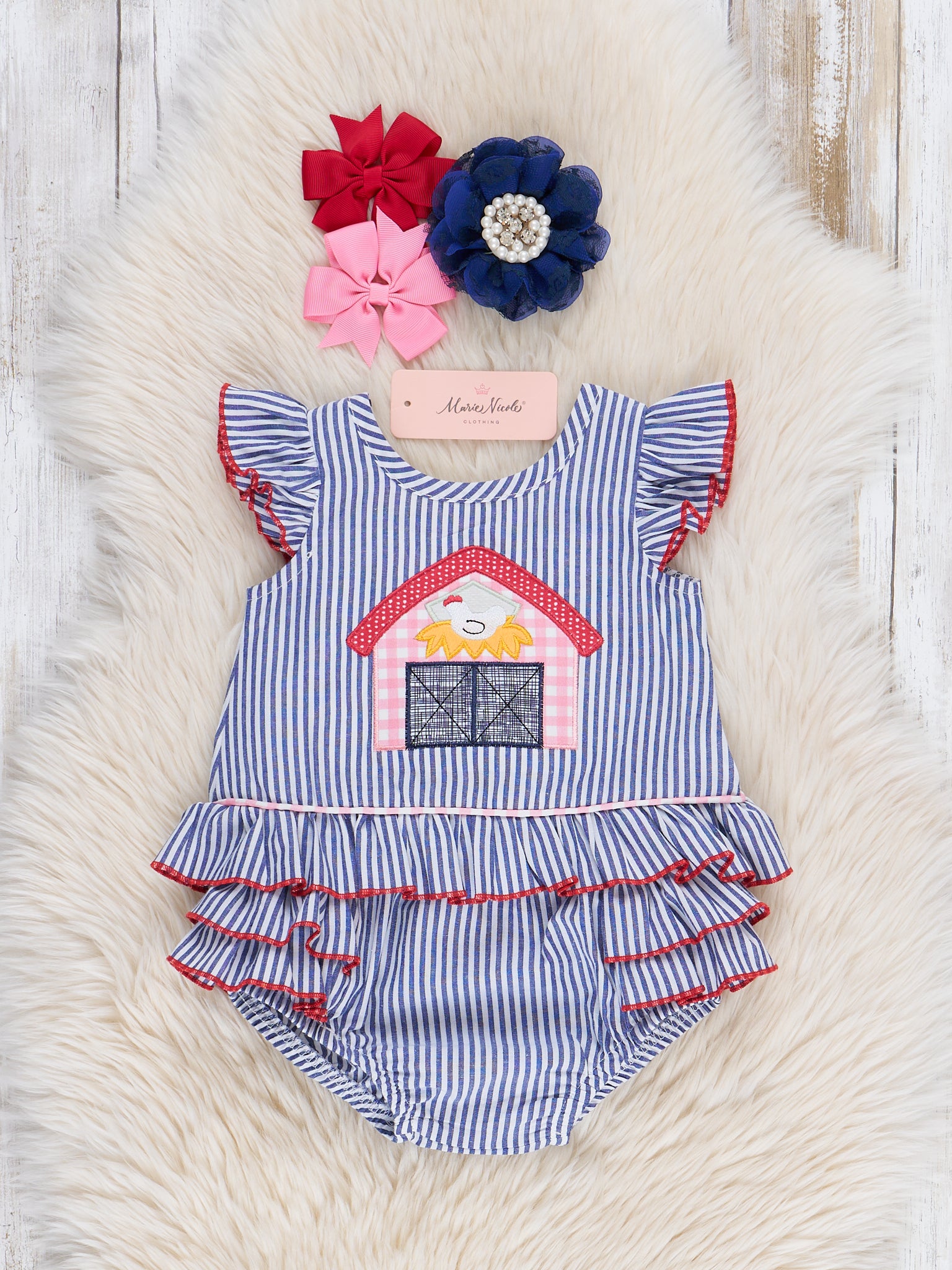Get your little one ready for some fun on the farm with our Striped Embroidered Barn Bloomers Outfit! This adorable set includes navy blue striped top with a red ruffle trim, featuring an embroidered barn design. The matching bloomers with a red ruffle trim on the ruffle bottom make it the perfect addition to this sister set from Marie Nicole Clothing.