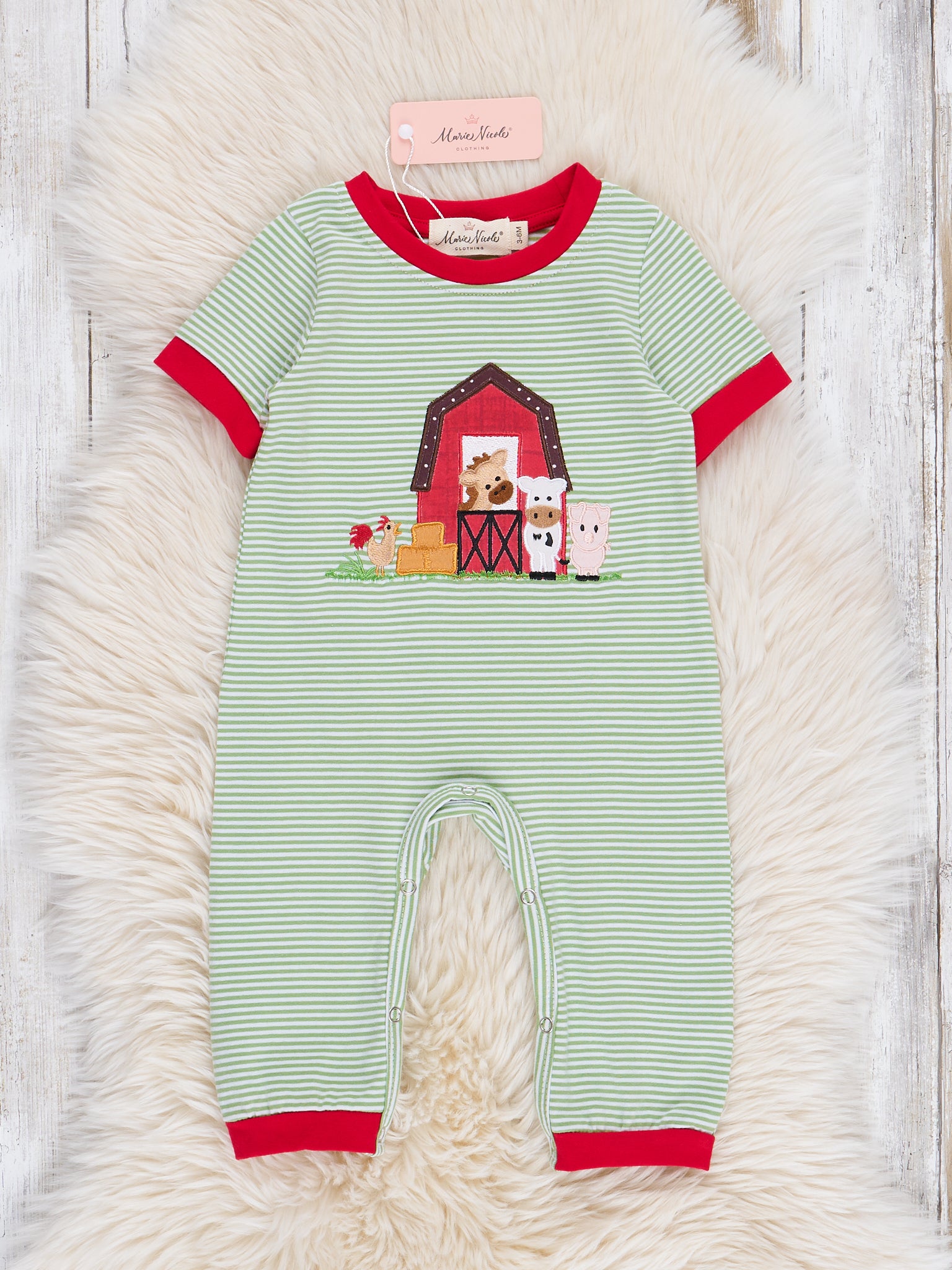 Add a touch of whimsy to your little one's wardrobe with our Striped Embroidered Farmhouse Romper! Featuring a charming green striped bodice with red trim and adorable embroidered farmhouse and farm friends, this romper is perfect for playdates and beyond. Mix and match with our sibling set for even more fun. From Marie Nicole Clothing.