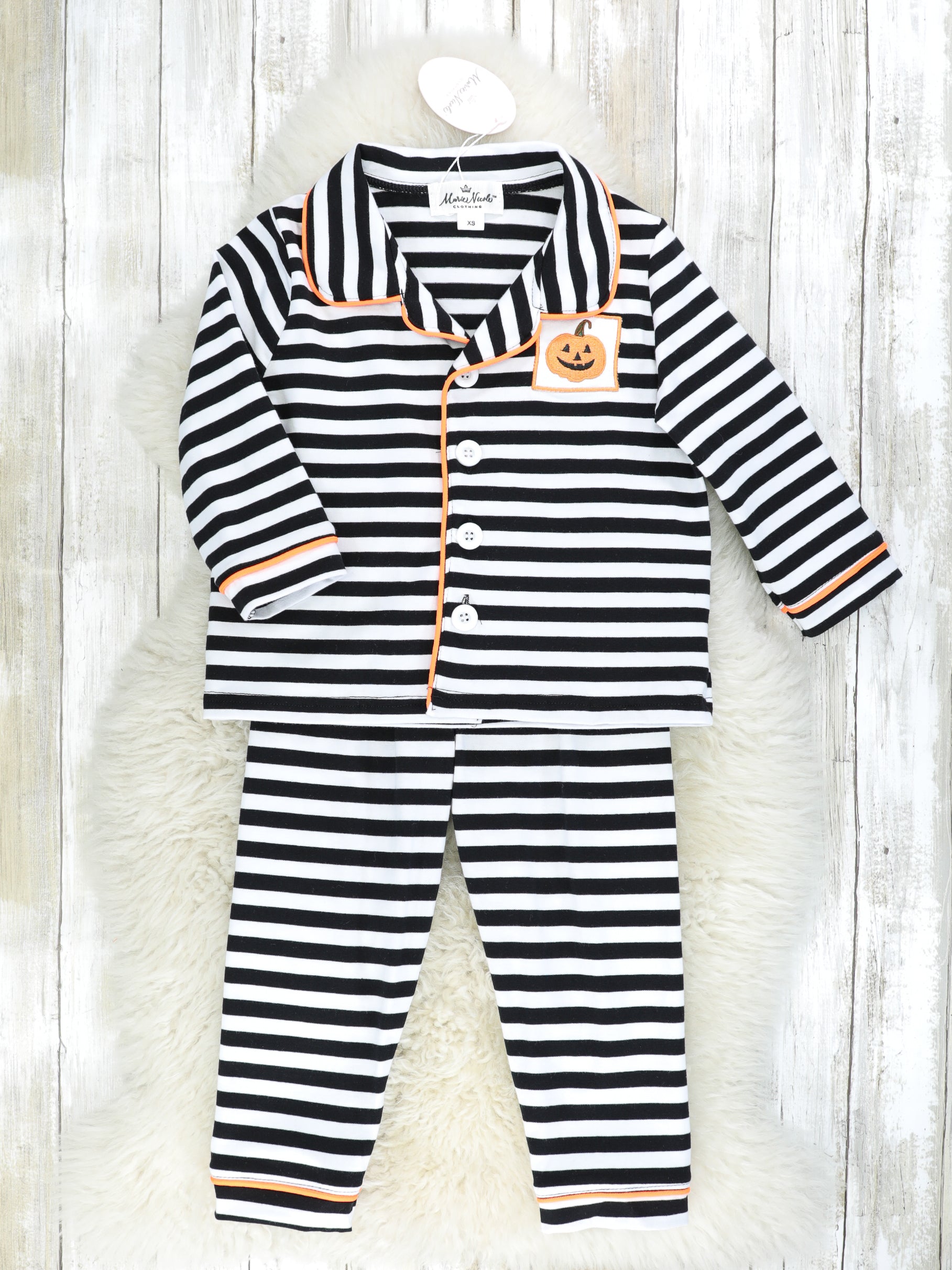 The spookiest sibling set for all the kiddos to snuggle up! These striped pajamas feature an embroidered jack-o-lantern, functioning buttons, & an elastic waistband.
