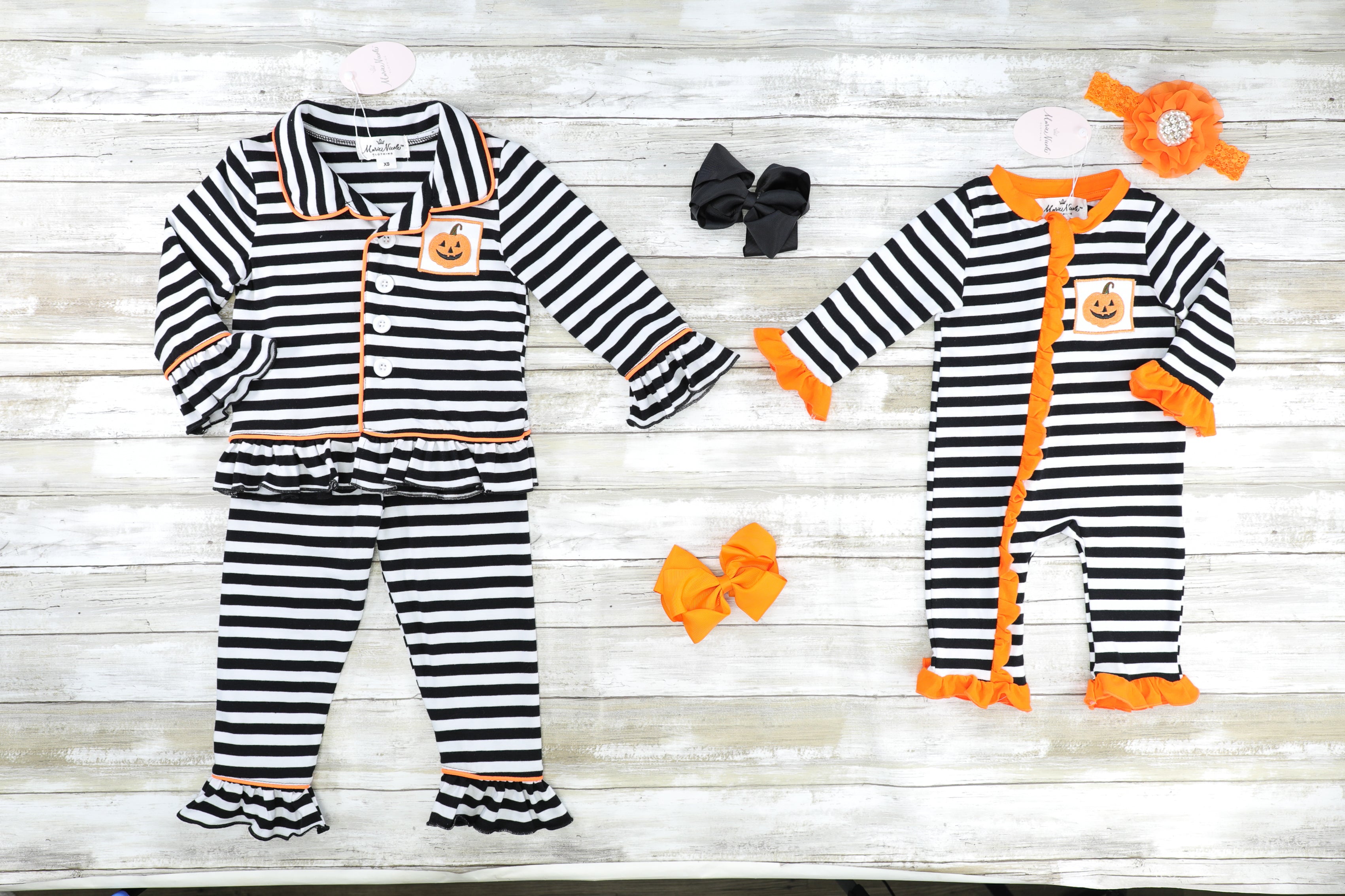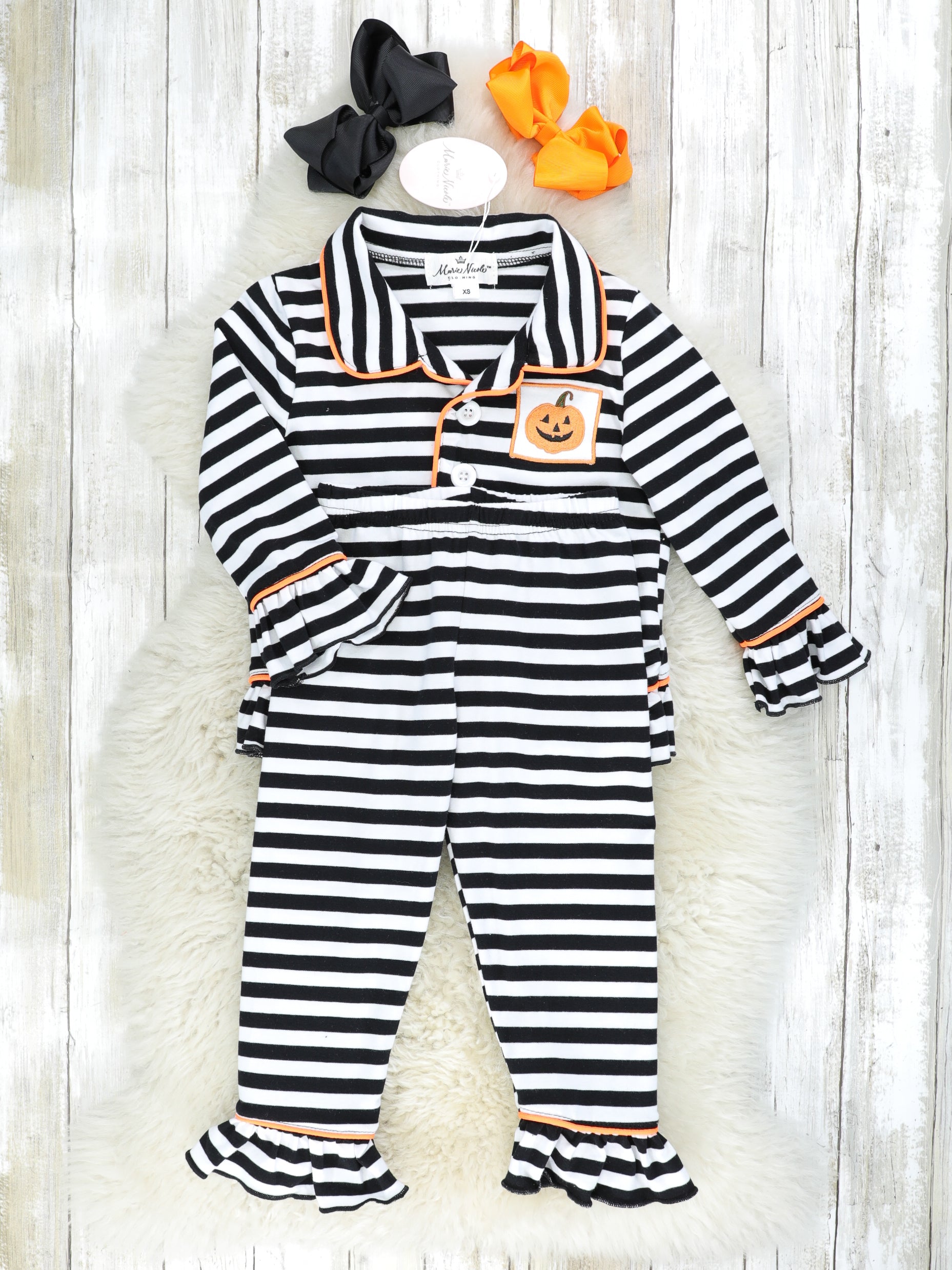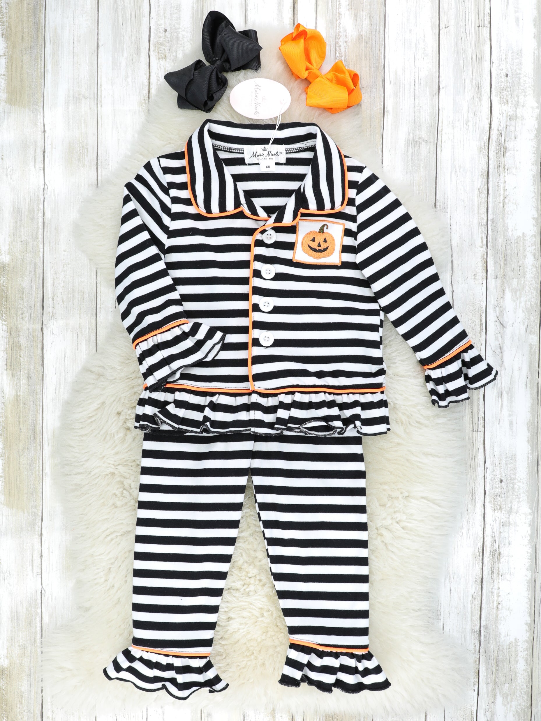 The spookiest sibling set for all the kiddos to snuggle up! These striped pajamas feature an embroidered jack-o-lantern, functioning buttons, ruffle trim details, & an elastic waistband.