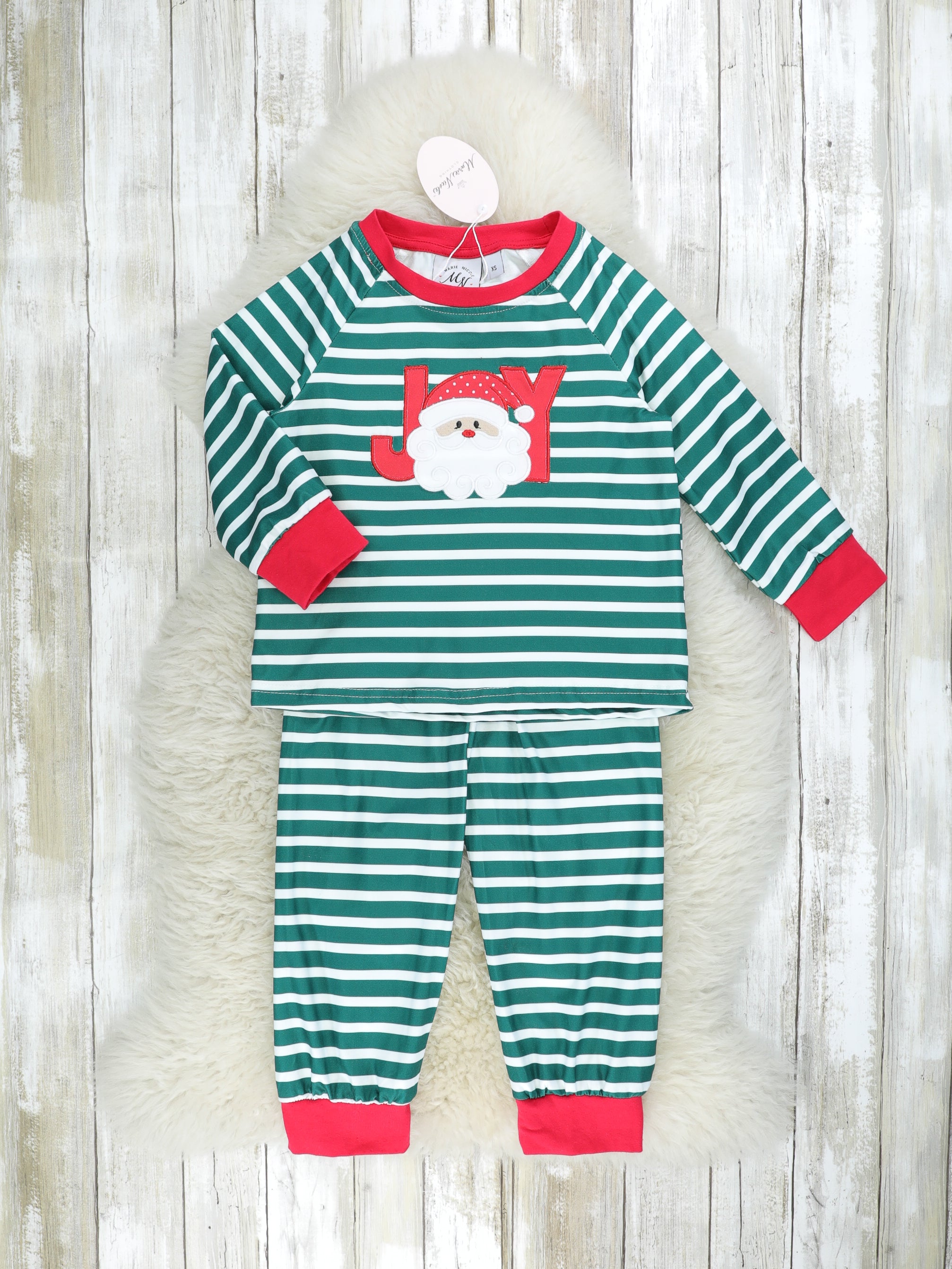 Bring joy to your little ones with this jolly sibling set! These pajamas feature stripes, red trim, & a darling "joy" appliqué.