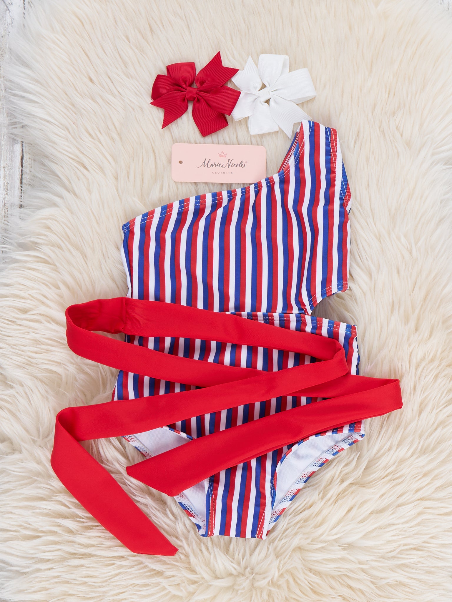 The Striped One-Shoulder Swimsuit by Marie Nicole Clothing combines playful style with a modern boutique silhouette. The one-shoulder design creates a chic look, while the bold striped pattern adds festive flair. A statement waist bow completes the charming design, and the soft, stretchy fabric ensures comfort for swimming, beach outings, and sunny celebrations.