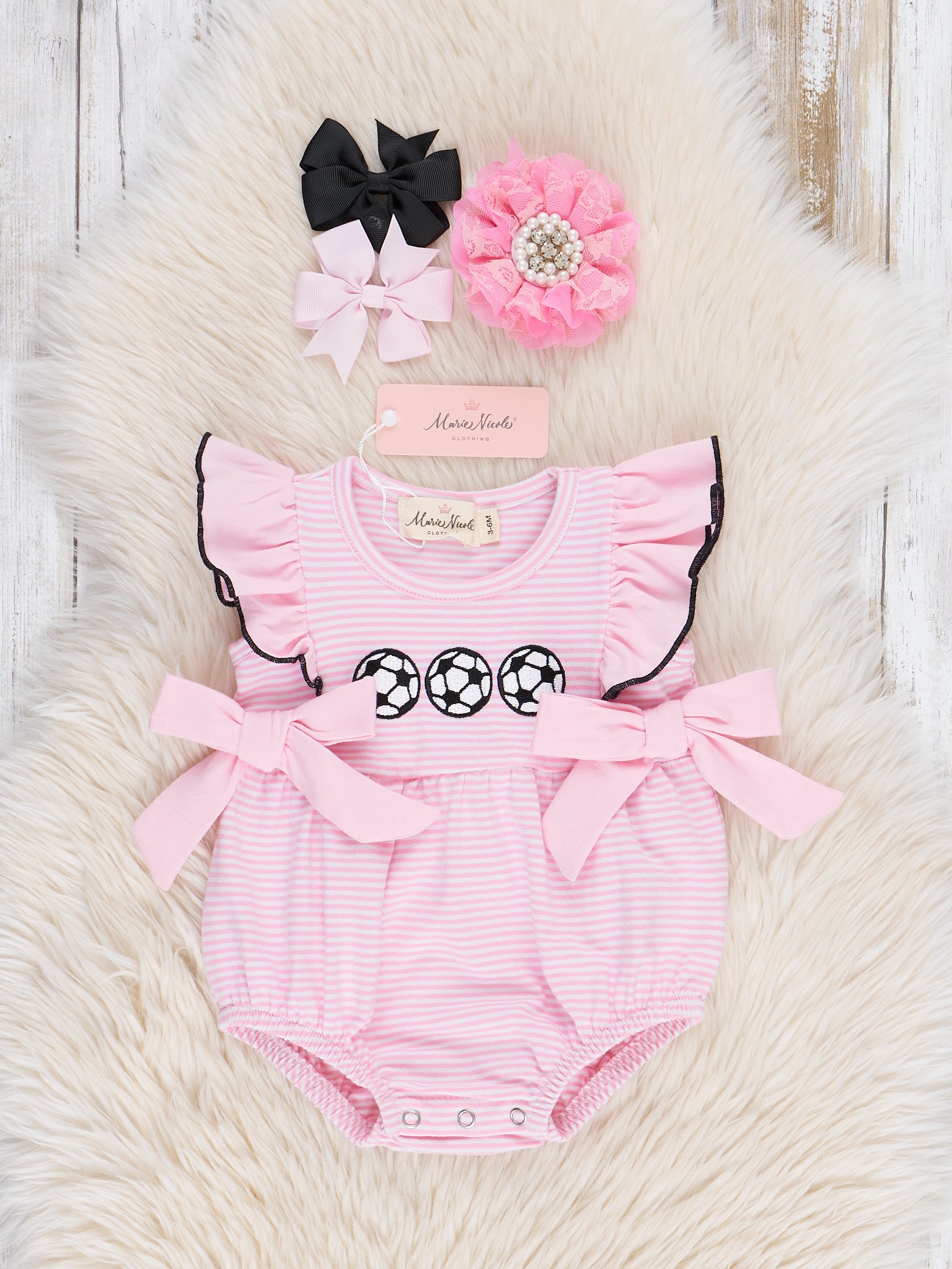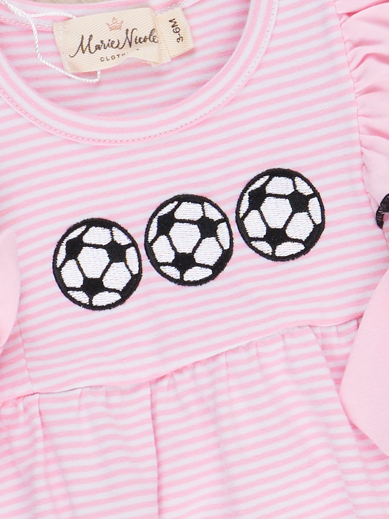 Score a winning look with this embroidered soccer bubble from Marie Nicole Clothing! Featuring playful pink stripes, flutter sleeves, and a cute bow detail, this bubble is perfect for your budding soccer star. Matching sister set also available. GOOOOAAAALLL!!!