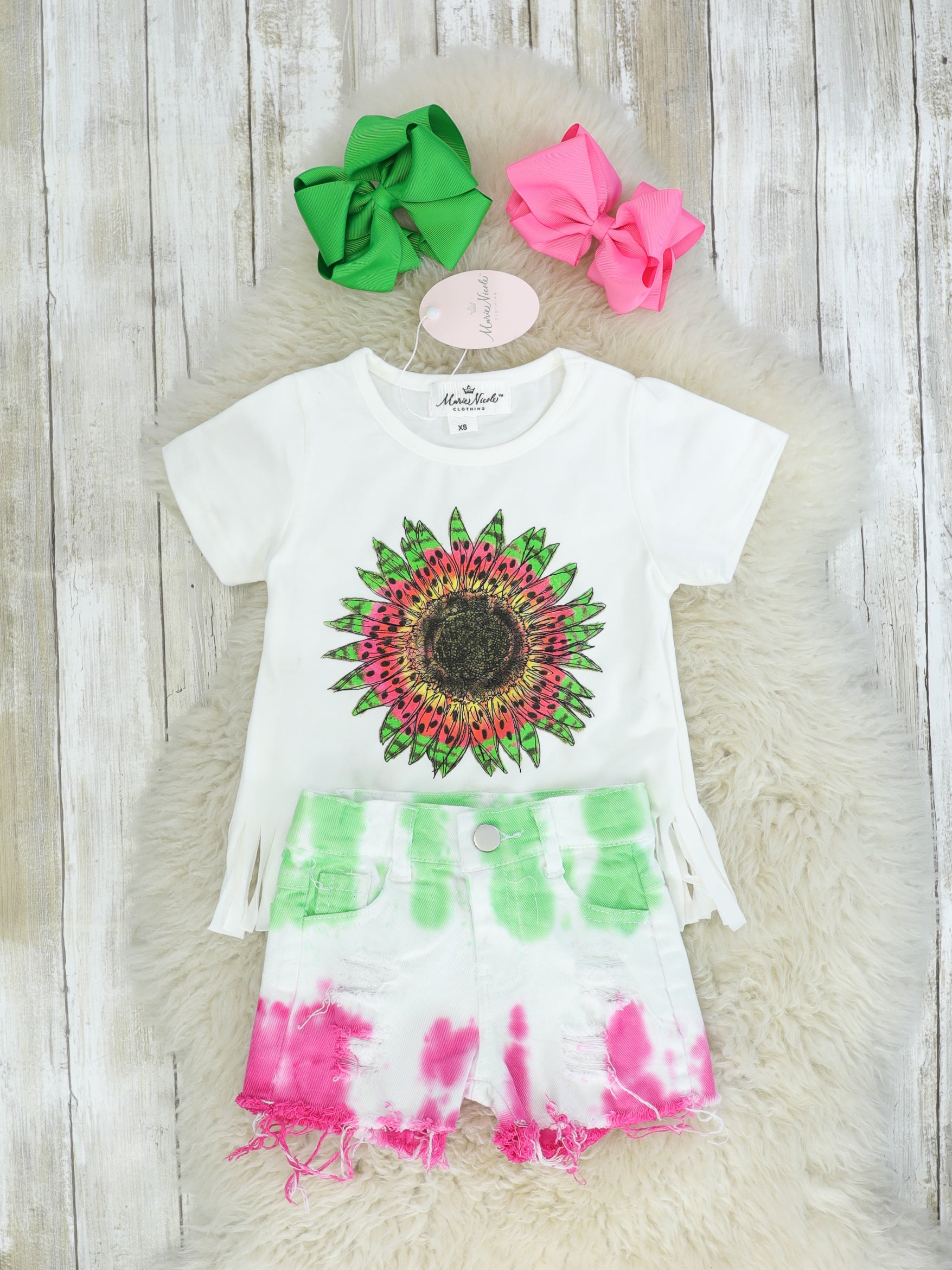 This cool fringe tie-dye outfit is taking us back to the 70's & we're loving it! The sunflower top & bright ombré shorts are too cute!