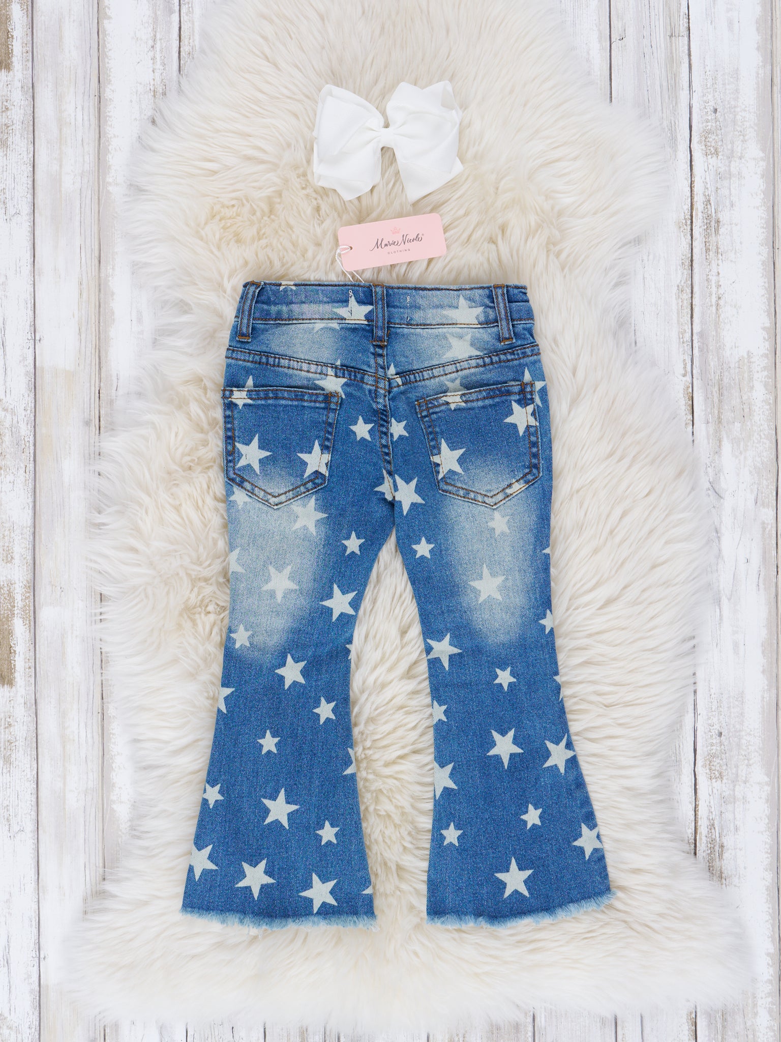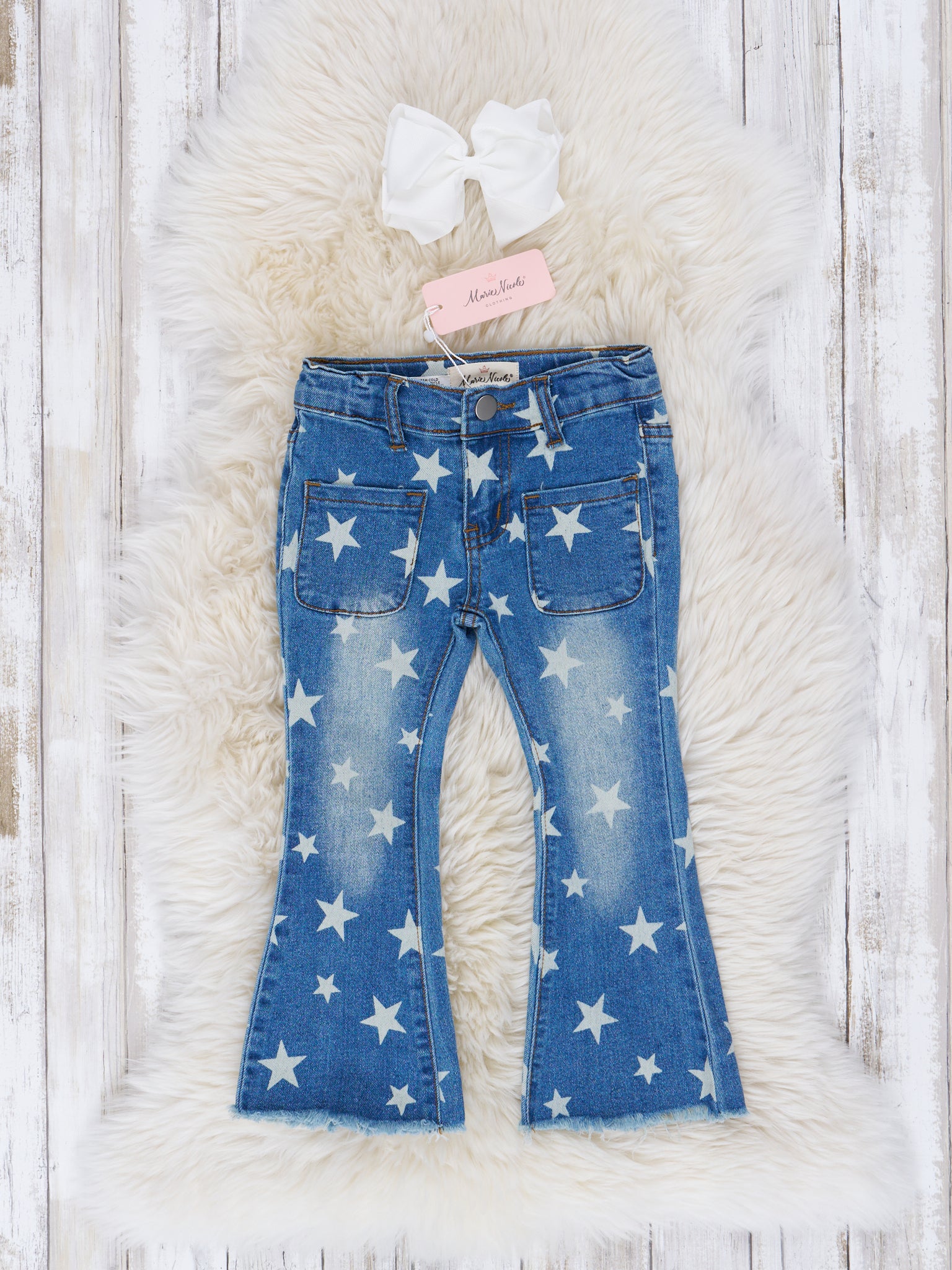 Calling all the denim lovers! These dark wash flare-leg jeans feature a star design, frayed hem, pockets on the front, and an elastic waistband for comfort.