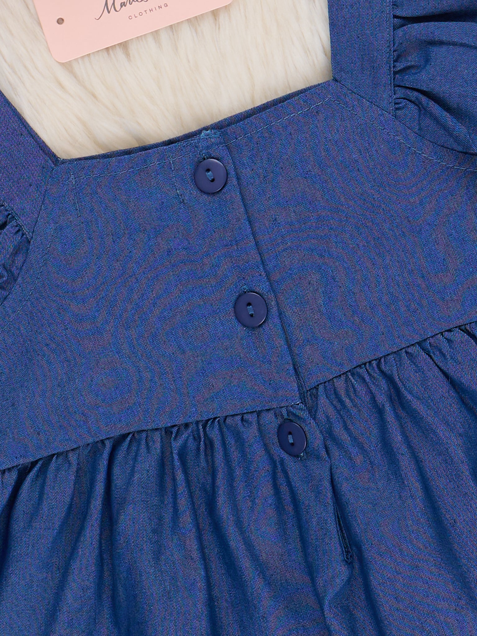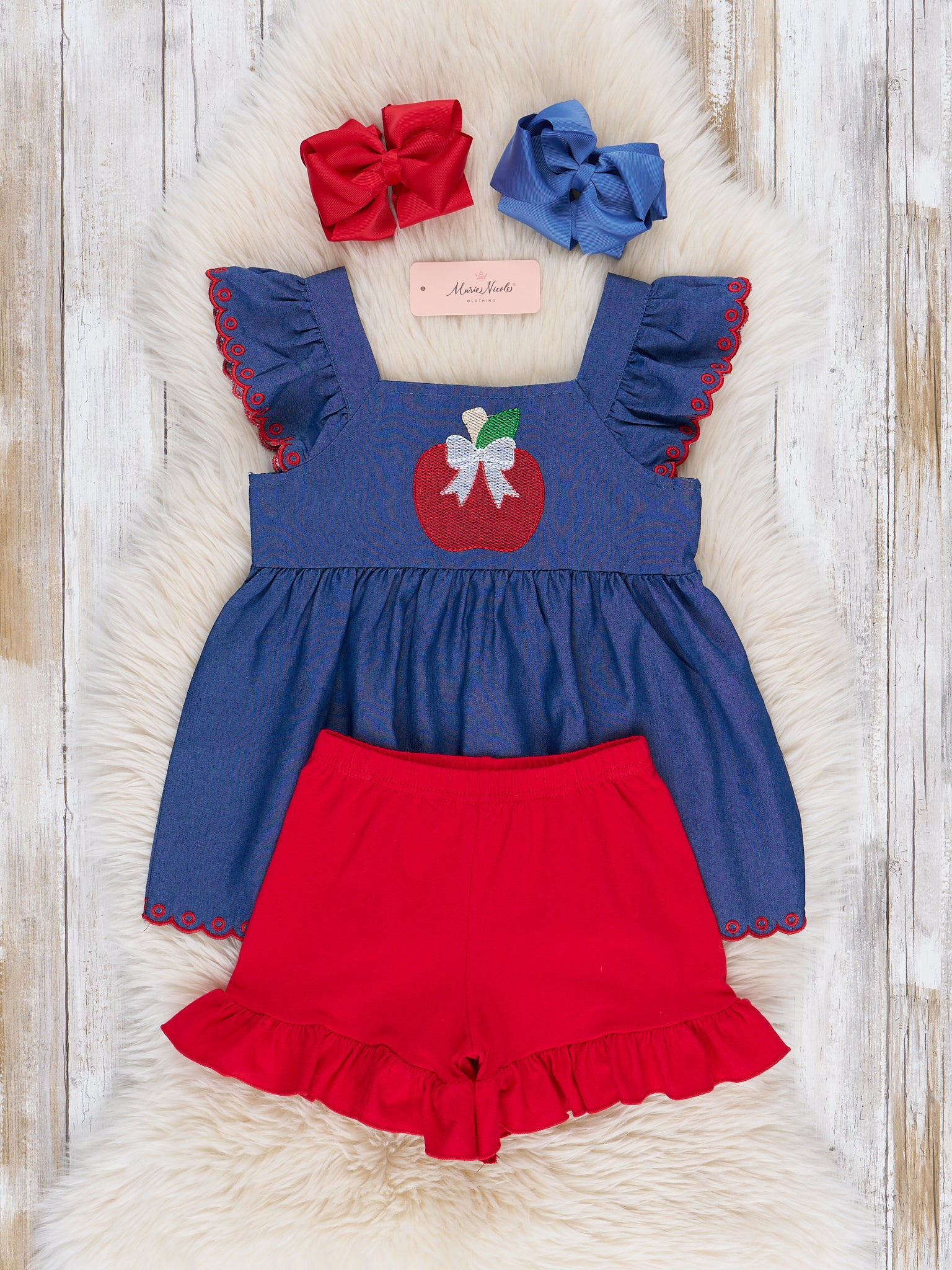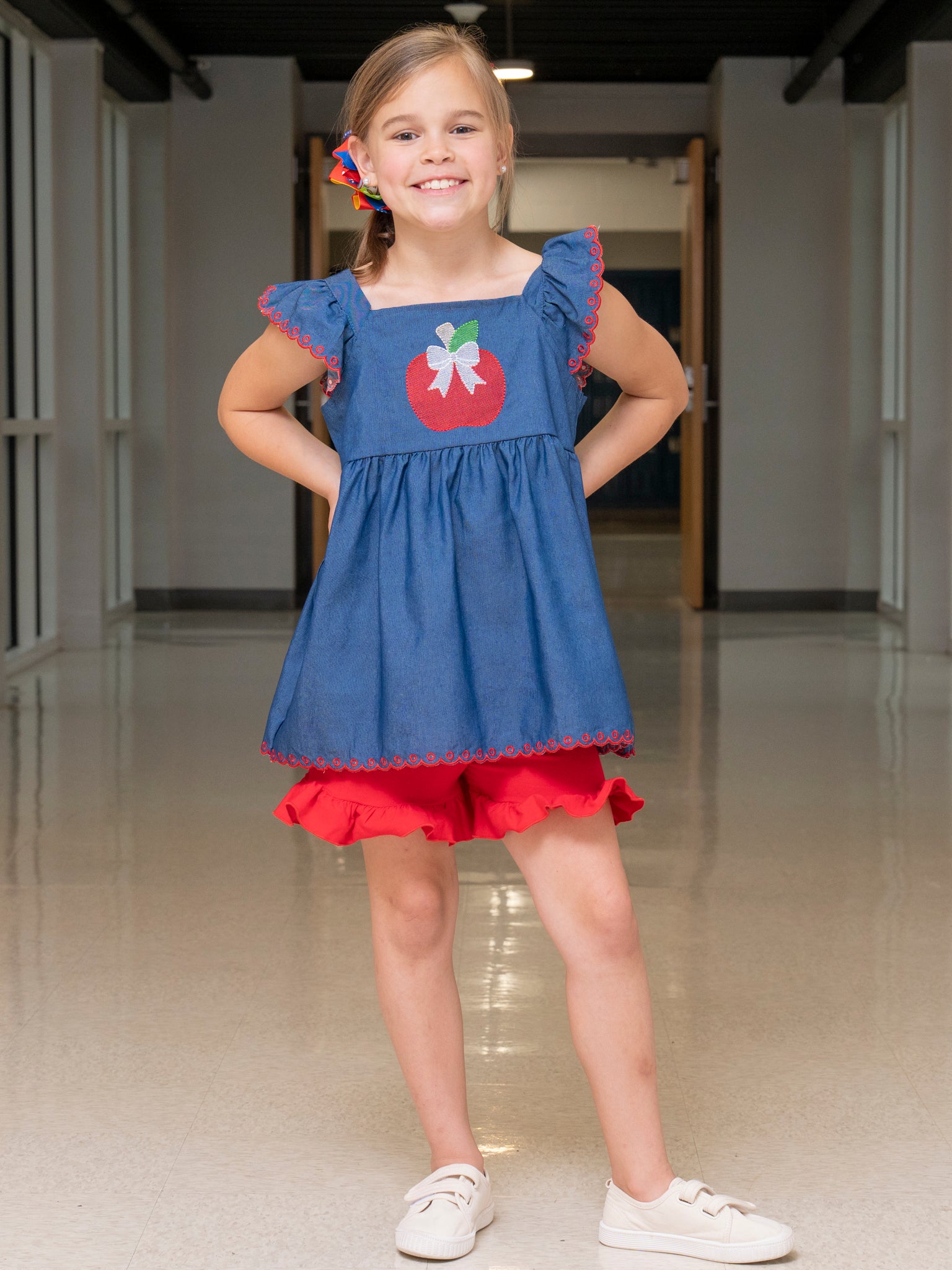 The Sweet Apple Chambray Ruffle Outfit is a charming and timeless choice perfect for back-to-school days and casual outings. Featuring a soft chambray fabric adorned with delicate apple embroidery and finished with gentle ruffle details, this outfit from Marie Nicole Clothing blends classic style with everyday comfort. Lightweight and breathable, it’s ideal for playdates, family gatherings, or any day she wants to look effortlessly sweet.