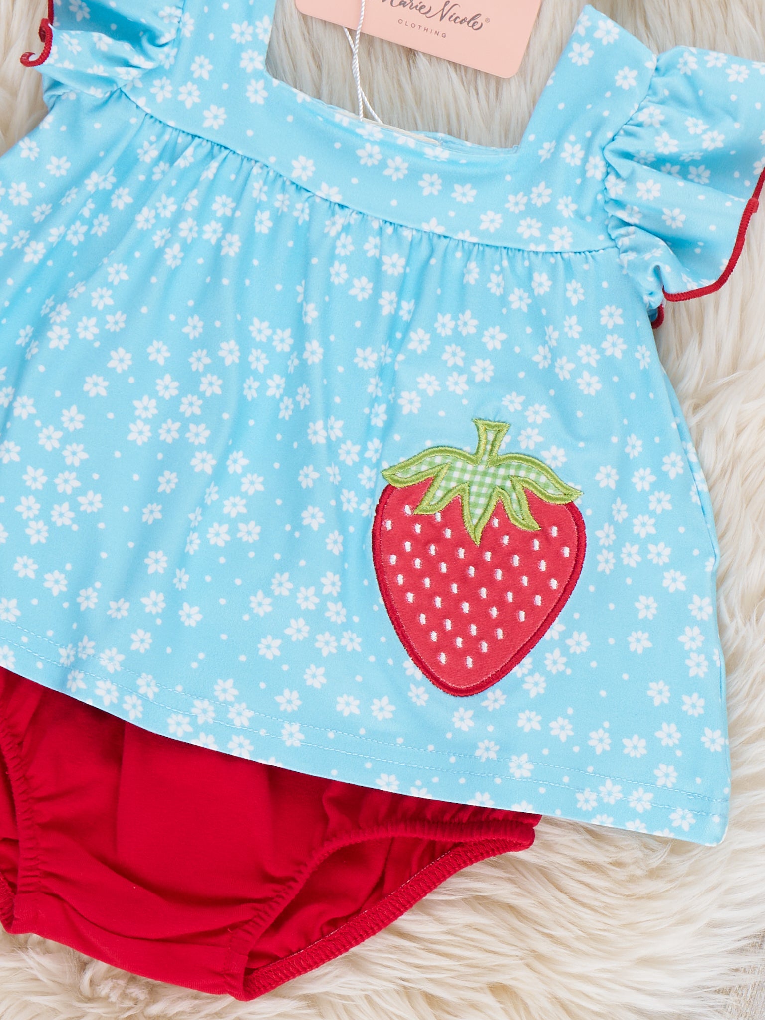 The Sweet Strawberry Sky Embroidered Ruffle Bloomers Outfit by Marie Nicole Clothing floats with sunny-day charm, featuring flutter sleeves and a dainty strawberry applique on a breezy, swingy top attached to a comfy bubble bottom. Soft fabric, elastic leg openings, and easy snaps make this one-piece perfect for warm-weather play, picnics, and picture-ready moments.