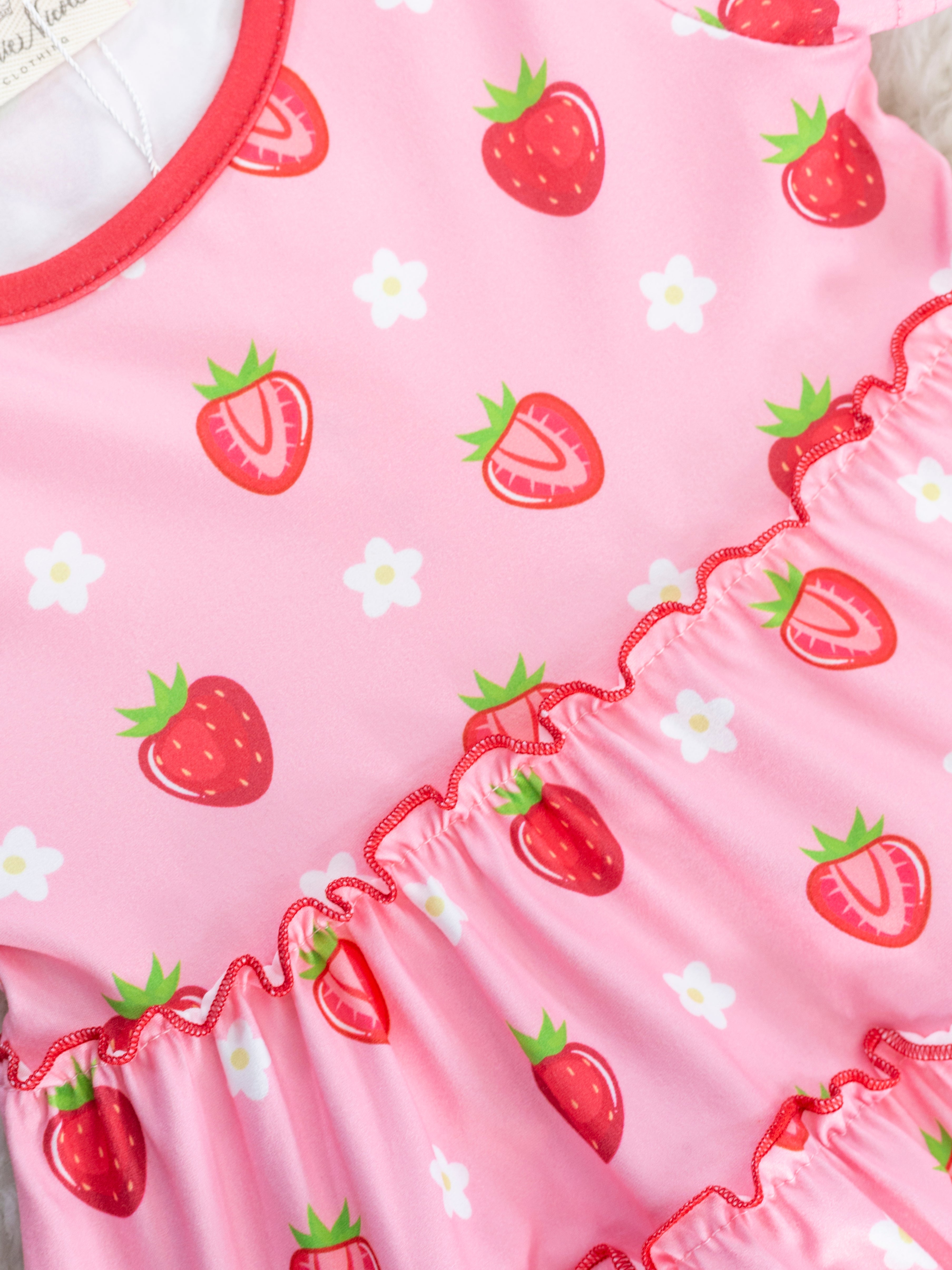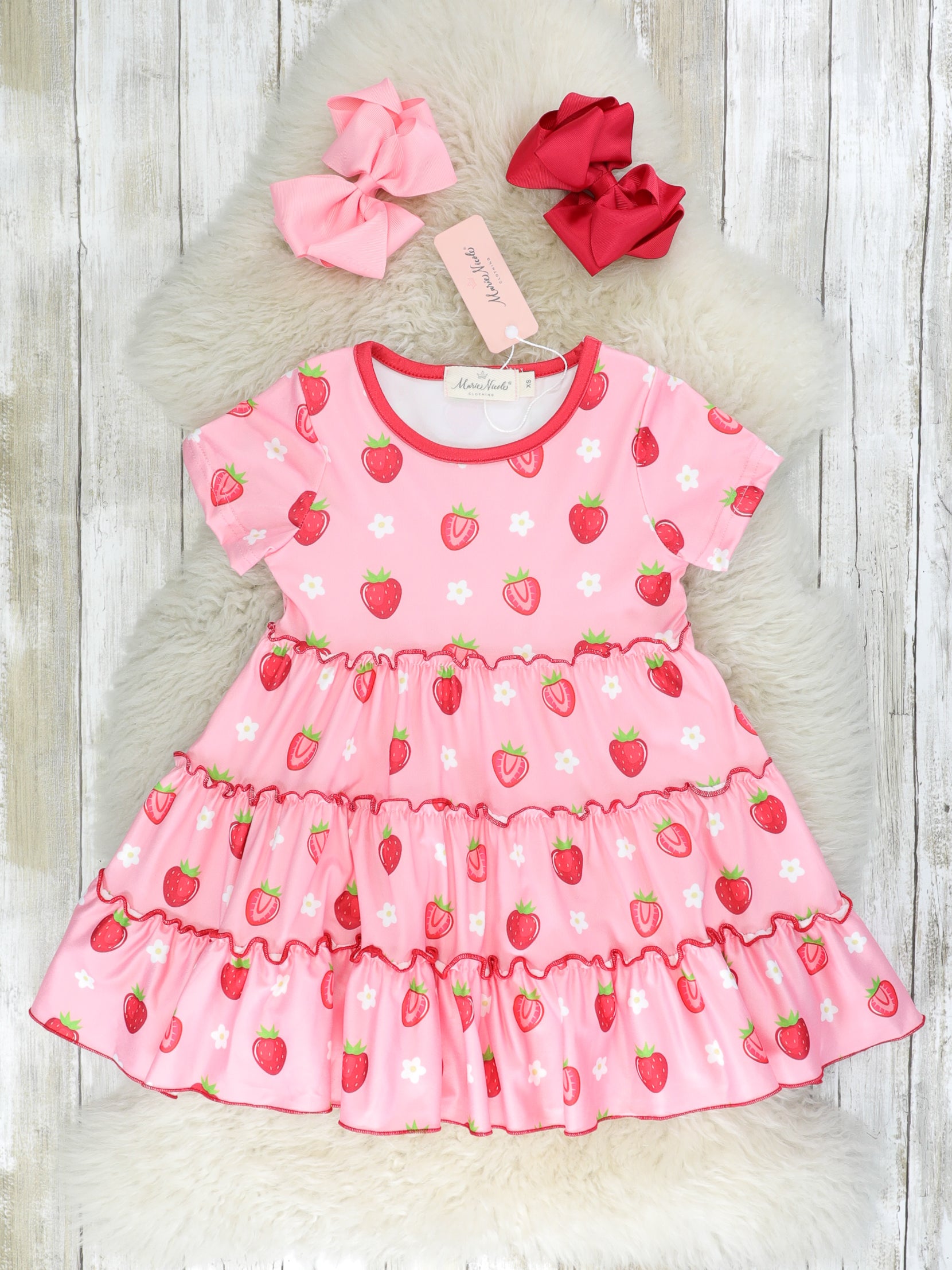 This stunning dress is so berry sweet! This taffy pink dress features strawberries, flowers, & ruffle trim.