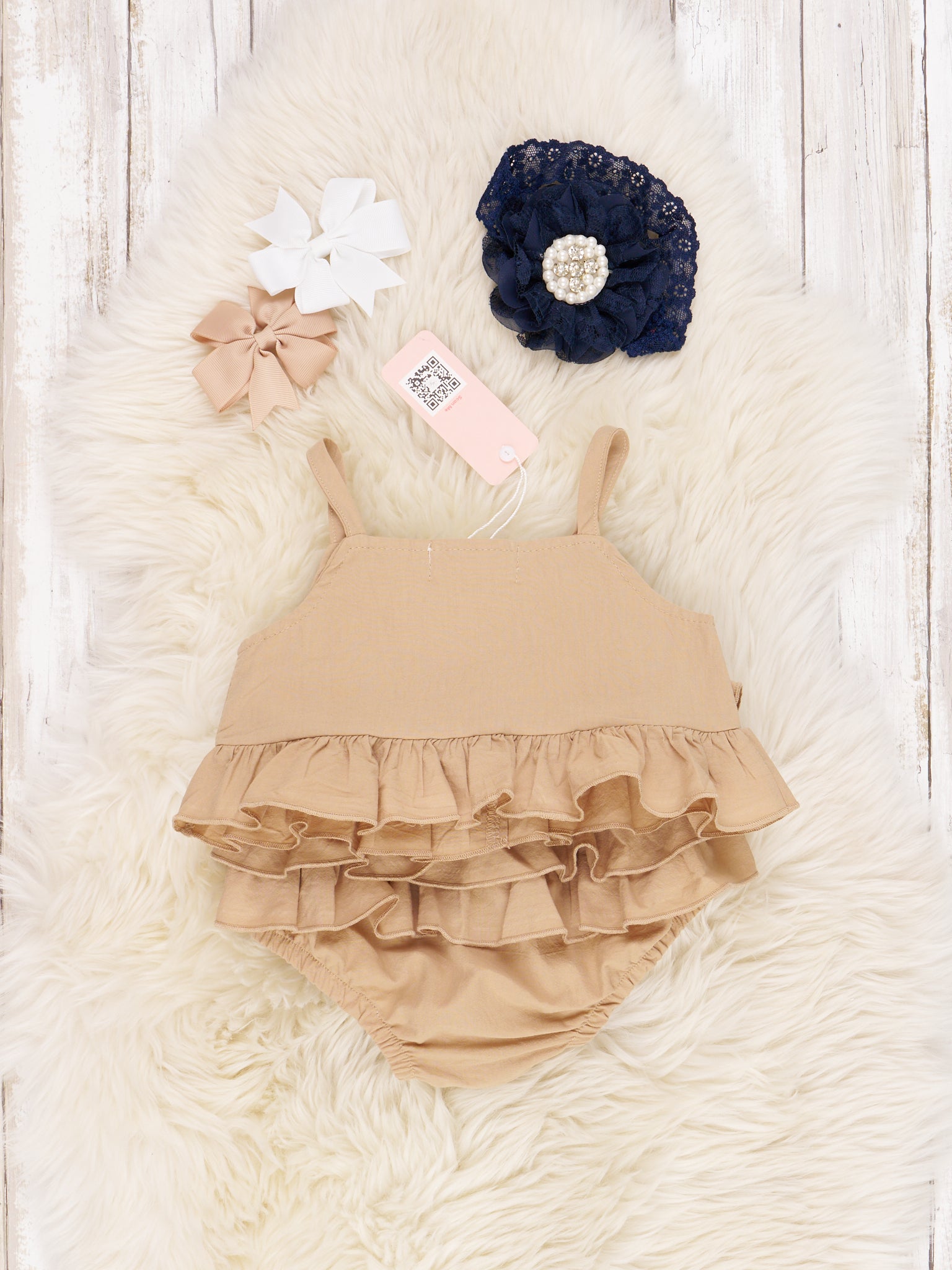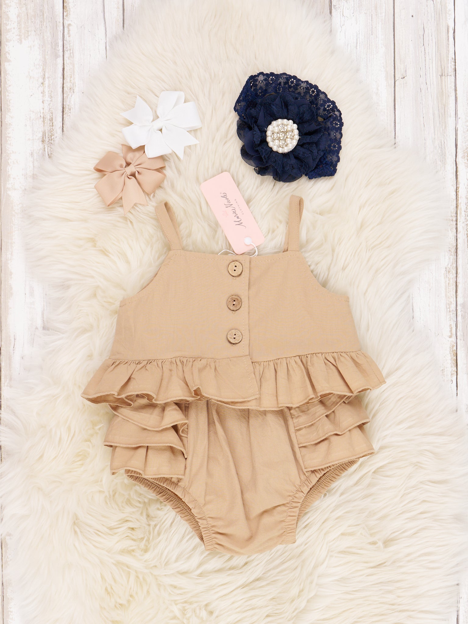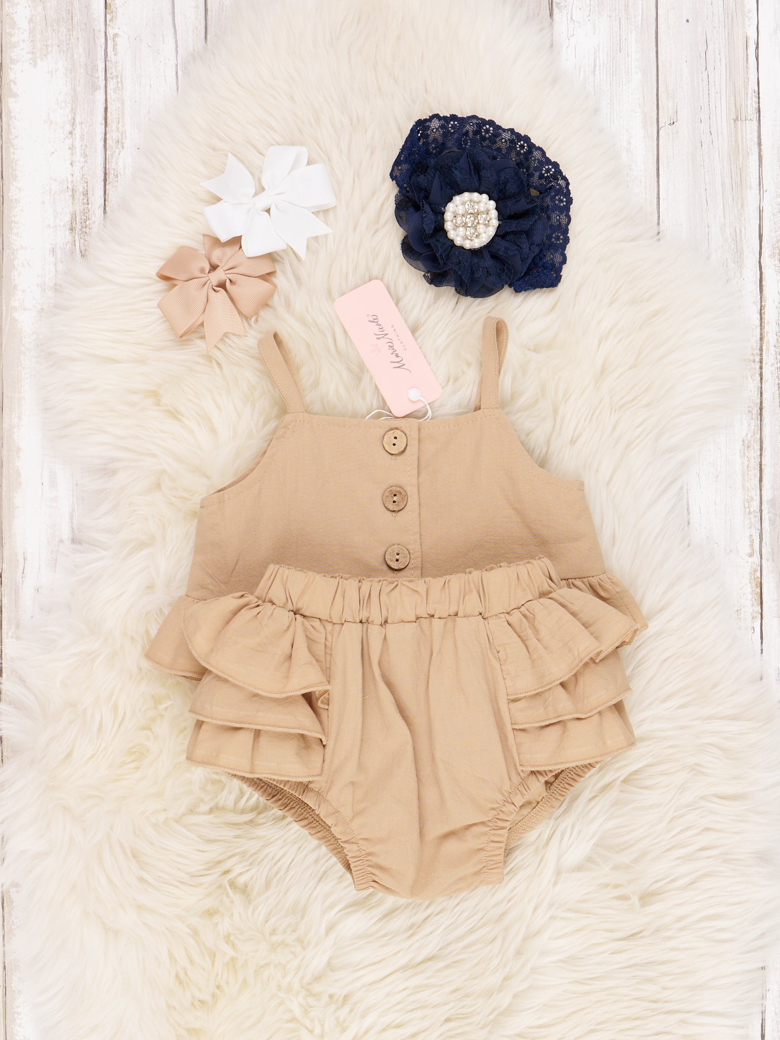 This Tan Paper Bag Ruffle Bloomers Outfit is simply adorbs! With classic ruffles, wooden buttons, and an elastic waistband, your little one will feel comfy and look oh-so-cute! So ruffle some feathers and make your kid the chicest in the bunch!