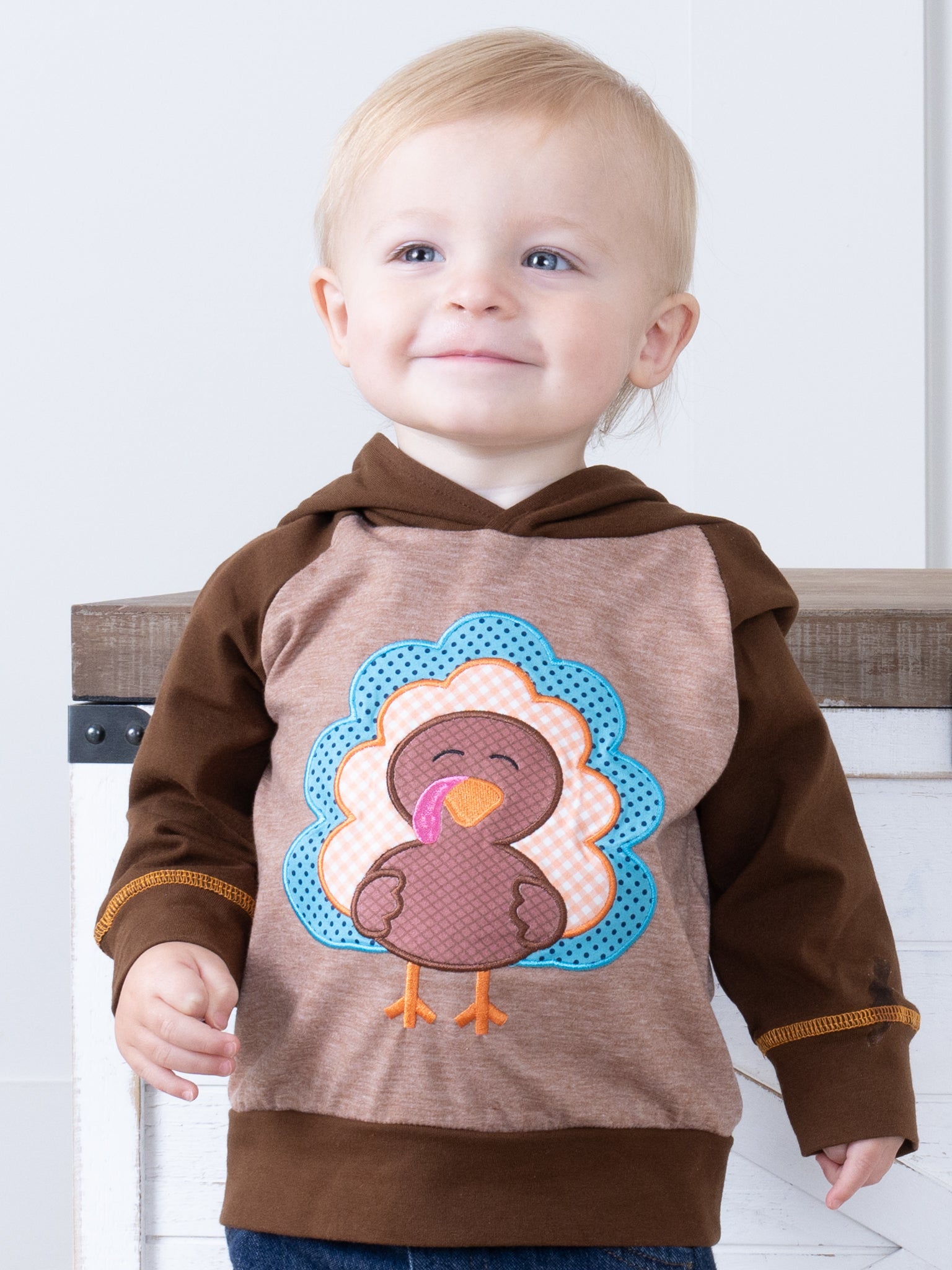 Give your kids the cutest Thanksgiving attire with the Tan Turkey Time Raglan Hoodie! This hoodie is a must-have for your little gobblers, featuring an embroidered turkey detail and raglan sleeves! So why wait? Get your turkey time on with this sibling set!