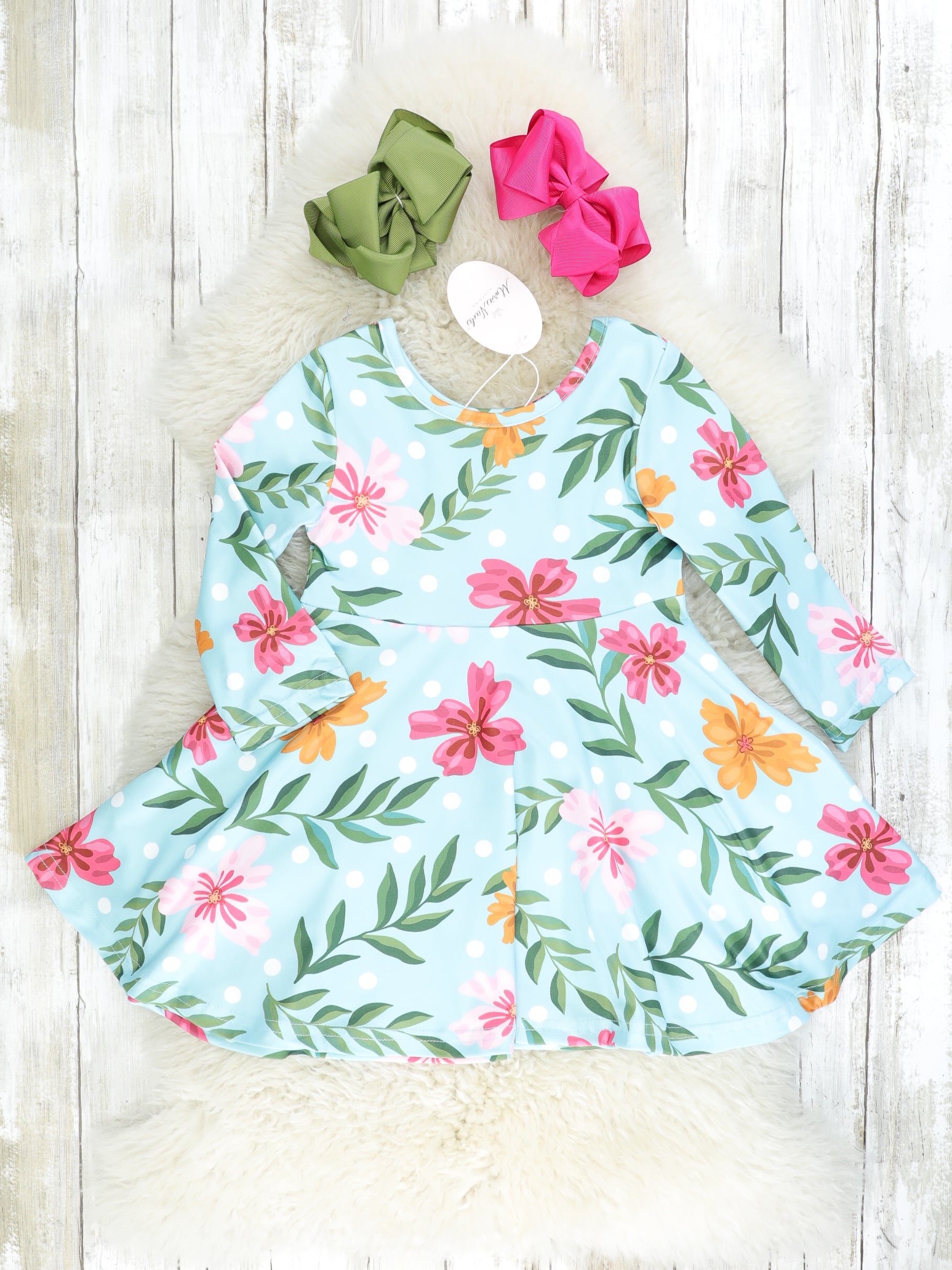 The sweetest florals for your fabulous girls! This teal dress features orange & pink florals. It's perfect to layer for coverage all fall & winter long!