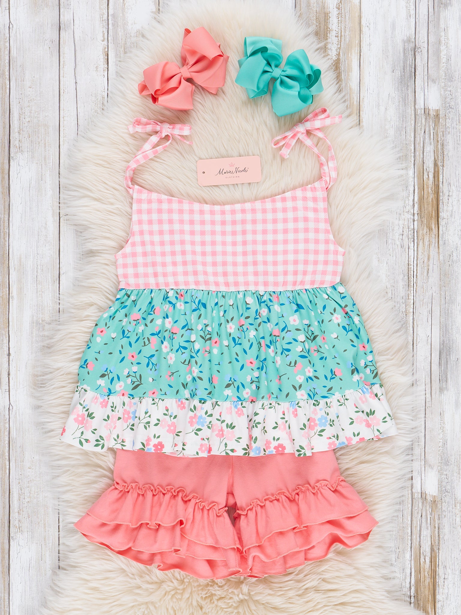 Teal & Peach Gingham Garden Tie Ruffle Outfit