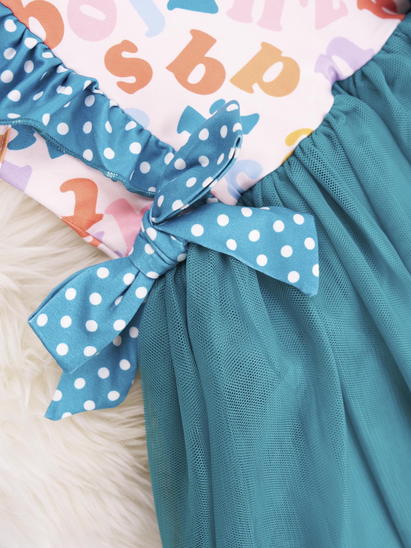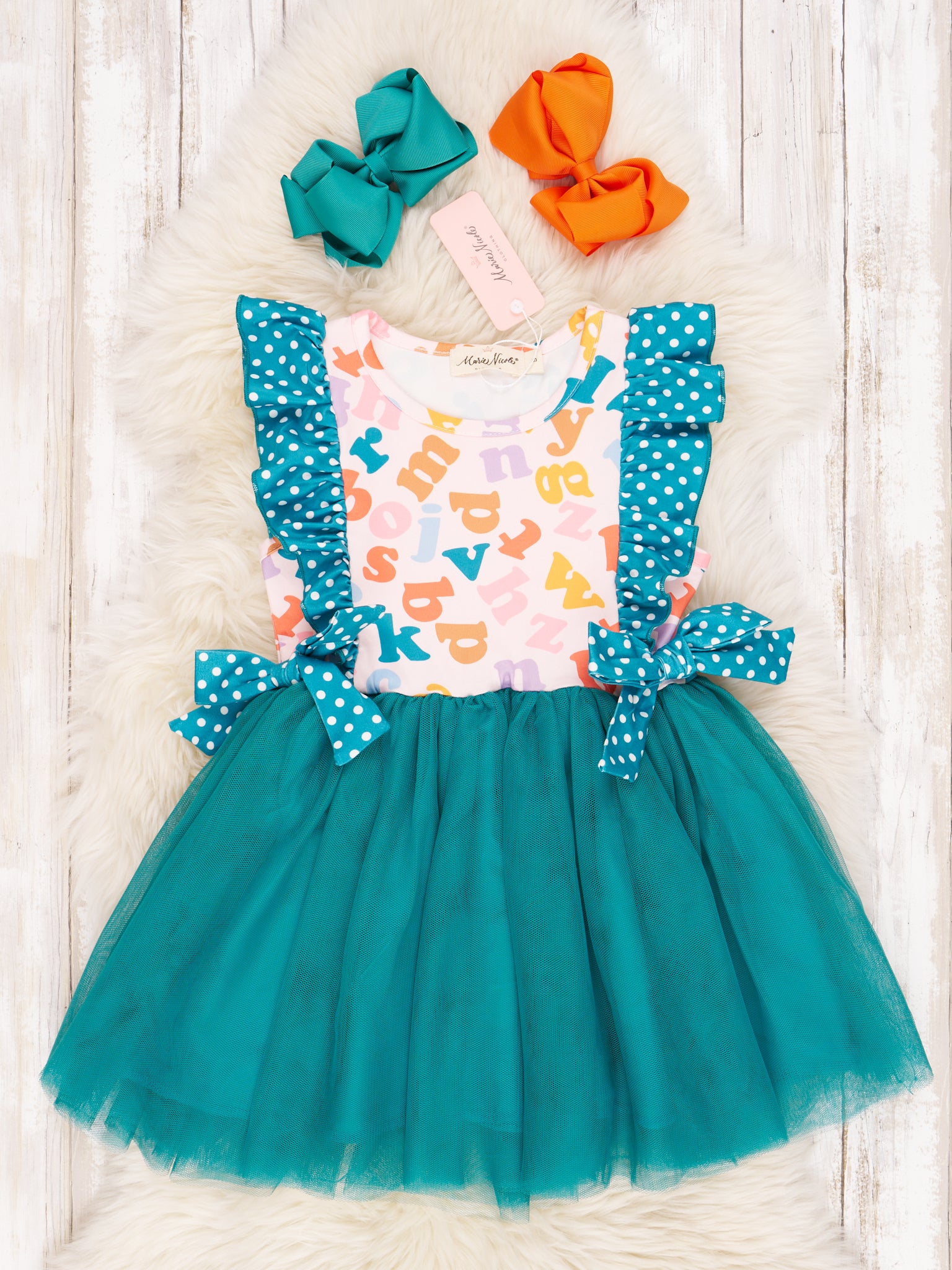 A dress to make any little one look simply studious! This Teal Polka Dot Alphabet Tulle Ruffle Dress features a darling alphabet print. Plus, the fully lined tulle skirt and polka dot ruffles add the perfect pop of sweetness.