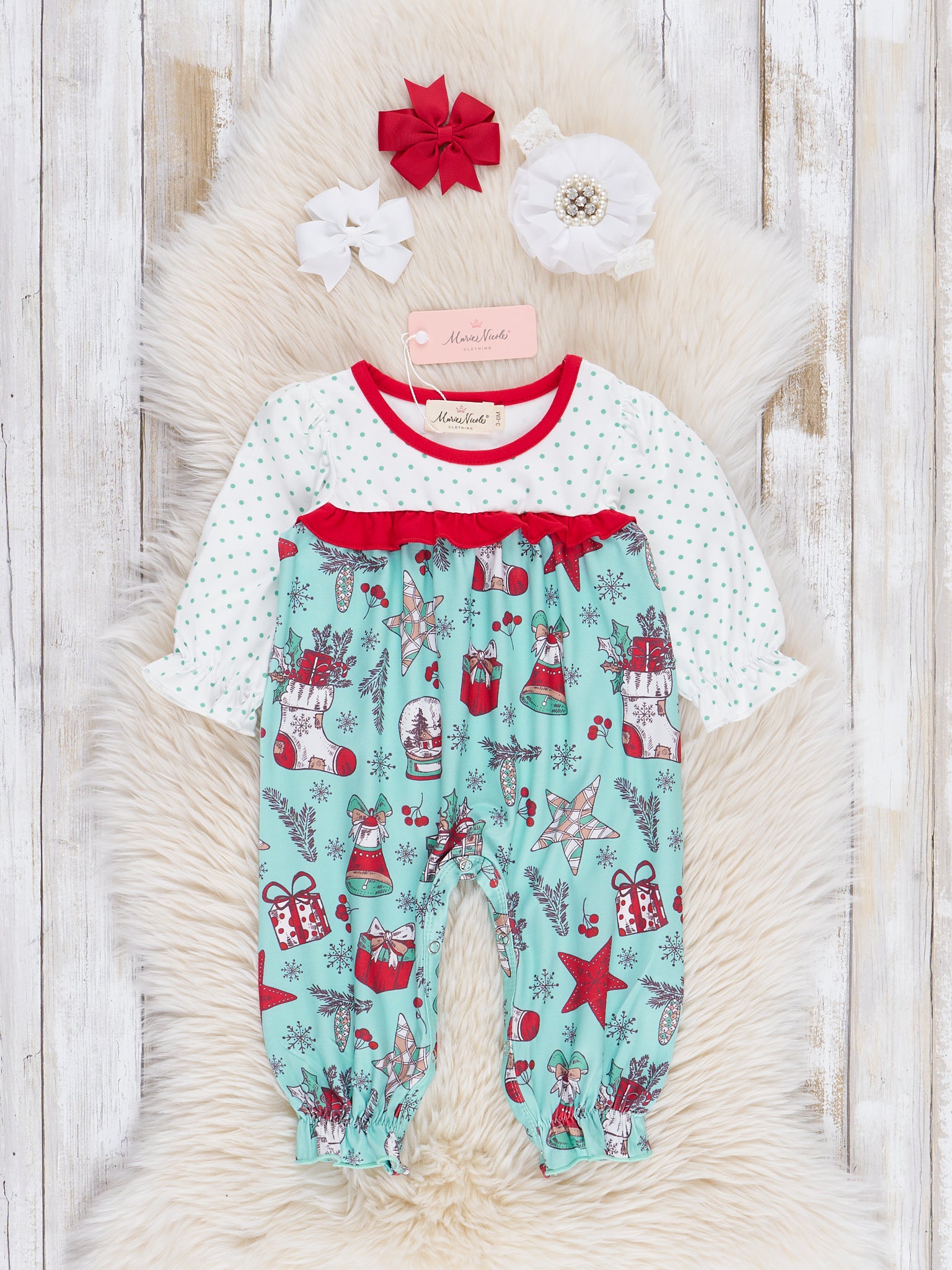 Spread holiday joy with this adorable teal and red romper for girls! Featuring a charming polka dot print and a festive teal "holiday joy" design on top, it's the perfect outfit for Christmas. Plus, the red ruffle detail adds the perfect Christmas touch. Your littles will sing happy holidays in this sister set!