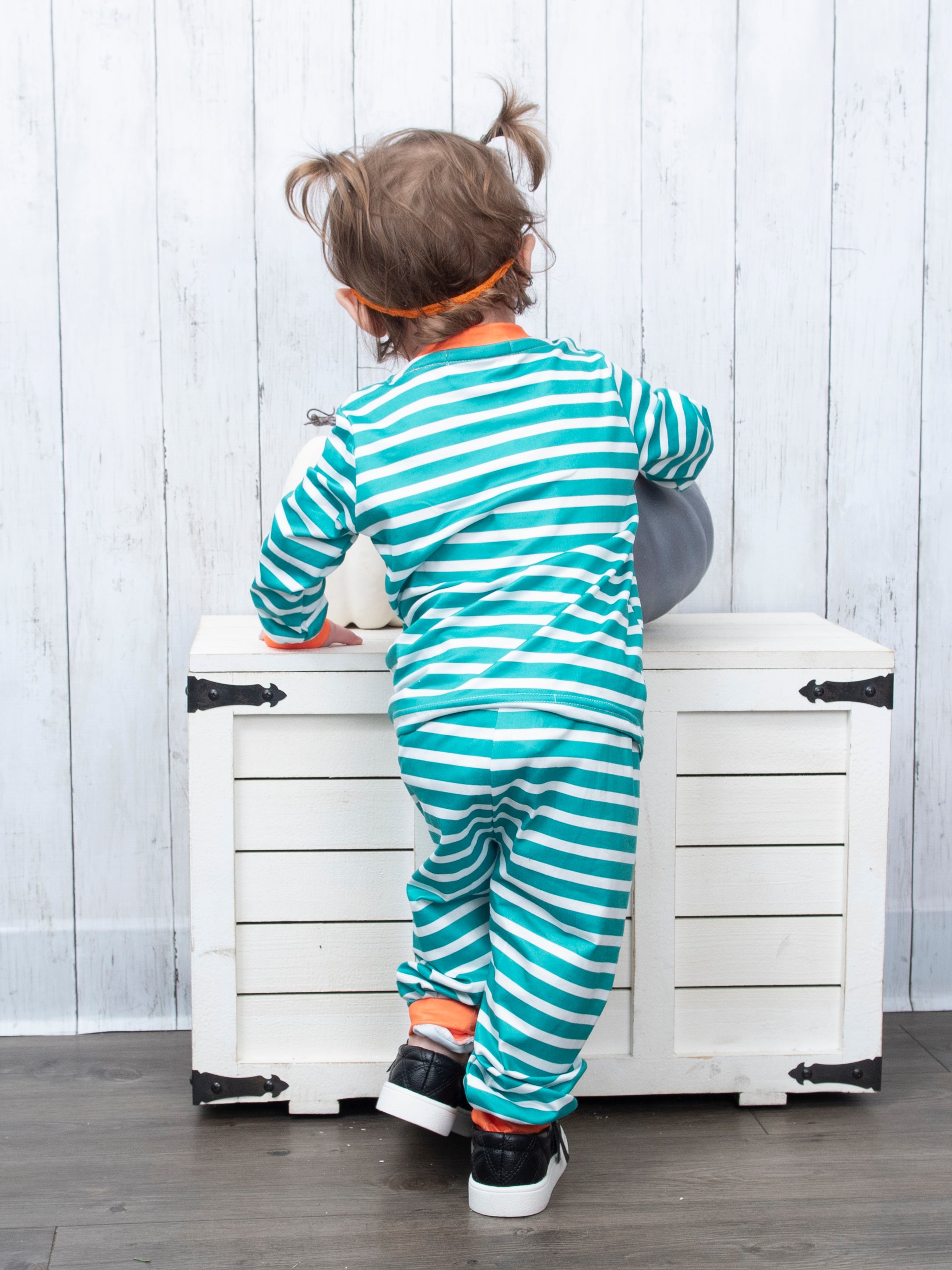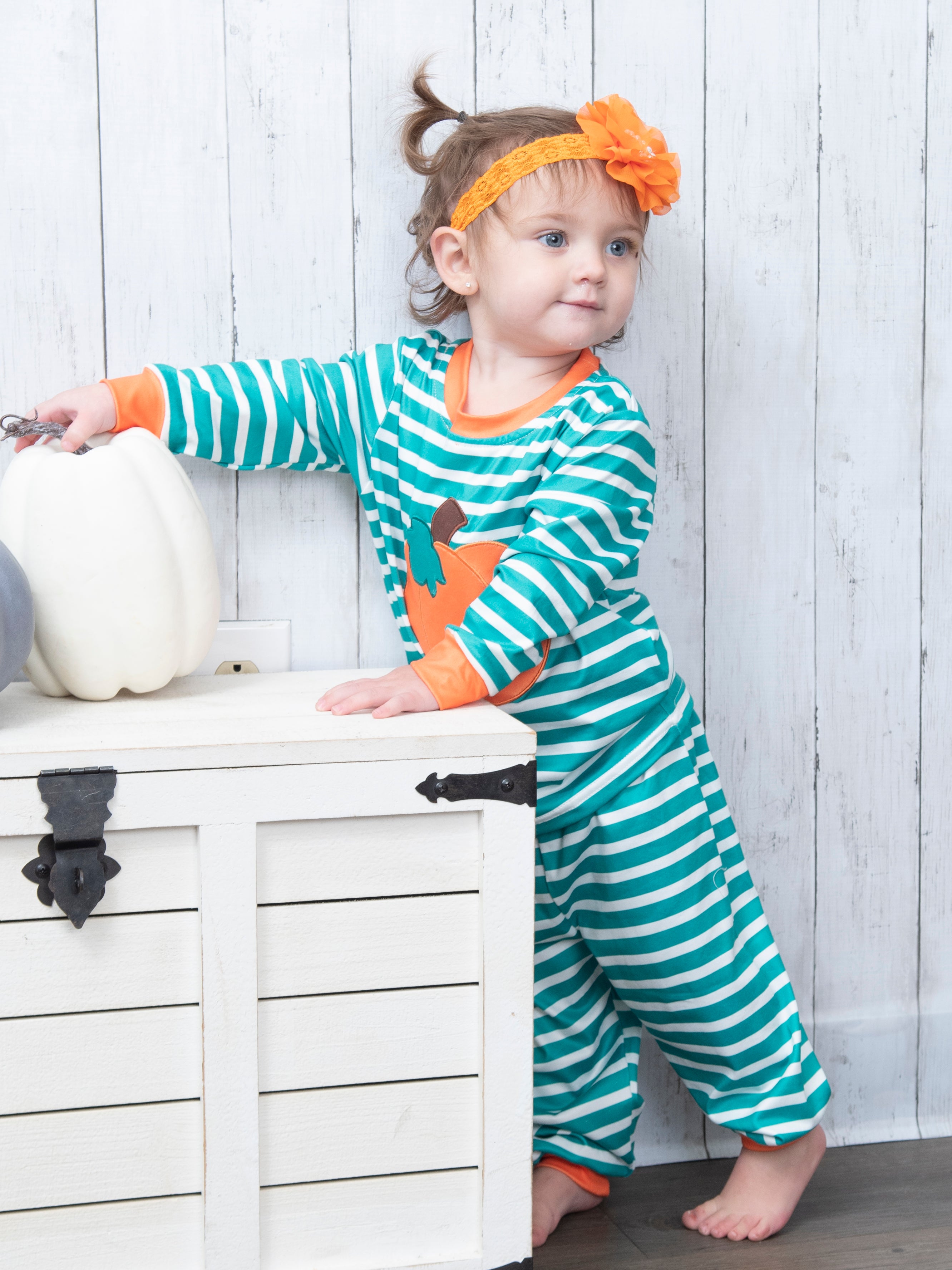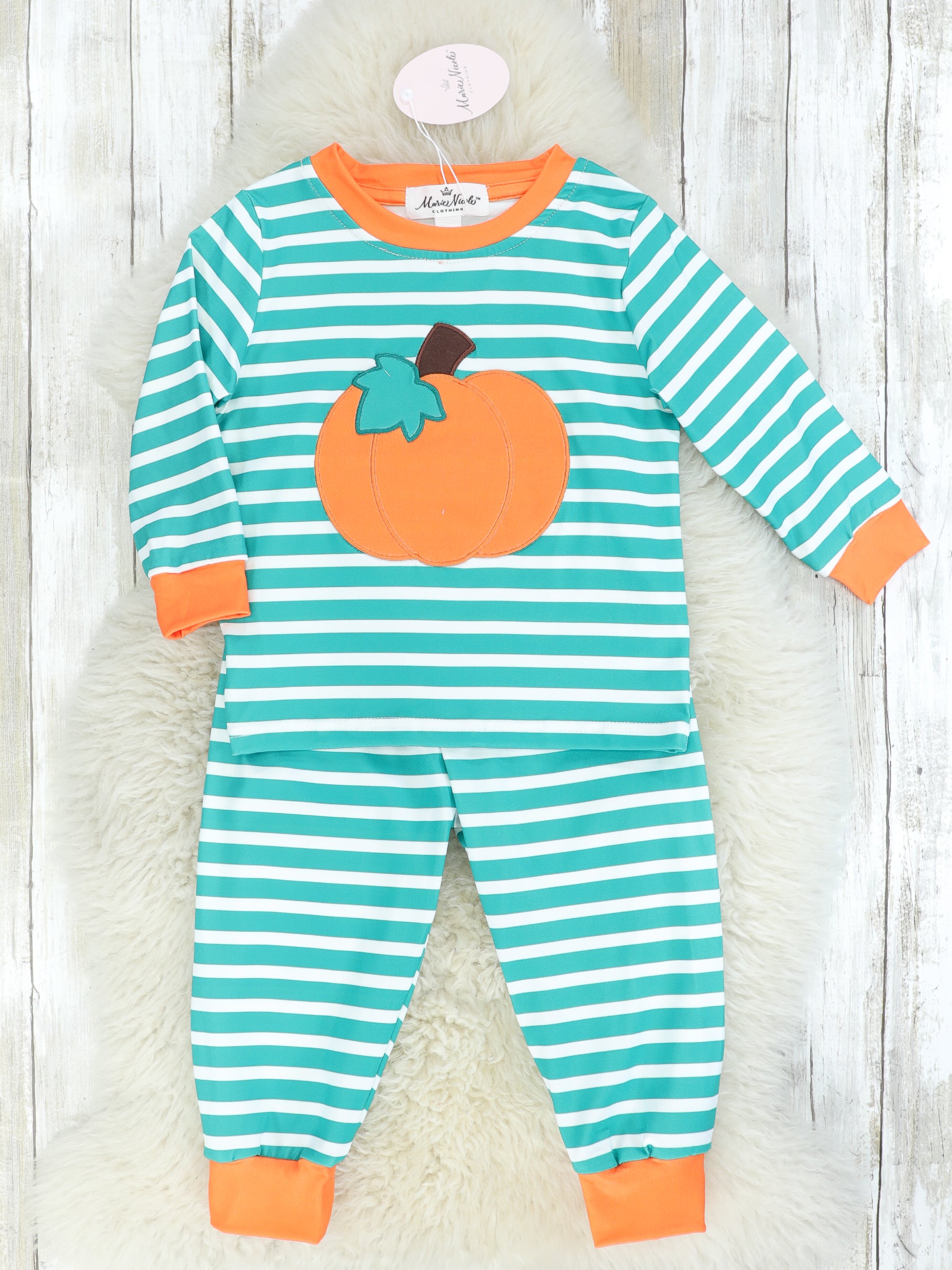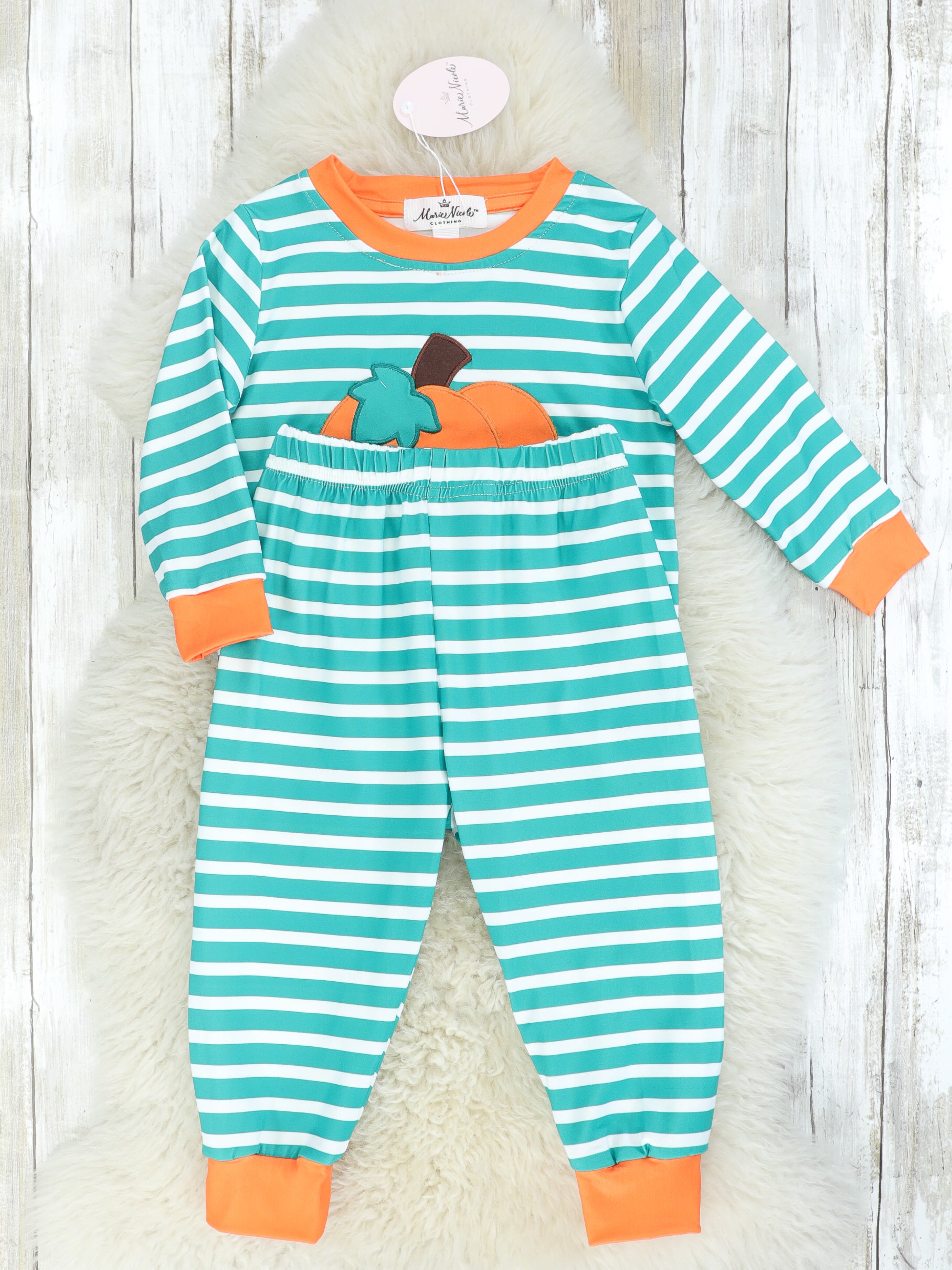Tuck your little pumpkin in these adorable pajamas! These teal striped pajamas feature a pumpkin appliqué & orange trim.