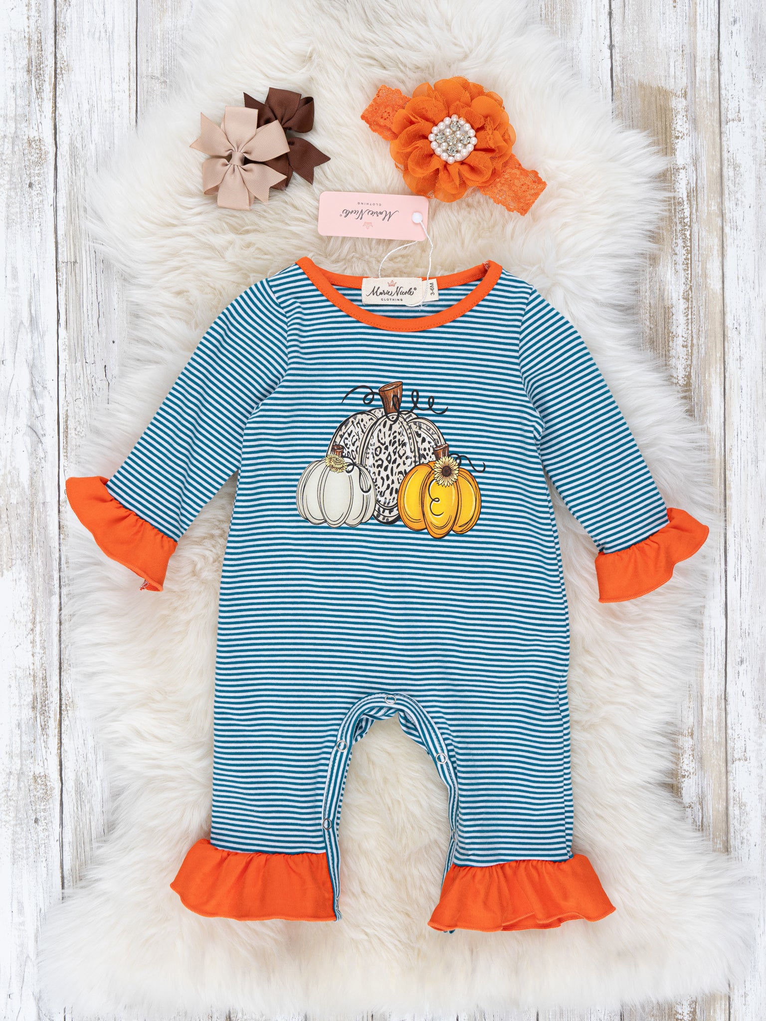 Dress up your little pumpkins in this adorable pumpkin set! This romper features long sleeves, bright orange ruffles at the collar, wrists, and ankles & a leopard print pumpkin.