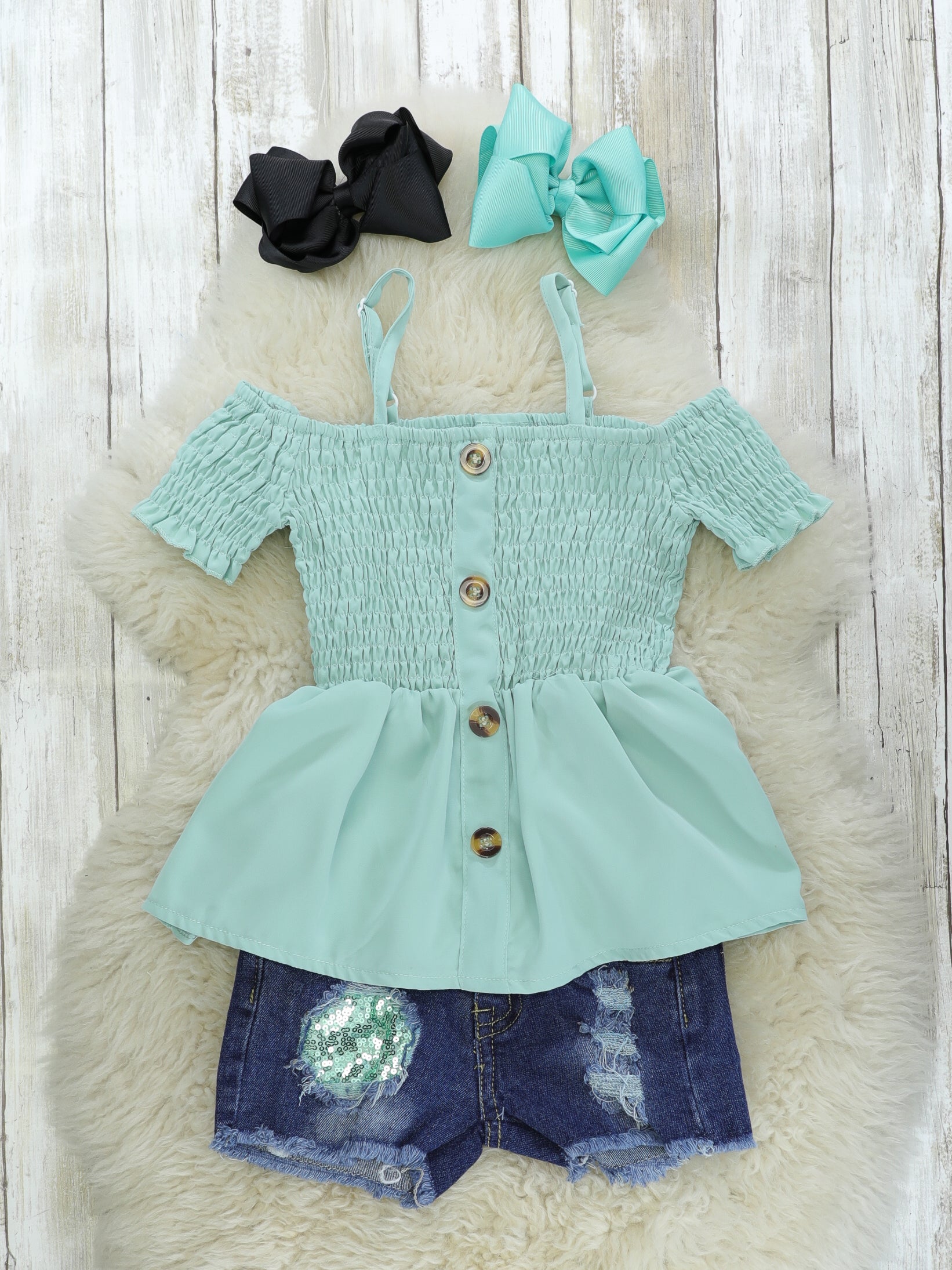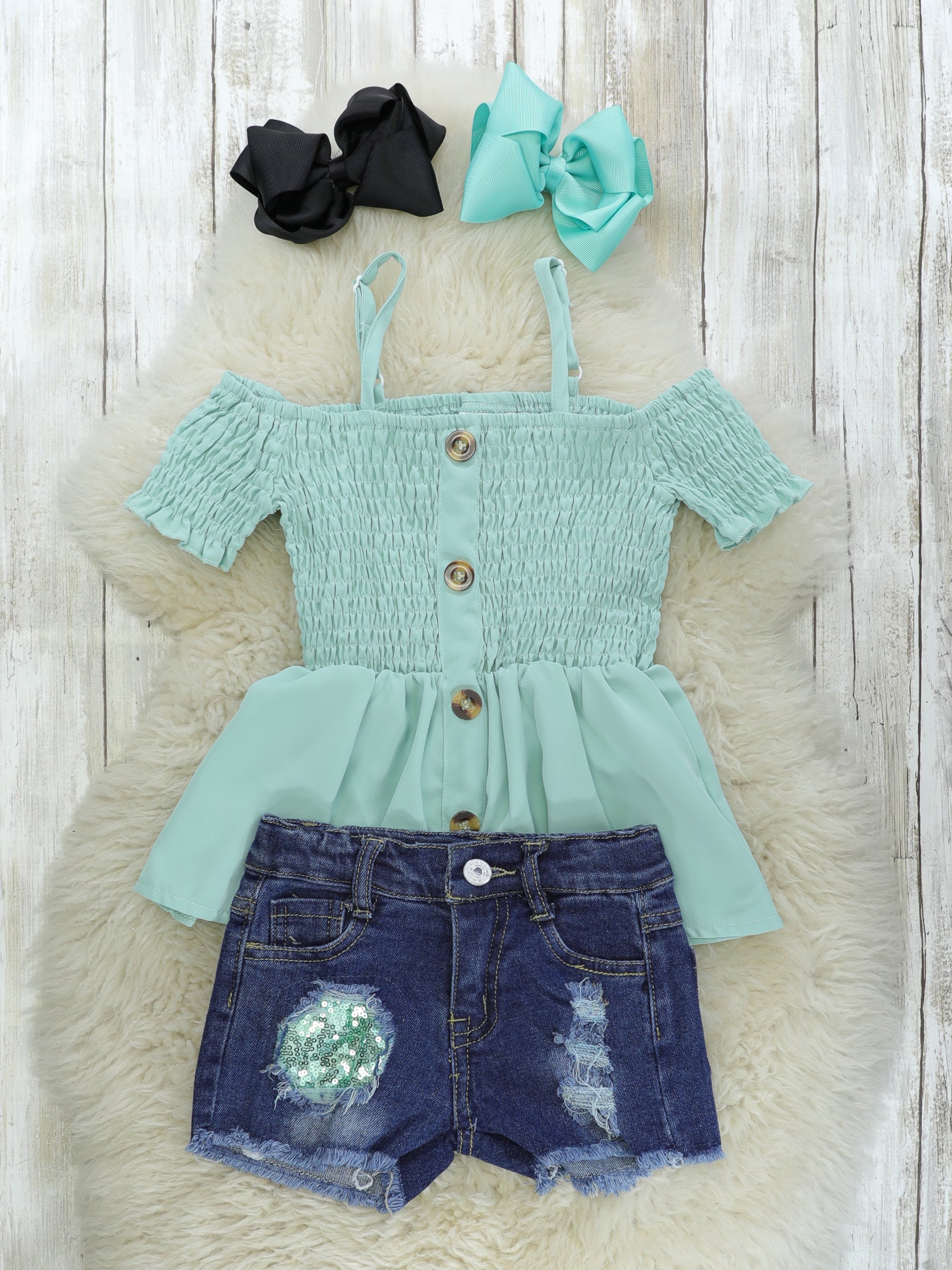 An adorable everyday outfit with a little bit of glitz & glam! This outfit features a cold shouldered teal tunic top & distressed shorts with a sequin patch.