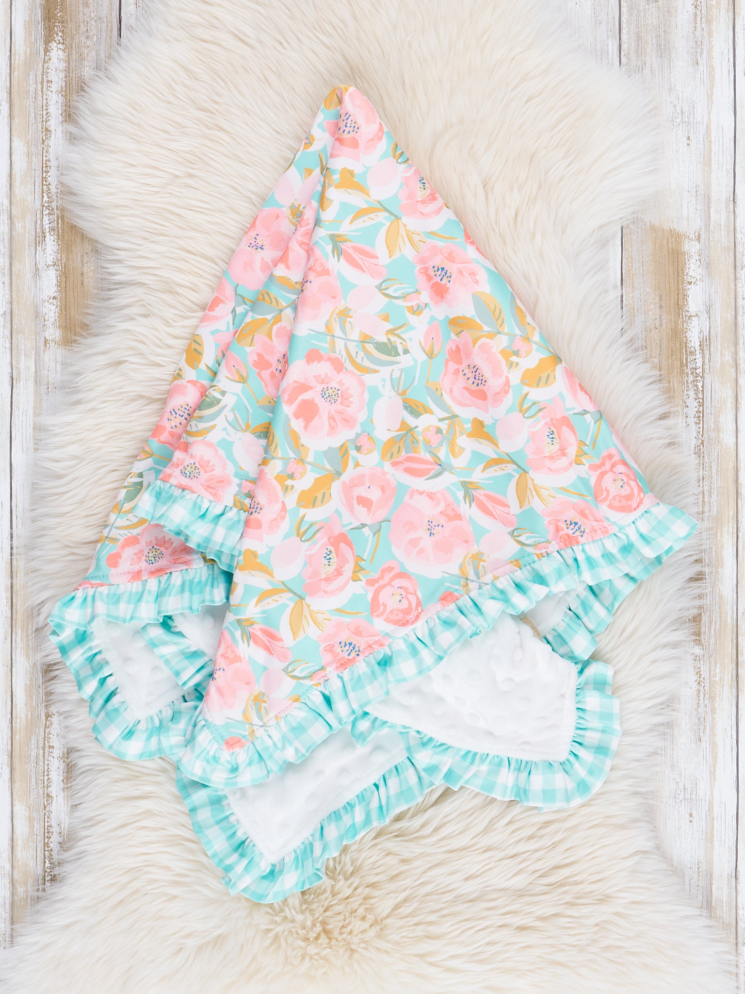 Teal Watercolor Bouquets Ruffle Minky Blanket