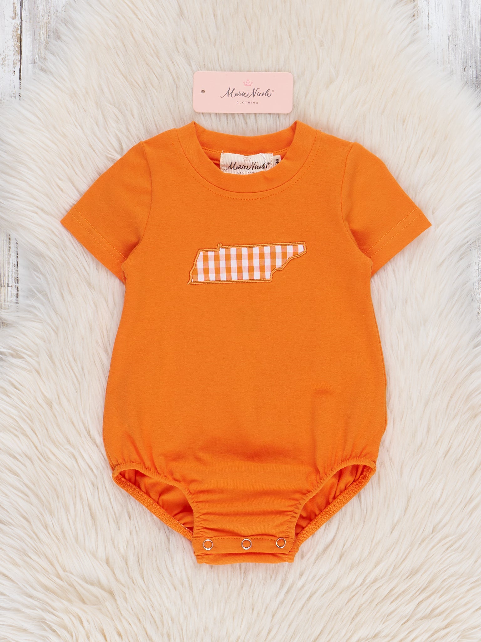 The Tennessee Embroidered Gingham Bubble is a charming blend of Southern pride and classic style. Featuring a bold orange and white gingham pattern and a beautifully embroidered Tennessee applique, this bubble from Marie Nicole Clothing is perfect for showing off team spirit in a sweet, everyday way. Lightweight and breathable, it’s ideal for warm weather, casual outings, or cheering on your favorite team in comfort and style.