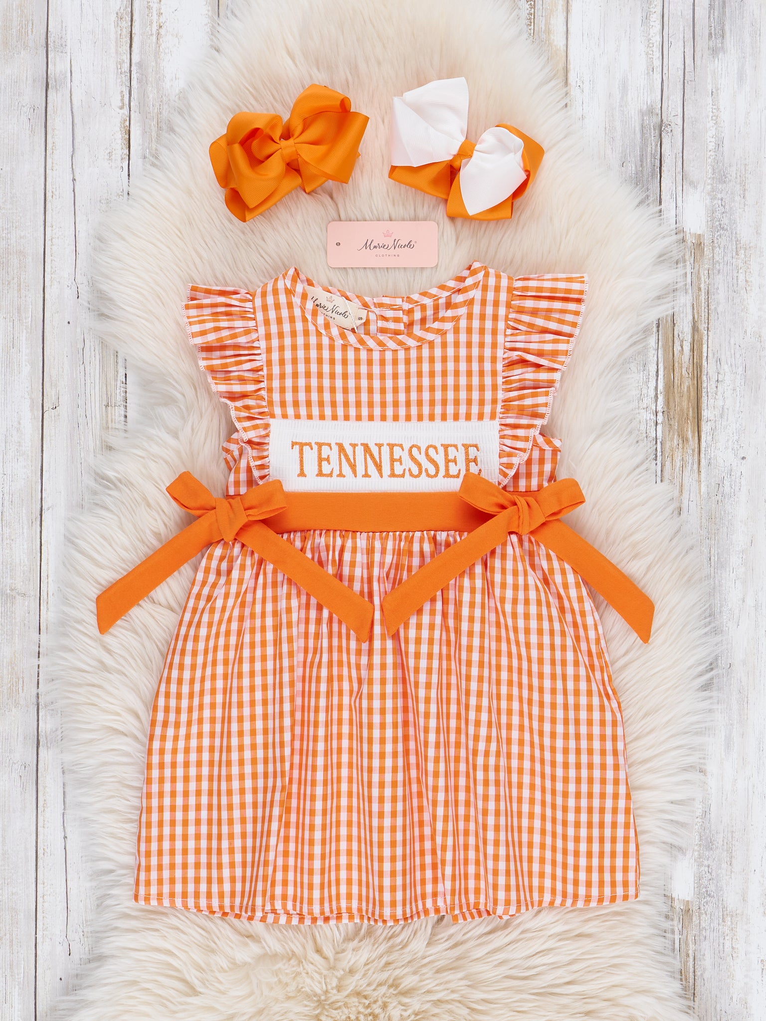 The Tennessee Smocked Gingham Dress is a darling combination of Southern charm and team spirit. Featuring a classic orange and white gingham pattern, sweet ruffle sleeves, and a smocked panel embroidered with “Tennessee,” this dress from Marie Nicole Clothing is perfect for game days, family gatherings, or sunny day adventures. Finished with bold orange waist ties for a polished look, it’s a spirited style your little fan will love to twirl in.