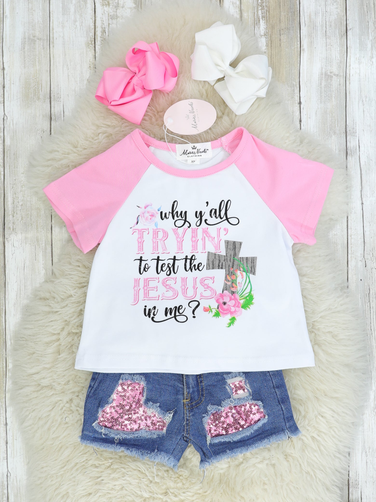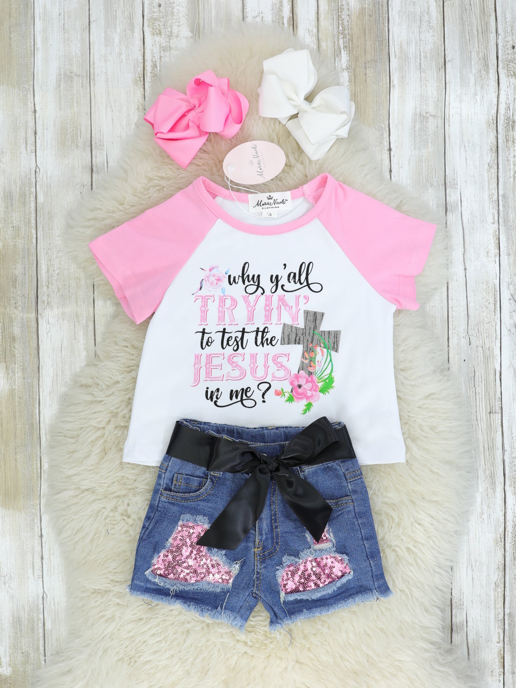 Why y'all tryin' to test the Jesus in me?! This outfit features the cutest raglan tee & denim shorts with sparkly pink sequin patches.