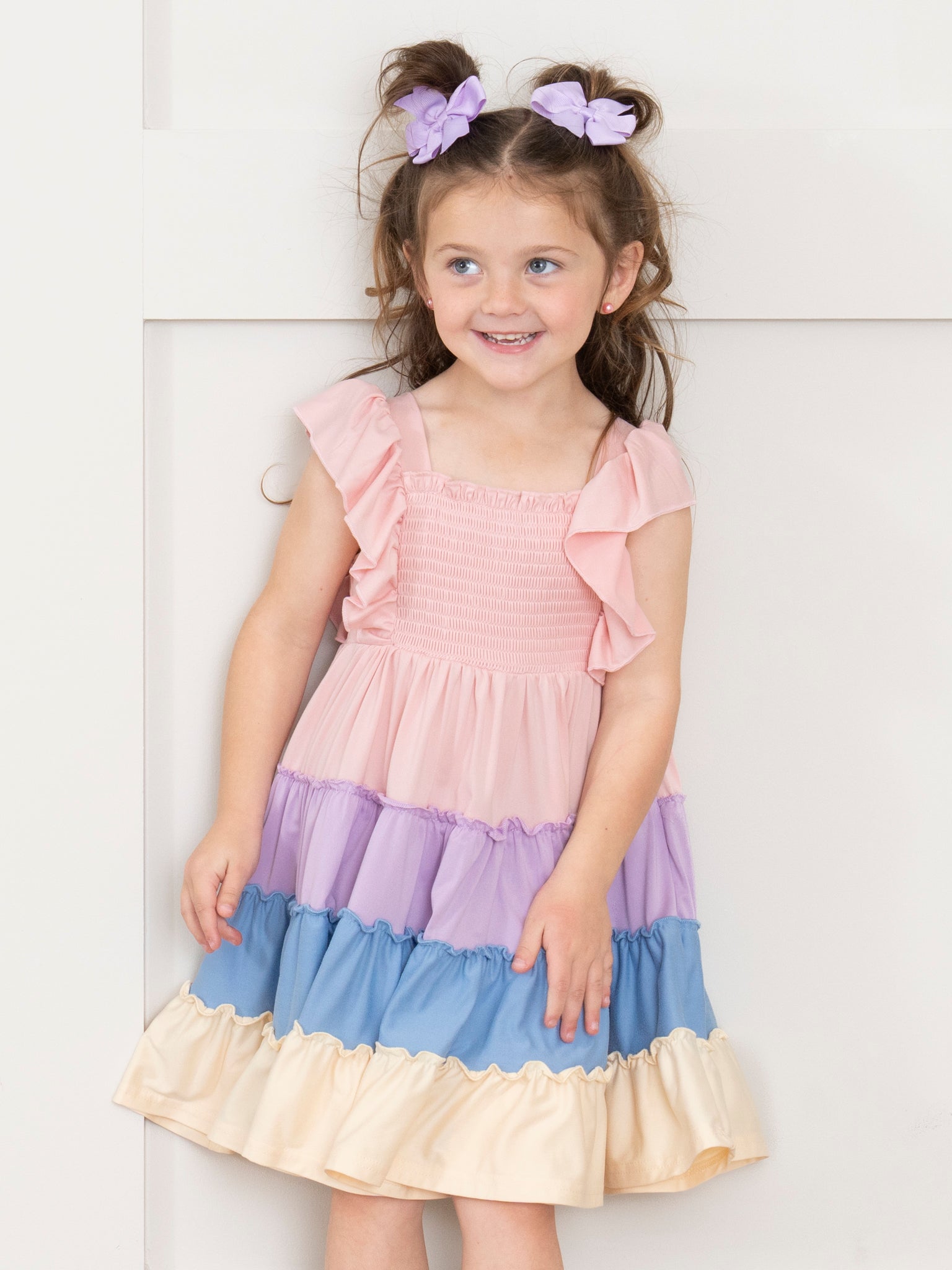 Be a pastel princess in our Tiered Color Blocked Dress! This playful Mom & Me set features ruffled bodice and tiered pastel colors. Perfect for twinning with your little one. By Marie Nicole Clothing.
