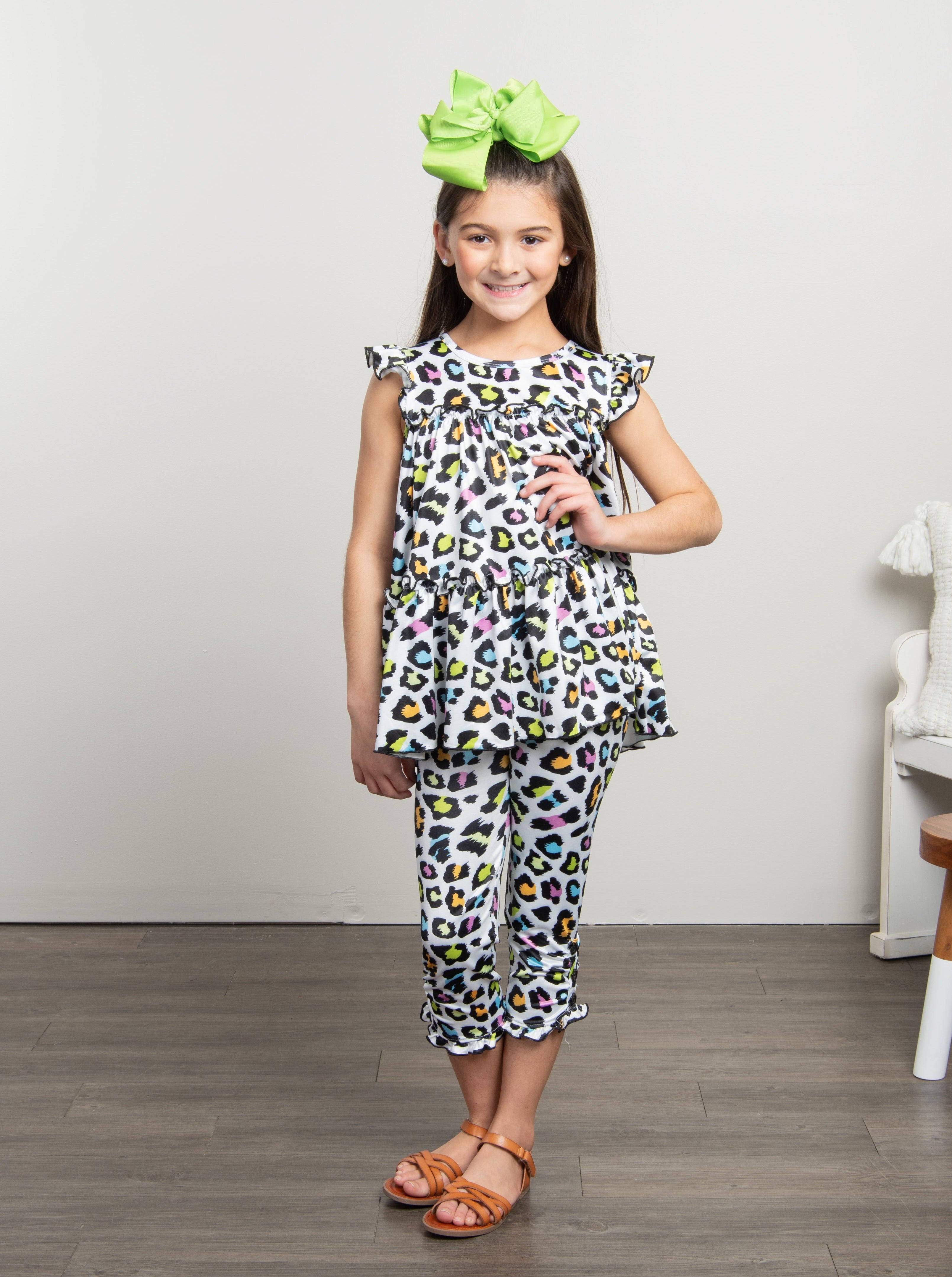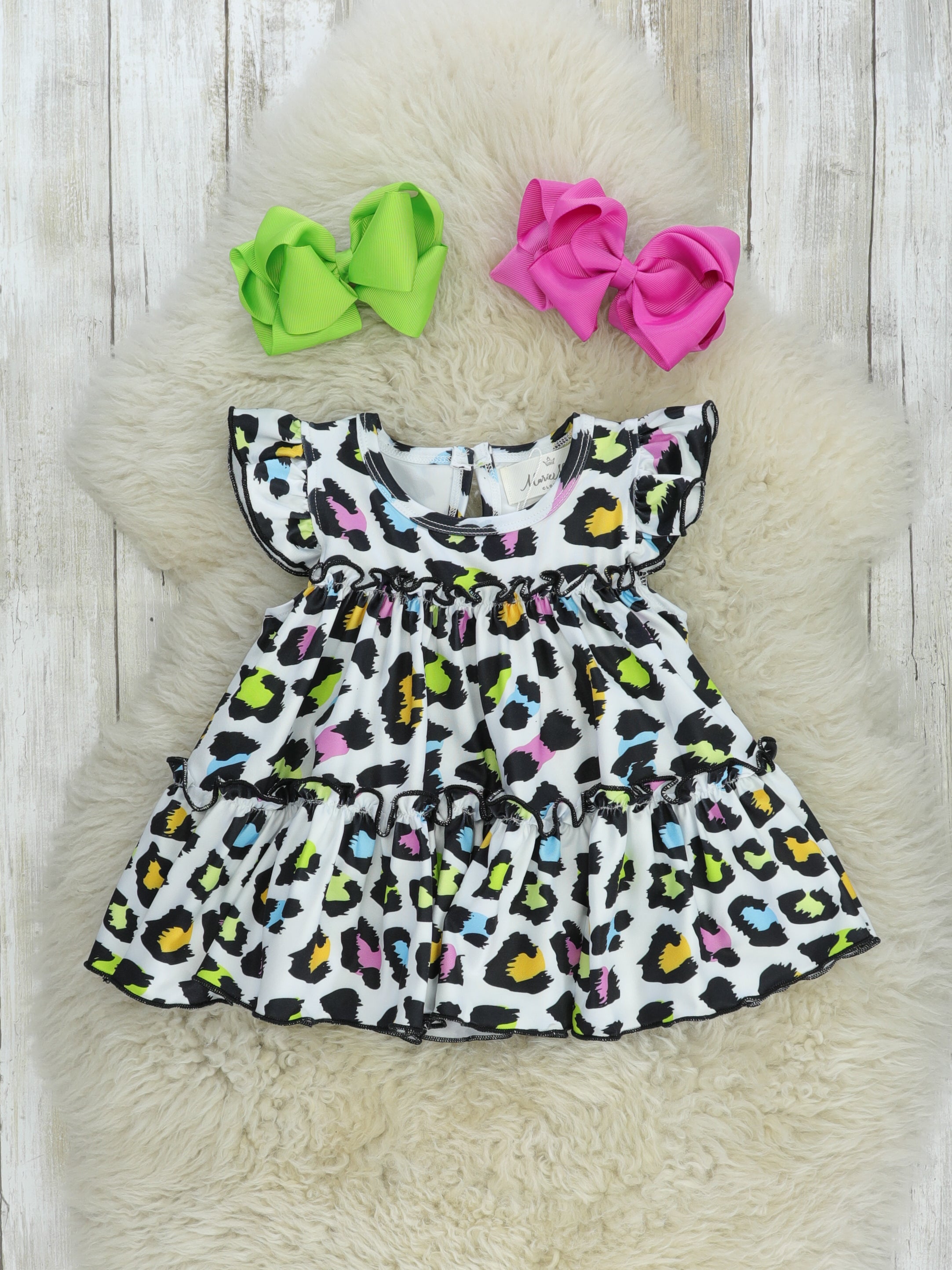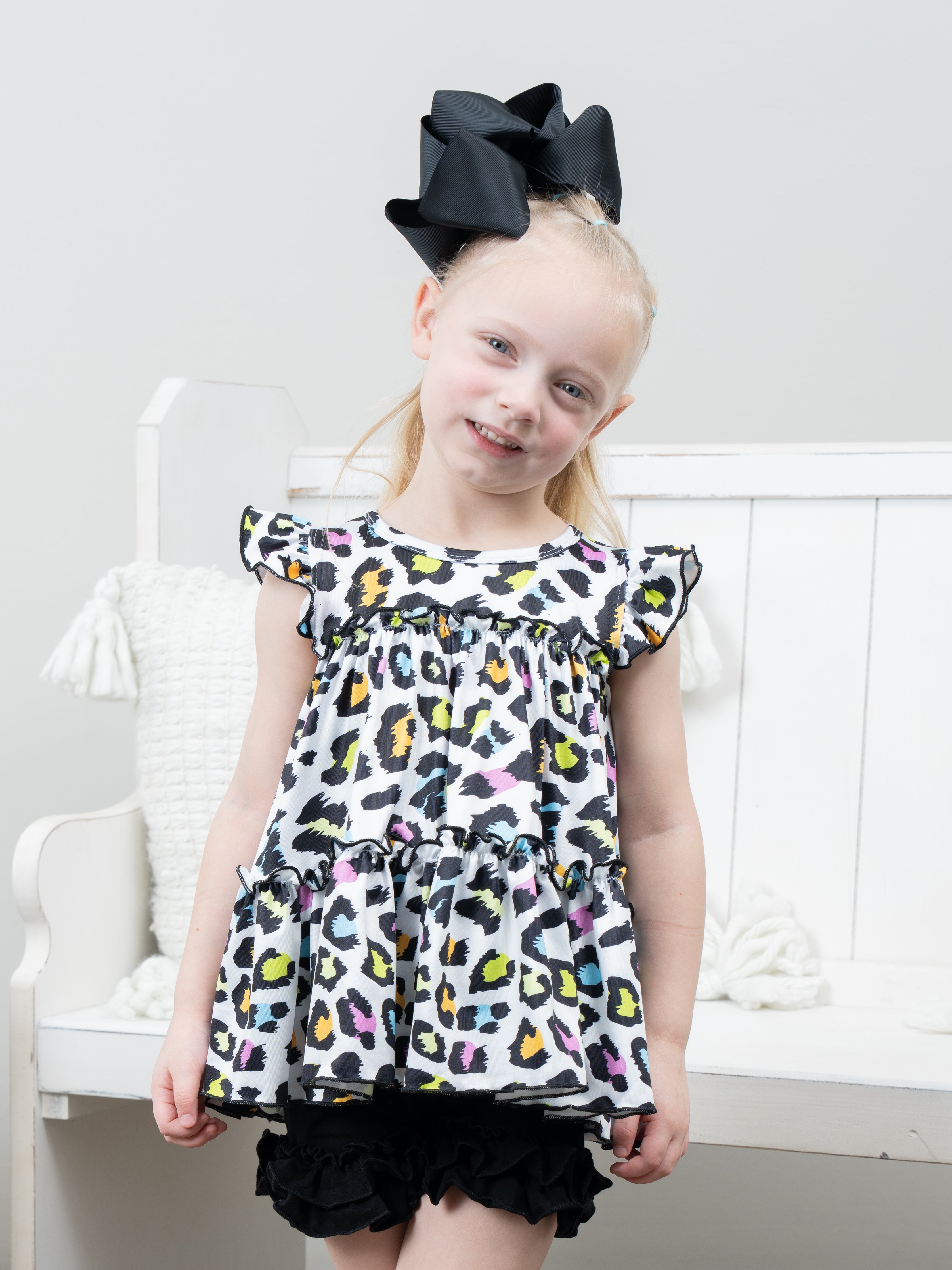 These sweet tunics are perfect for spring & summer fun! This tiered tunic features a stunning neon leopard design, ruffles, flutter sleeves, & a keyhole at the nape of the neck for easy changing.