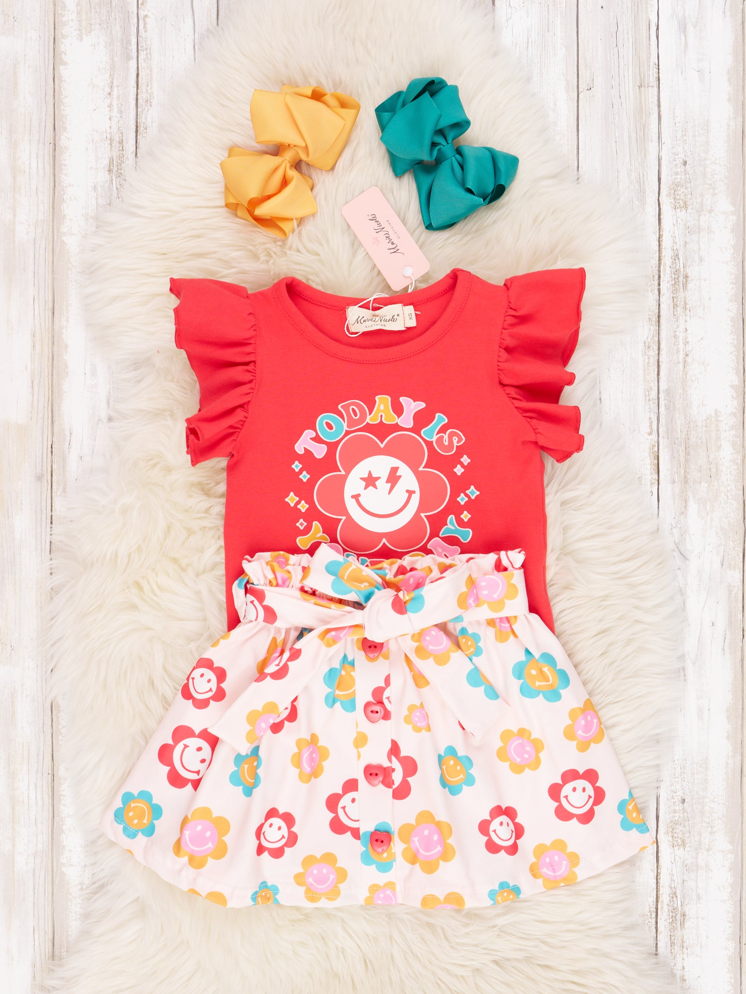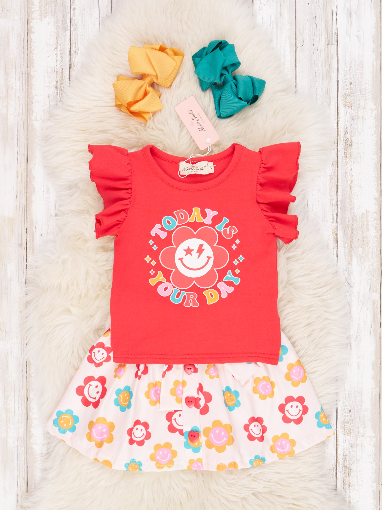 Welcome today with this precious ruffle outfit! Featuring a red top detailed with "Today Is Your Day" and a matching skirt with an elastic waistband for all-day play. With ruffles and tie detail, your little one will surely be the cutest in this amazing outfit!