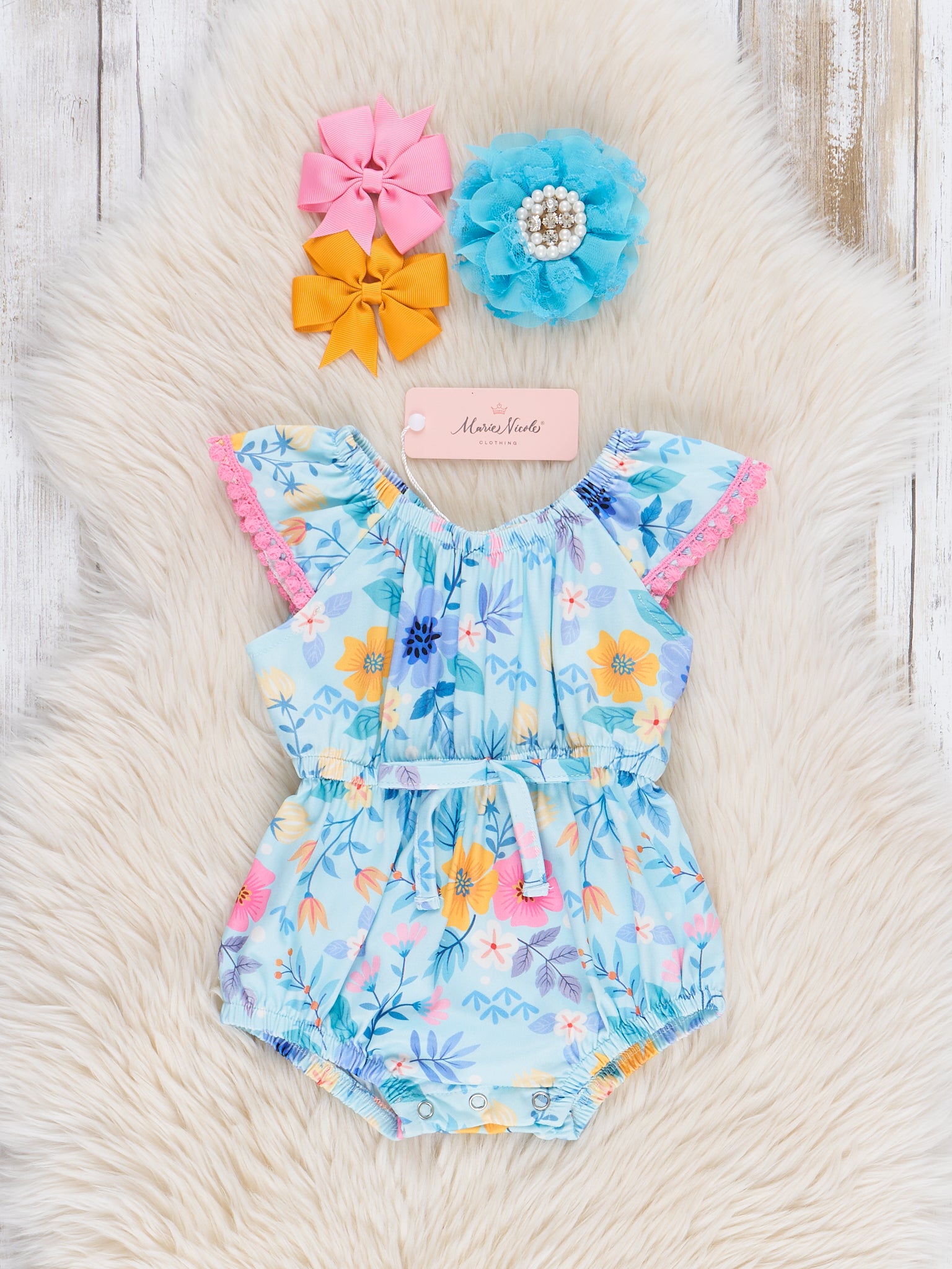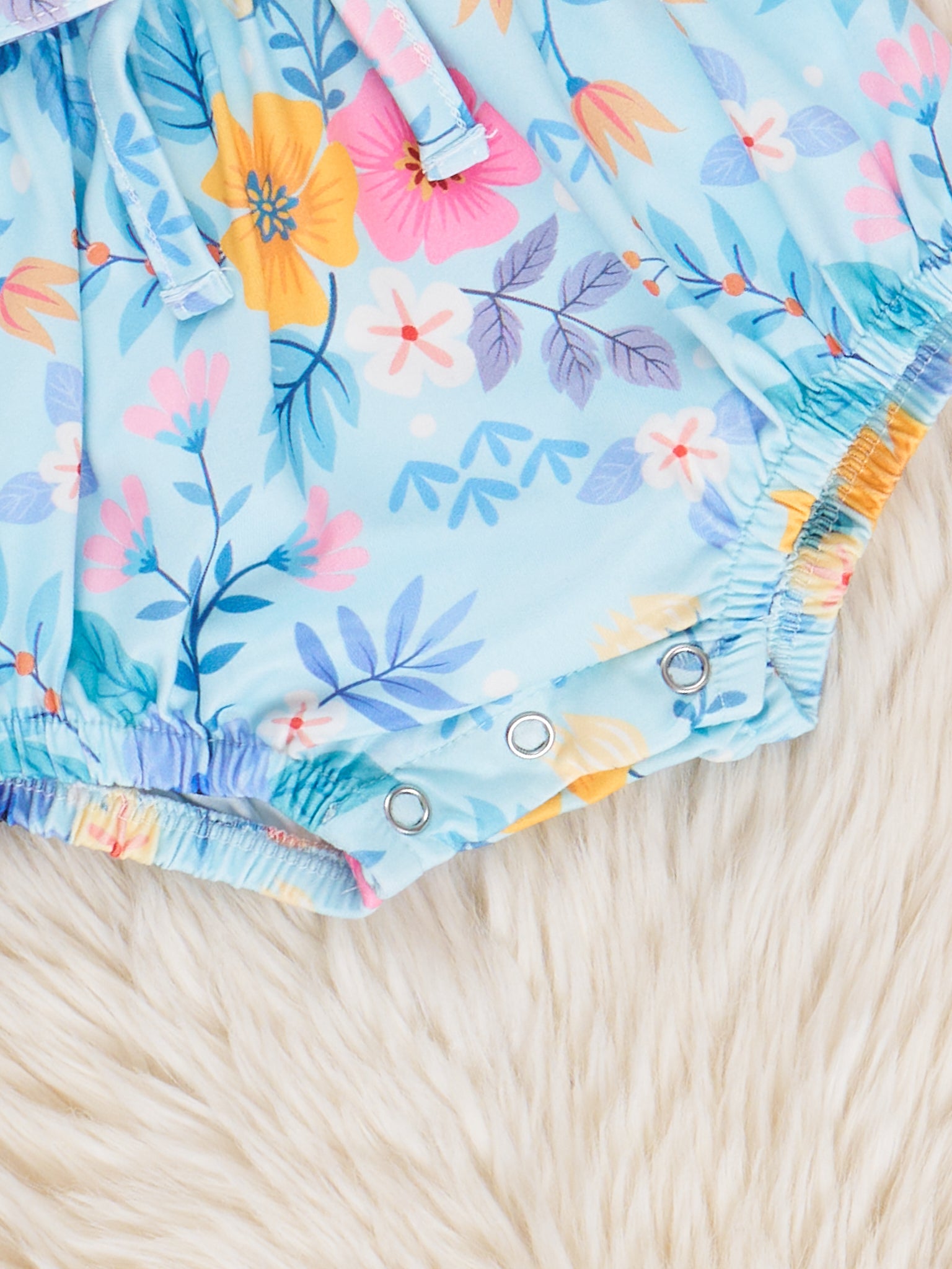Perfect for sunny days, Tropical Flowers Flutter Bubble is a vibrant and breezy. Featuring a beautiful tropical flower print, pom pom trim, and soft flutter sleeves, this bubble from Marie Nicole Clothing offers a light, airy feel that’s perfect for warm weather.