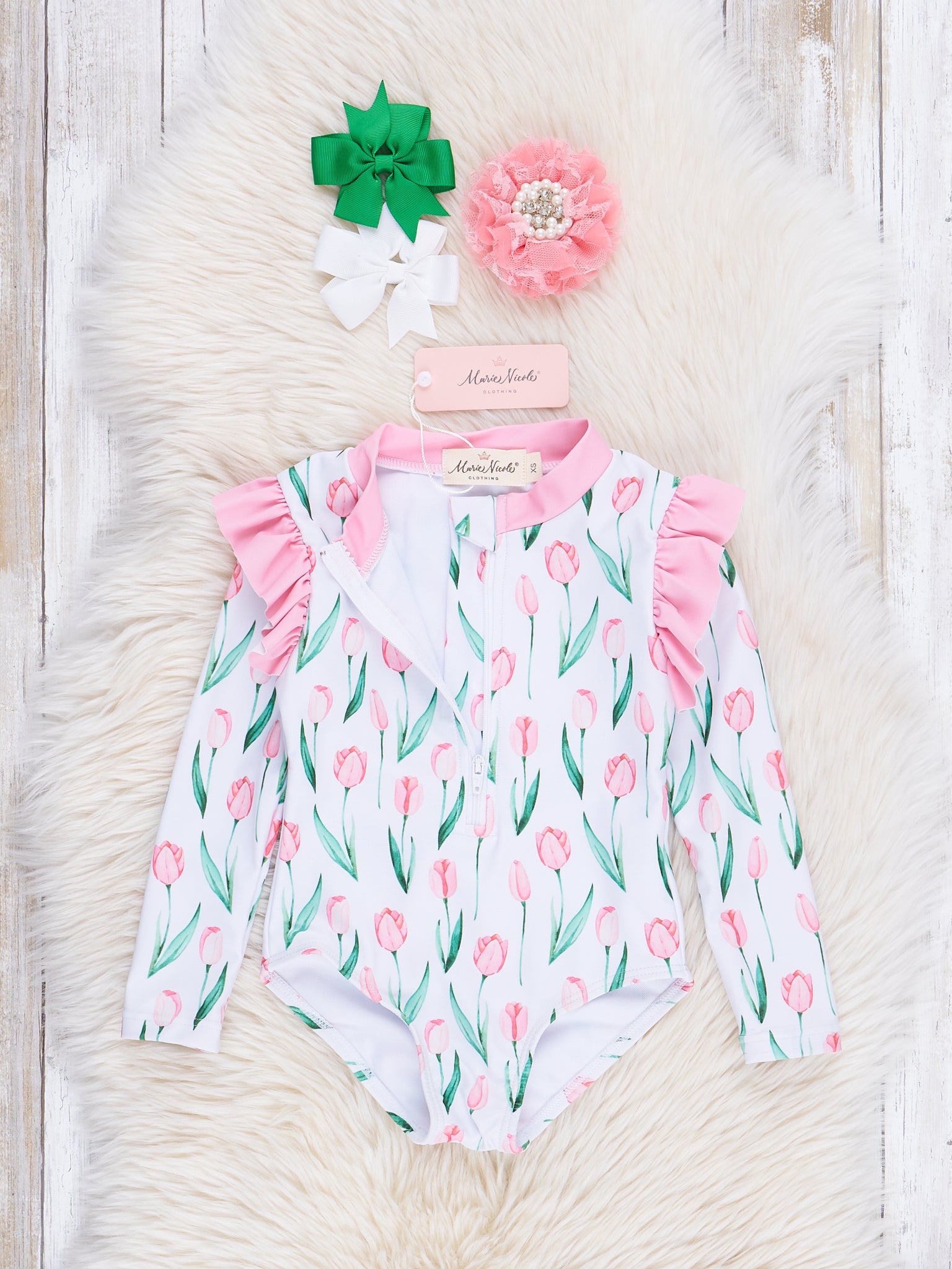 Dive into fun with our Tulip Garden Ruffle One-Piece Swimsuit! Featuring adorable tulips and playful pink ruffles, this swimsuit is perfect for days spent at the pool or beach. Stay stylish and comfortable all summer long. 🏝️