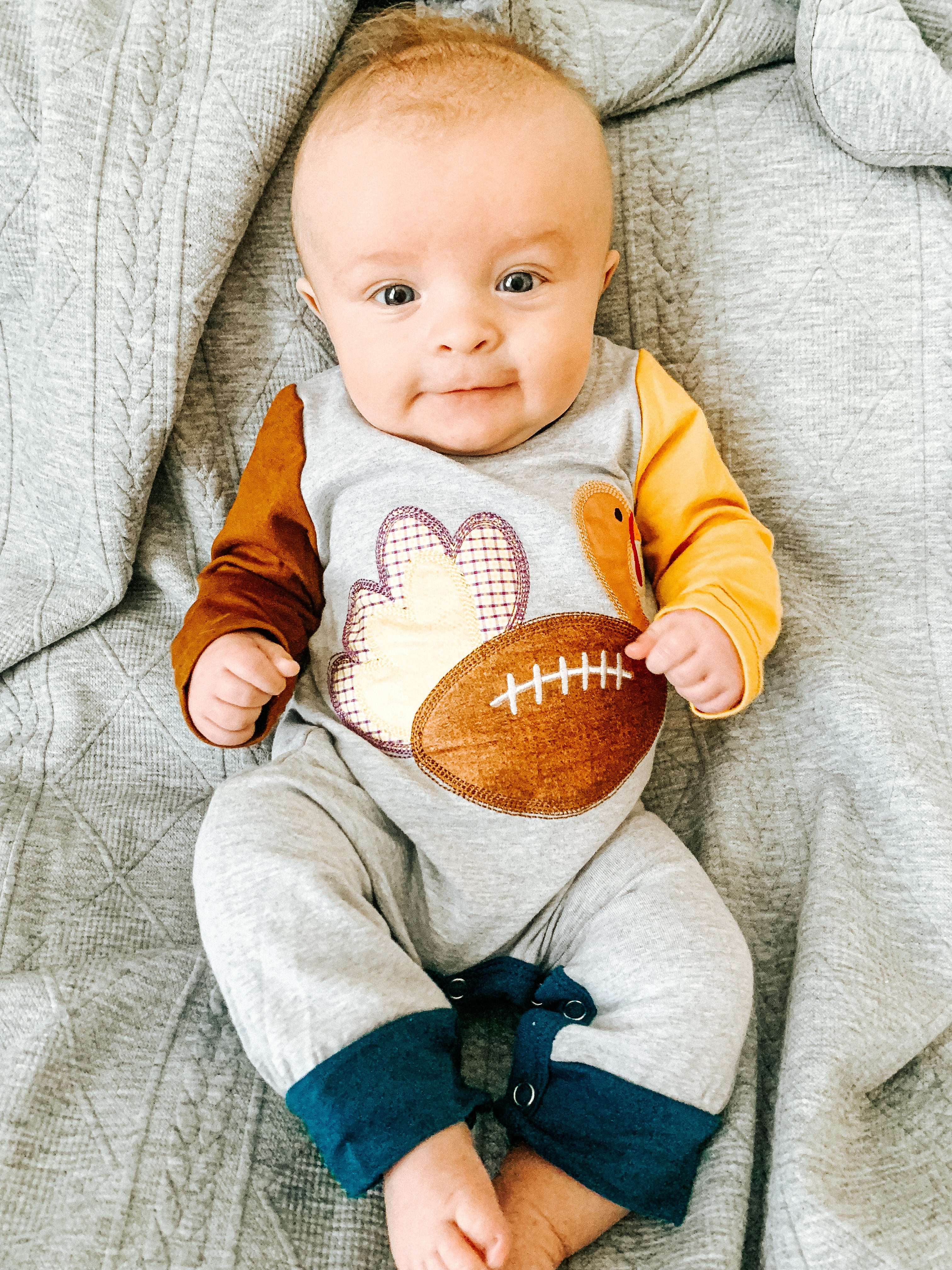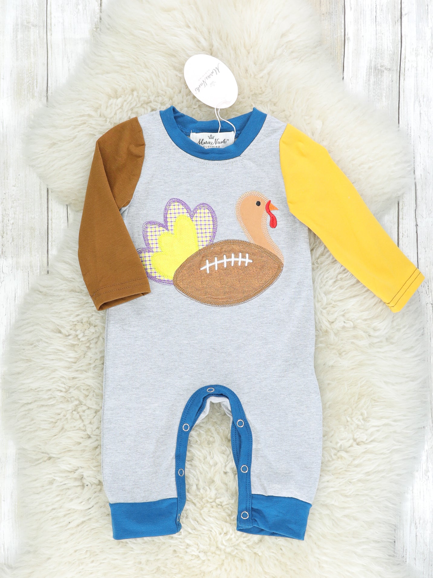 We're kicking off Thanksgiving with this darling brother set! This grey romper features a turkey football appliqué, brown & yellow raglan sleeves, and navy trim.