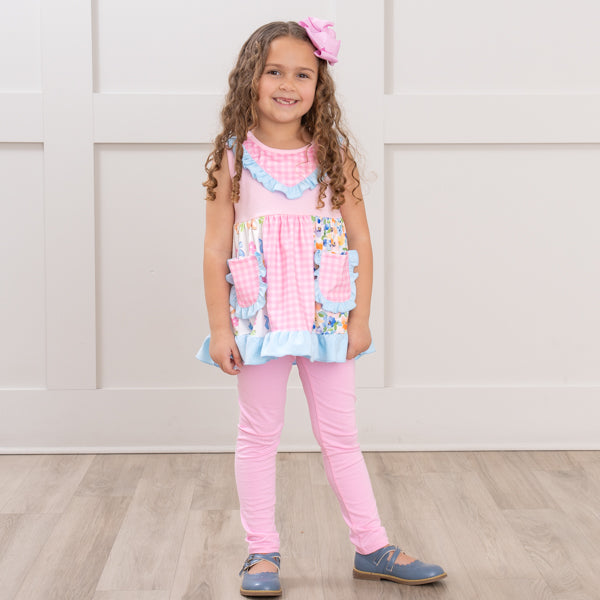 The Turkey Trot Smocked Dress by Marie Nicole Clothing features a soft pastel plaid pattern, smocked turkey embroidery, a blue ruffle-trimmed neckline, and gently gathered short sleeves. This dress is perfect for Thanksgiving celebrations and seasonal family gatherings, combining classic comfort with festive charm.