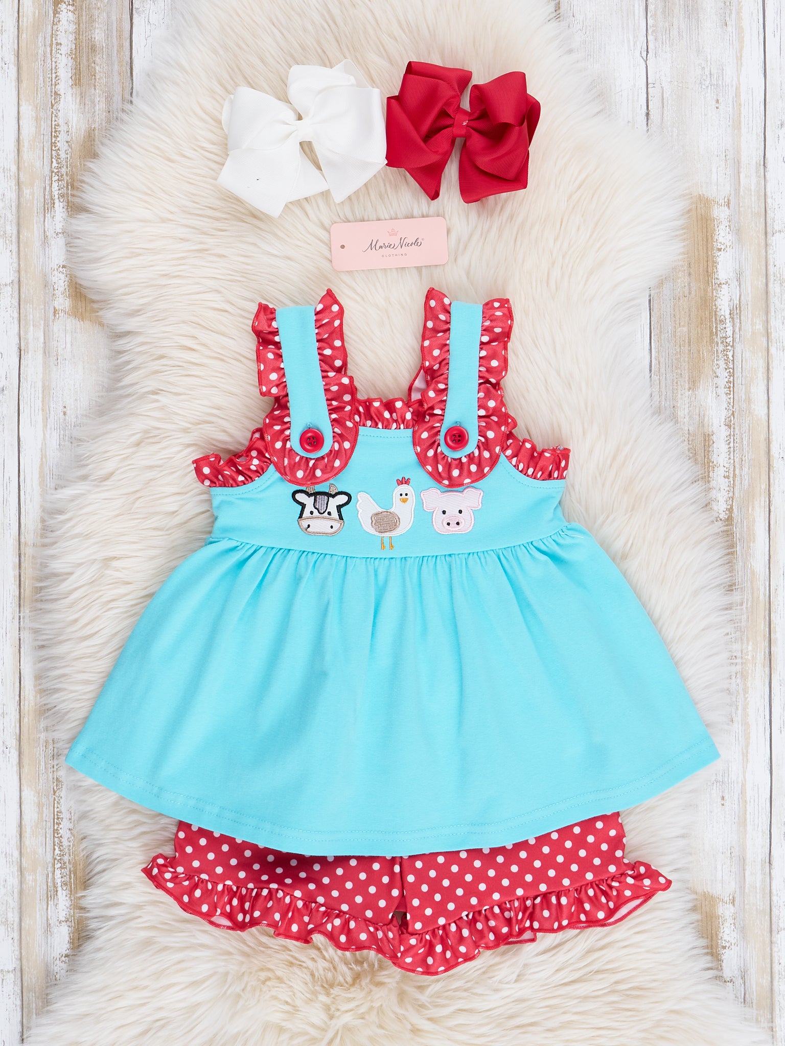 Add some farmyard charm to your little one's wardrobe with this sibling set. Featuring playful embroidered farm animals & a bold red trim top paired with red polka dot ruffle shorts, this outfit is sure to bring a smile to their face!