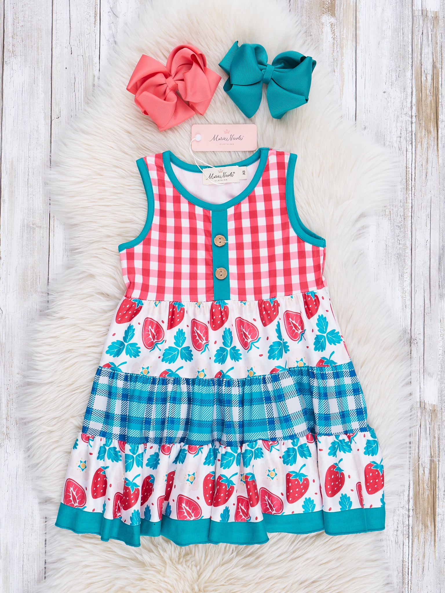 Be the cutest and most fun in our Turquoise & Strawberries Ruffle Dress! With tiered ruffles and mixed patterns of gingham and strawberries, you'll stand out in style. The button detail adds a playful touch, and the turquoise trim ties it all together. Shop the collection!