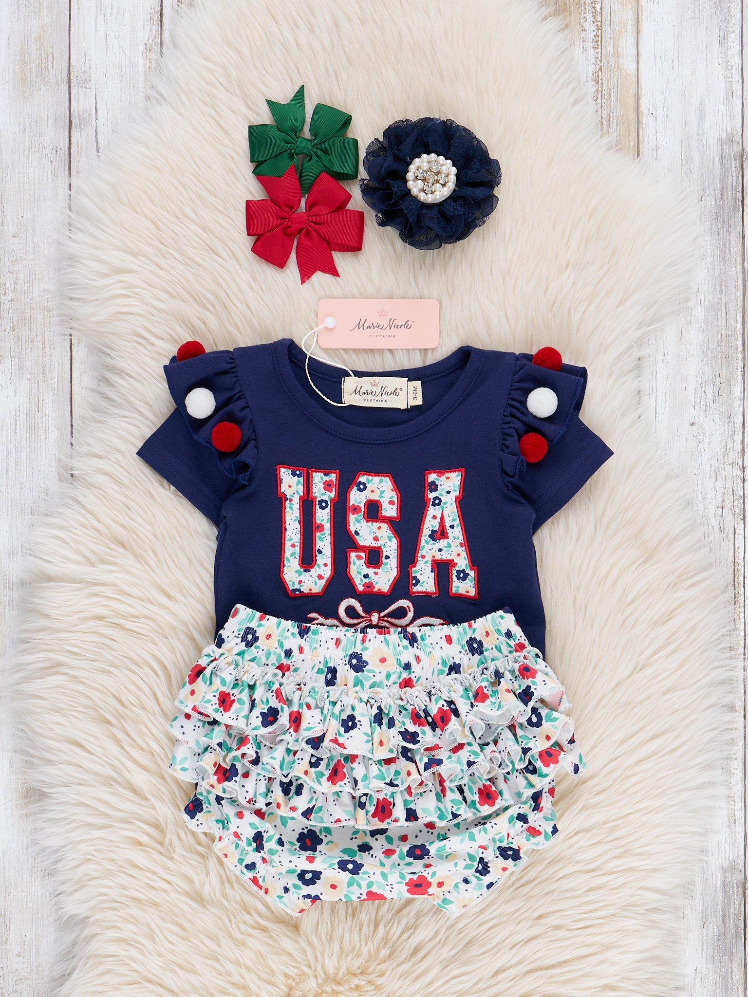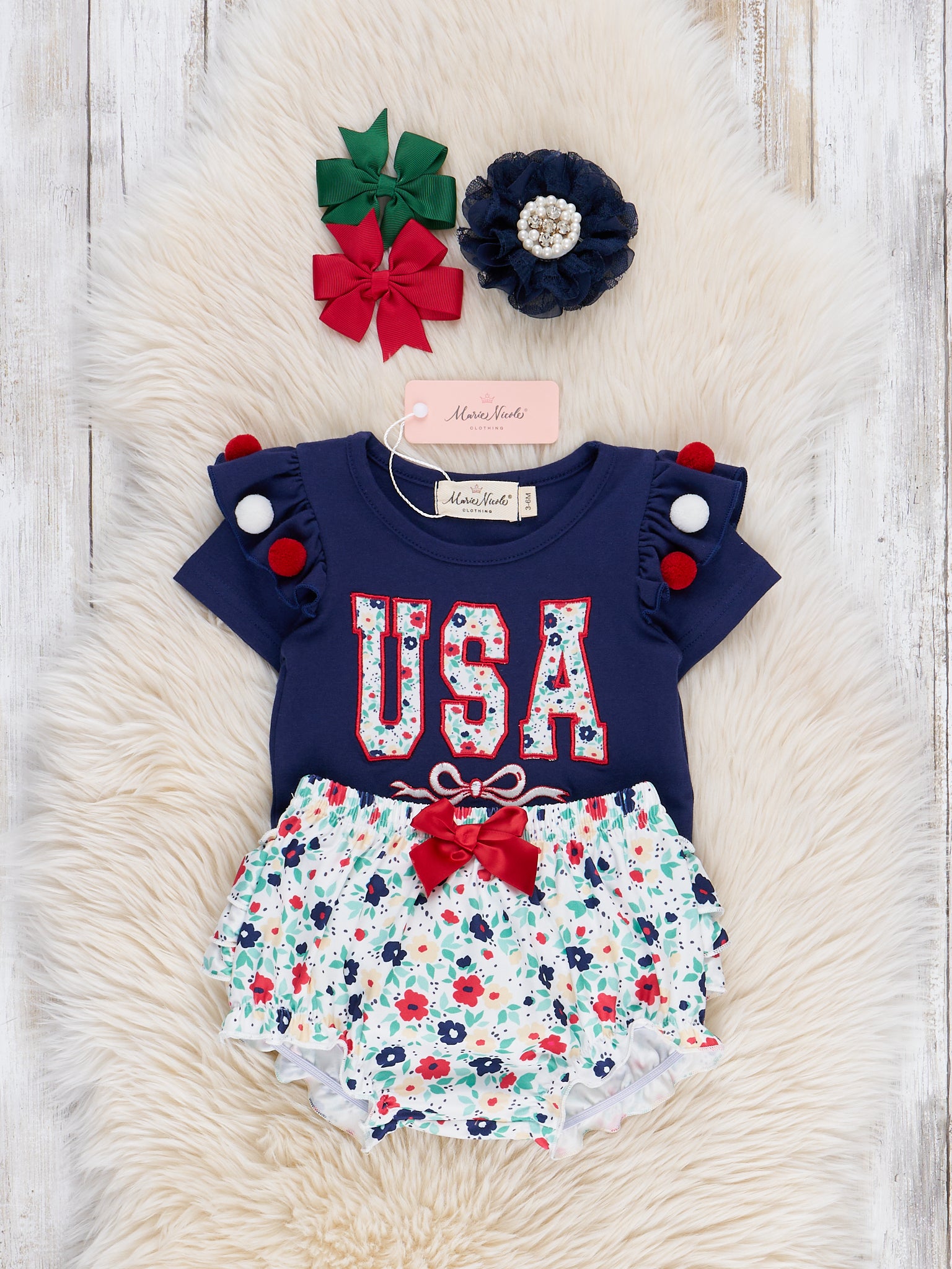 Dress your little lady in the USA Garden Bloomers Outfit by Marie Nicole Clothing for a fun, patriotic look. This adorable sister set includes a navy blue top with embroidered floral USA and floral bloomers. Perfect for Fourth of July celebrations and summer days in the sun!