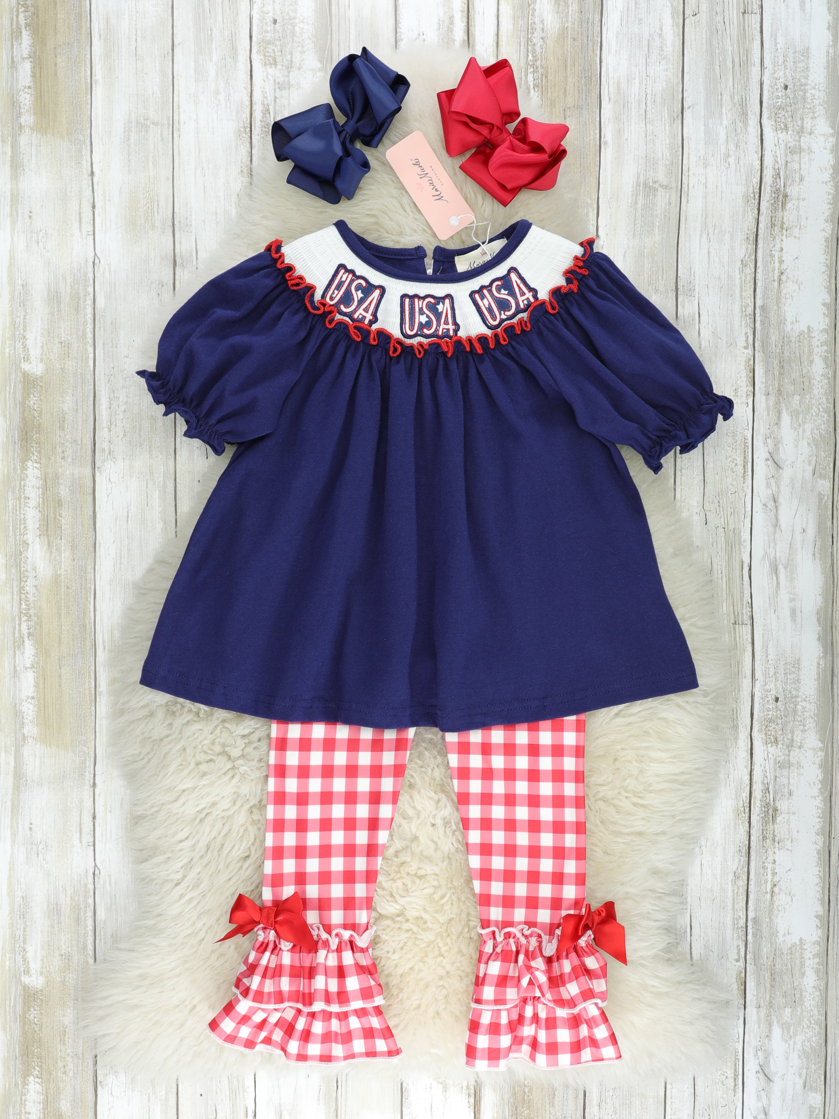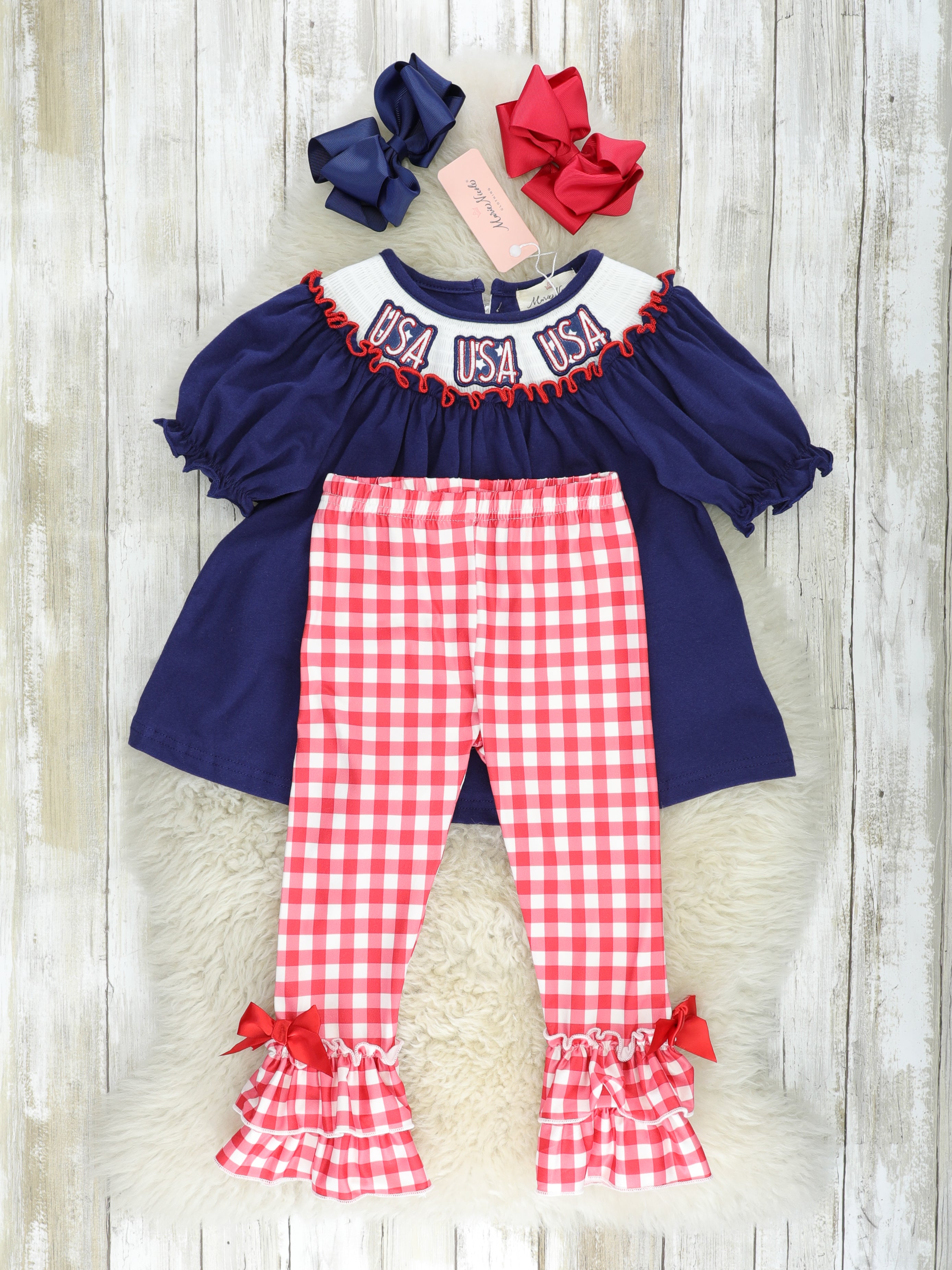 Show your American pride with this darling sister set featuring smocking, embroidered USA detail, and a classic gingham pattern. Whether it’s for the Fourth of July or any day of the year, this sweet outfit will be sure to have your little ones ready to rep the USA!