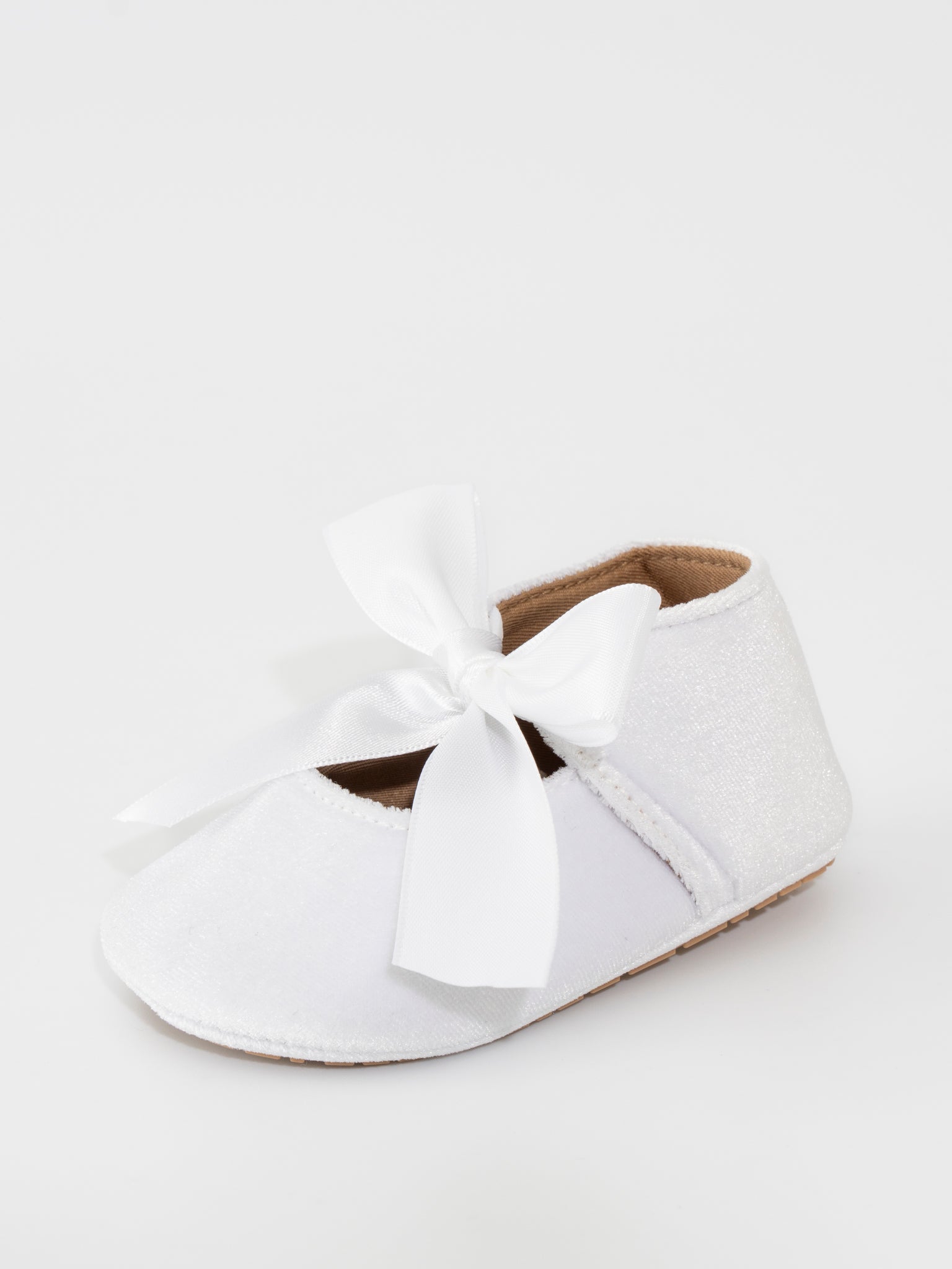 Twirl around in the Velvet Ribbon Bow Baby Shoe! This pair from Marie Nicole Clothing lets your girl be a ballerina everyday with its soft fabric and adorable bow. This cute and comfortable choice is the perfect pretty shoe for any party or event.