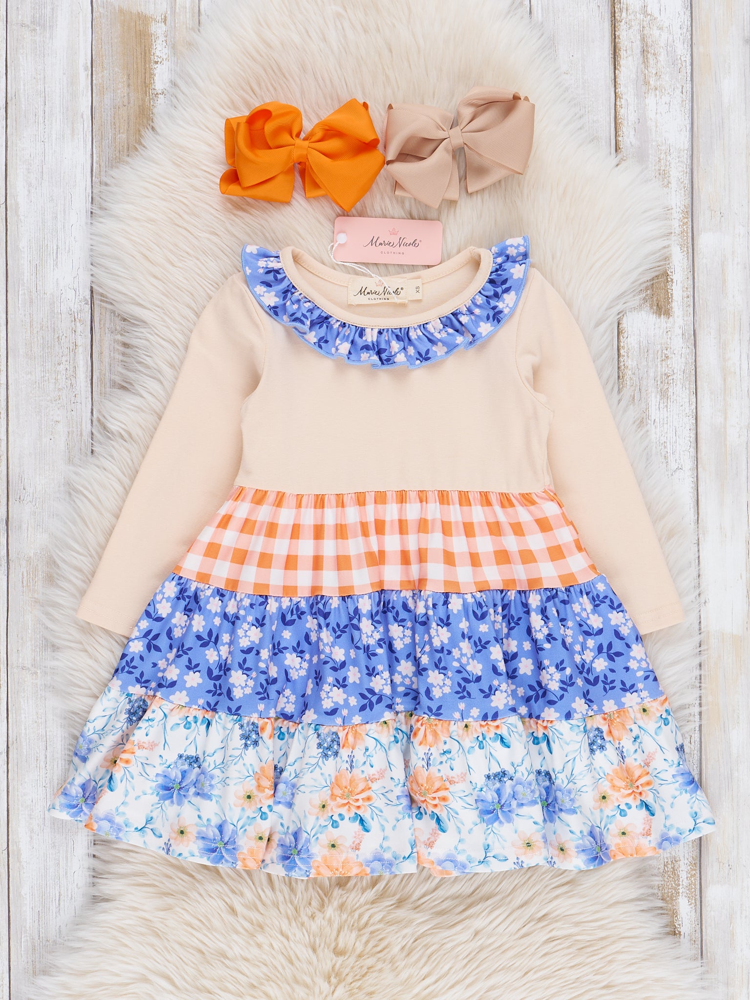 Bring the flower power with the vibrant Violet & Orange Blooms Ruffle Dress, fit for any little fashionista. This girls' ensemble features charming mixed floral & gingham prints on a playful tiered ruffle hem, perfectly complimenting the floral ruffle collar. And for sister sets, it's a match made in style heaven. Sister squad goals, anyone?!