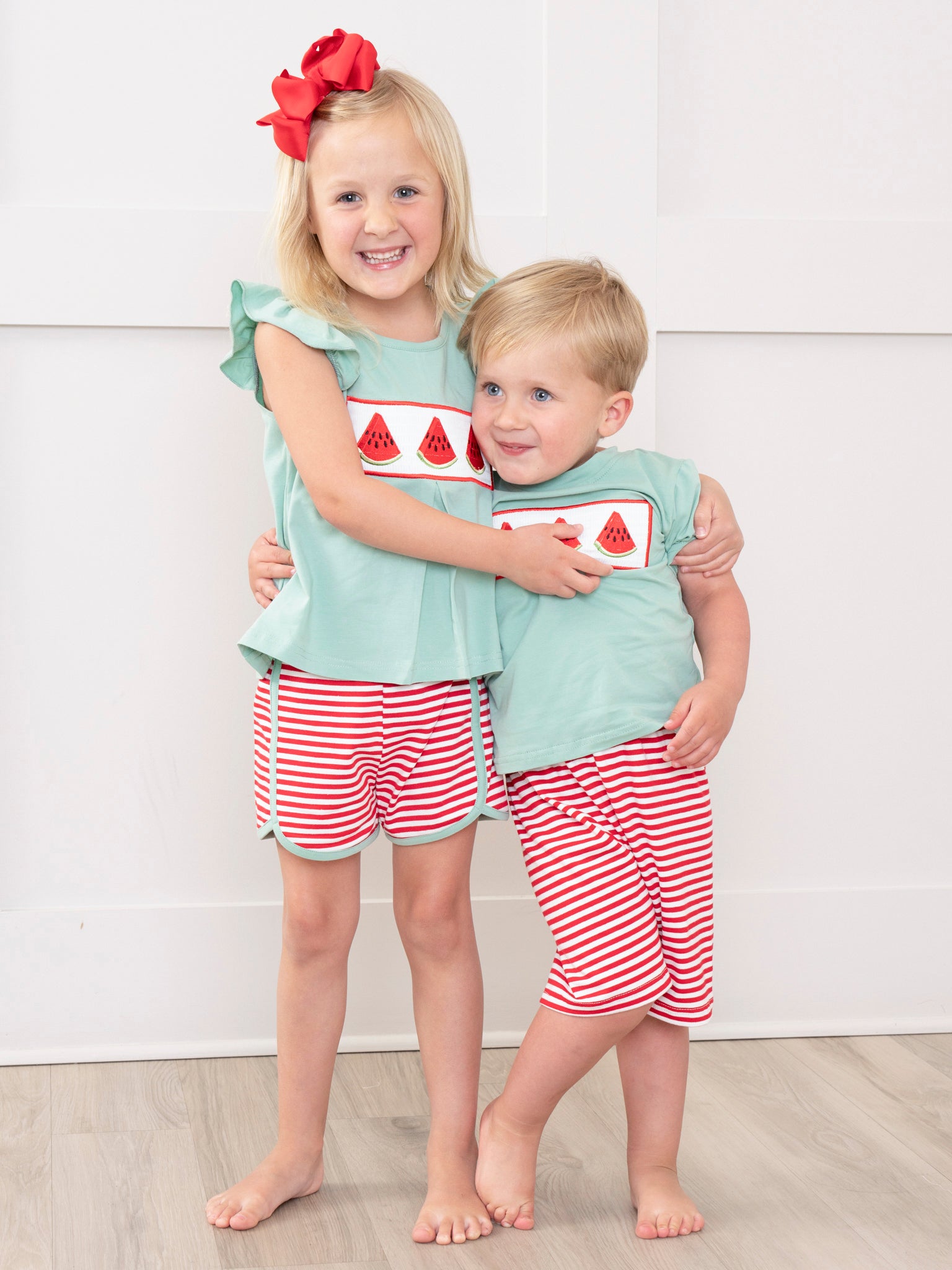 Unleash some serious summertime cuteness with this sibling set by Marie Nicole Clothing! Featuring playful red stripes shorts paired with fresh top, and cute embroidered watermelon over smocking, this Watermelon Stripes Smocked Cotton Outfit is perfect for your little one's summer adventures. Hurry and grab this juicy set while it lasts!