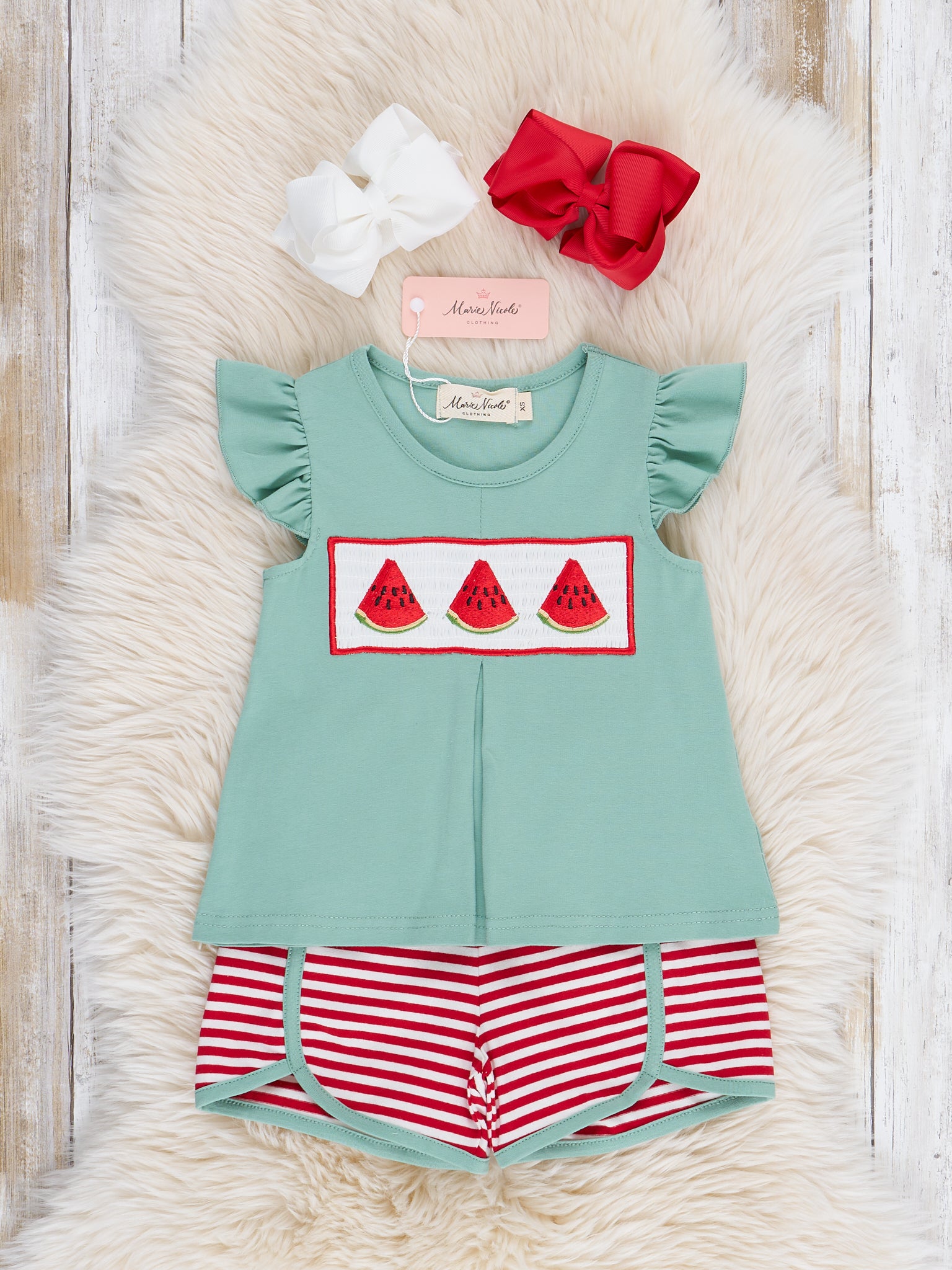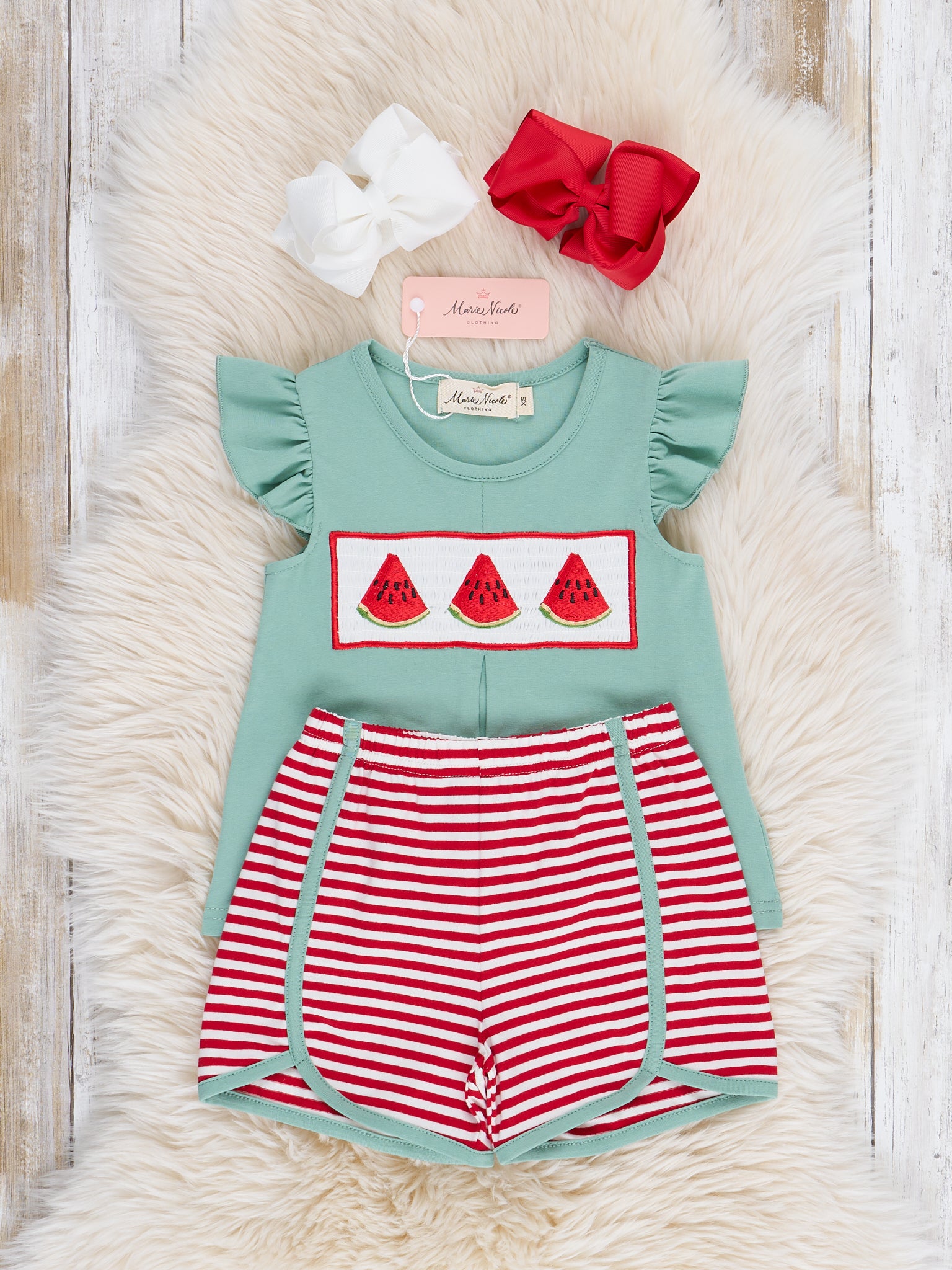 Unleash some serious summertime cuteness with this sibling set by Marie Nicole Clothing! Featuring playful stripes shorts paired with fresh ruffle top, and cute embroidered watermelon over smocking, this Watermelon Stripes Smocked Cotton Ruffle Outfit is perfect for your little one's summer adventures. Hurry and grab this juicy set while it lasts!