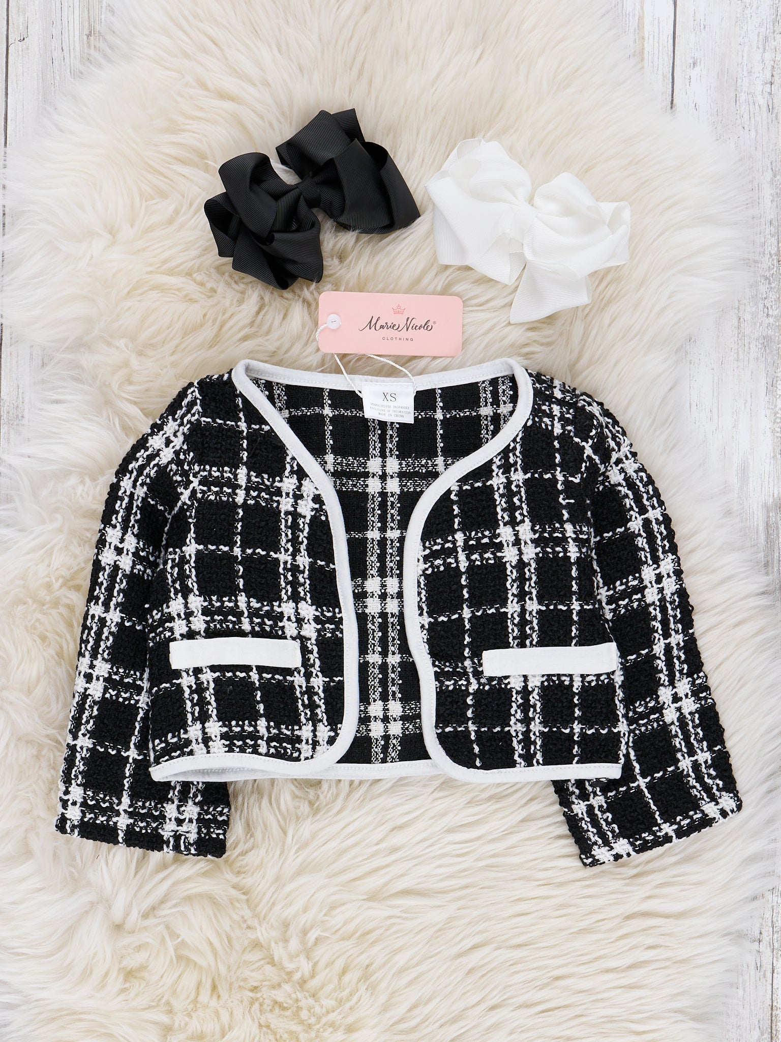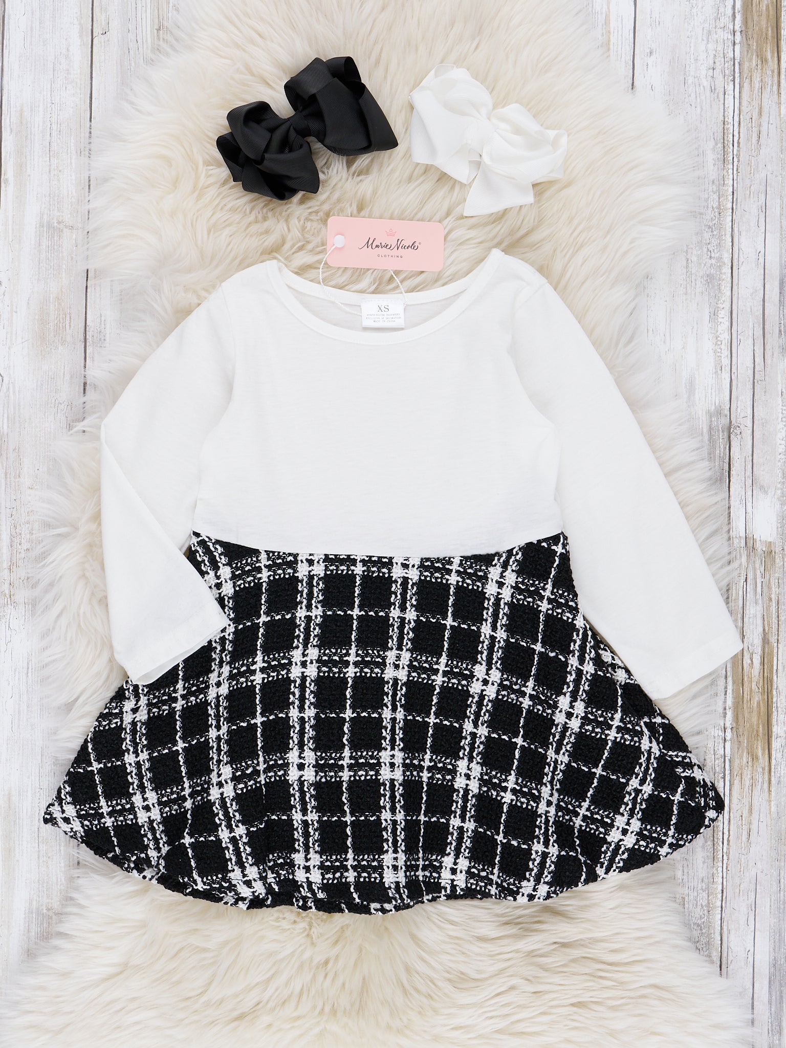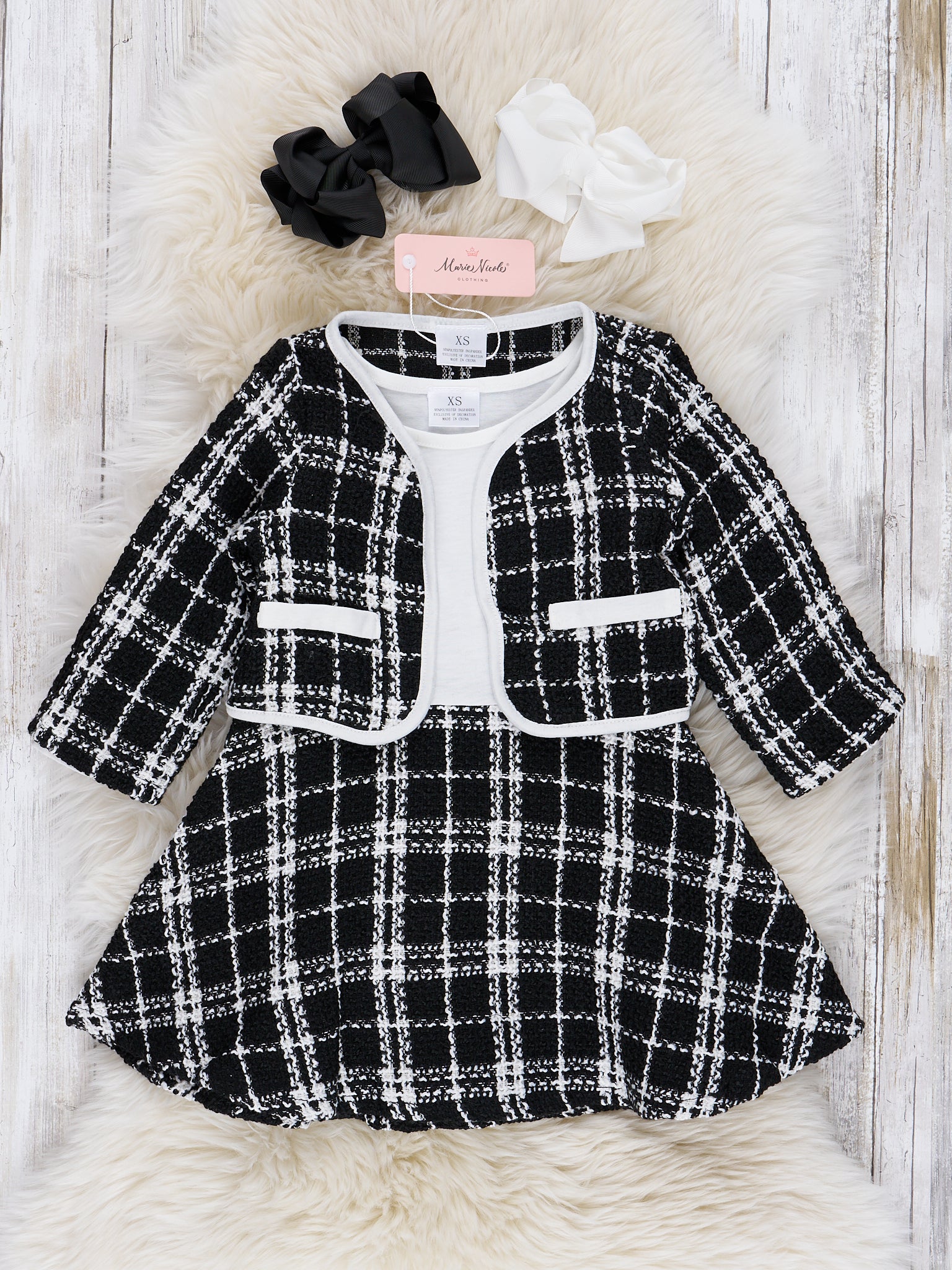 This darling dress is bound to keep your girls extra warm this season! This woven white and black plaid dress and cardigan is so soft and comfortable.