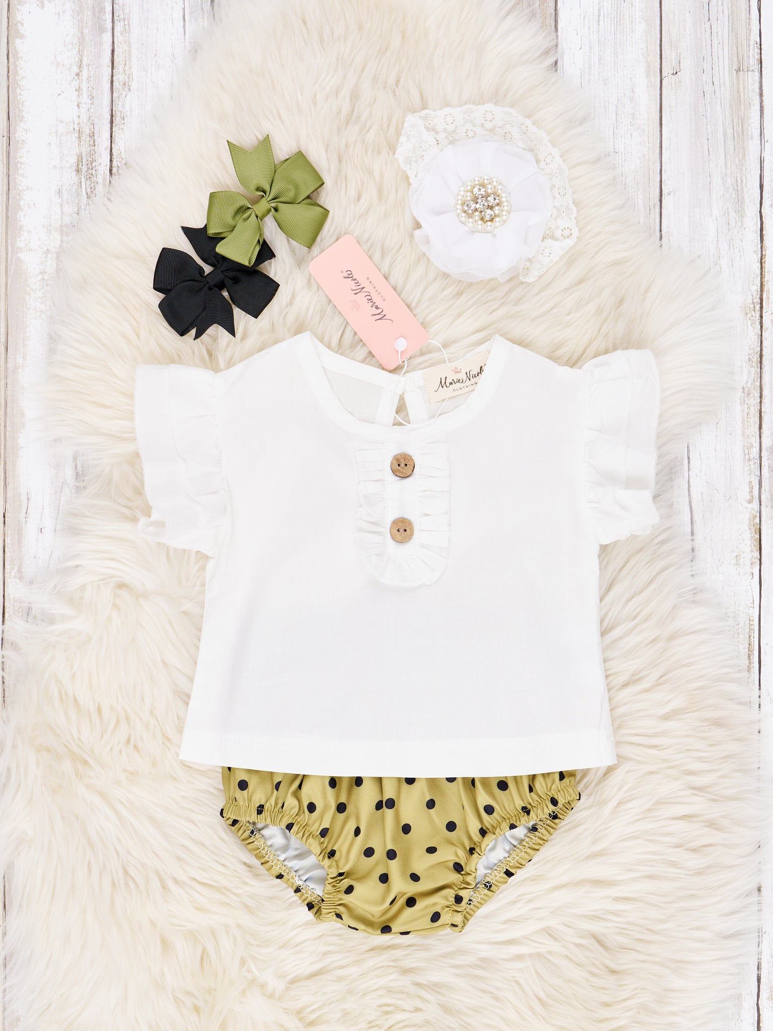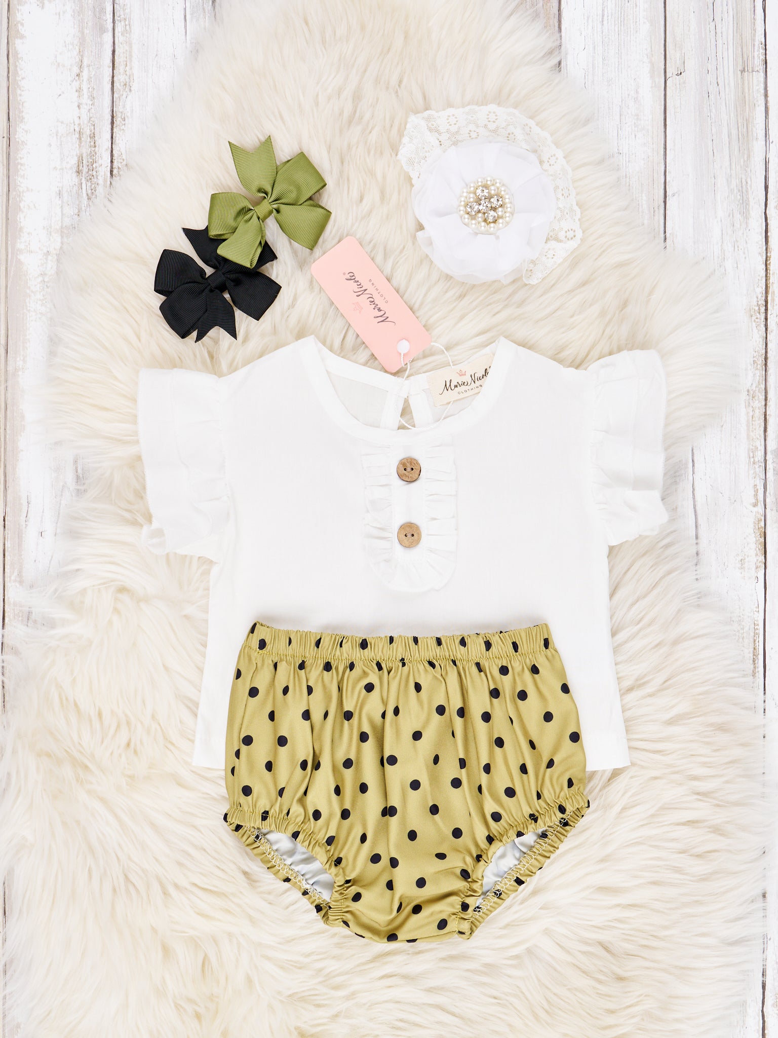White Ruffle Top & Green Polka Dot Bloomers Outfit