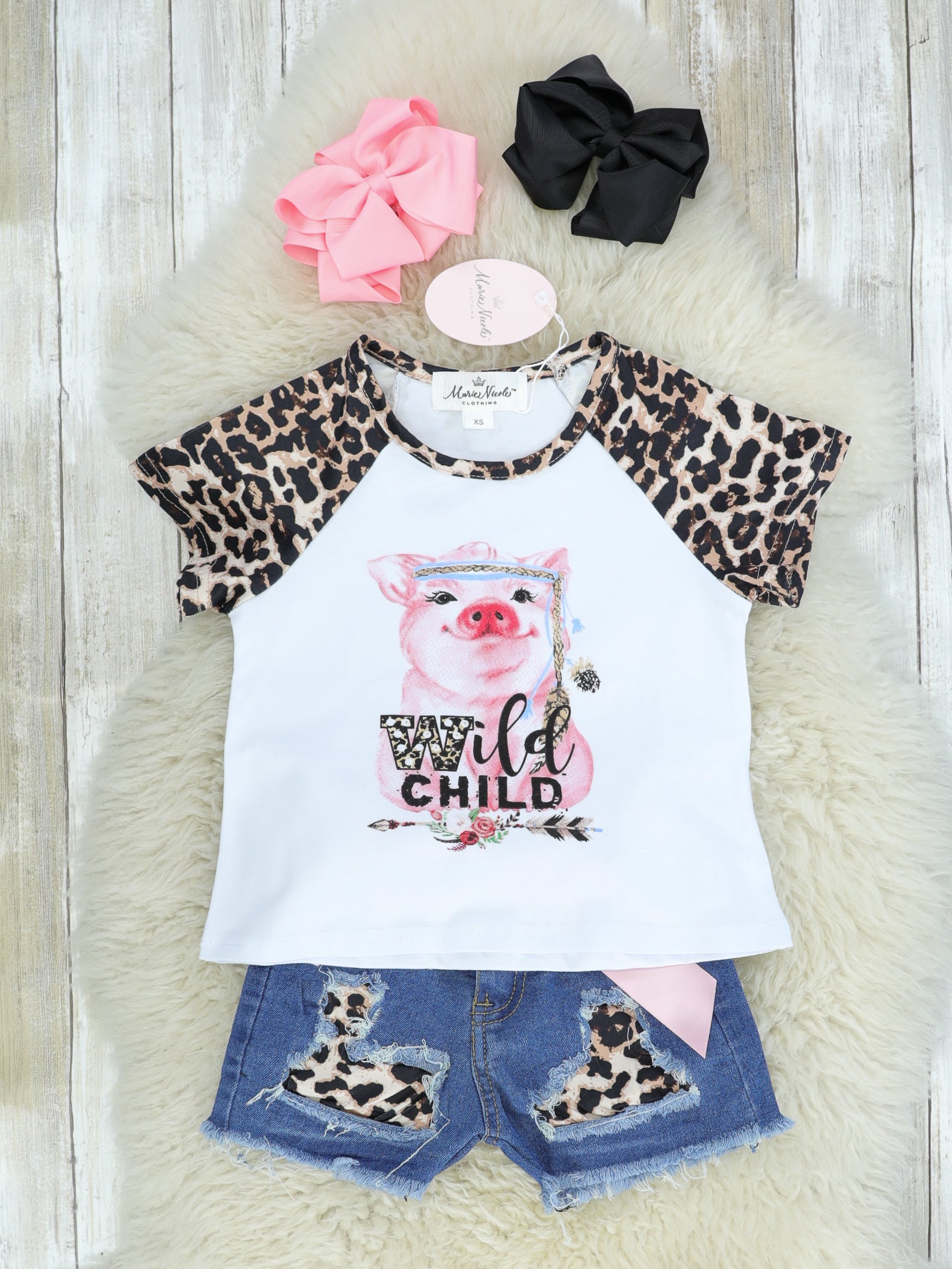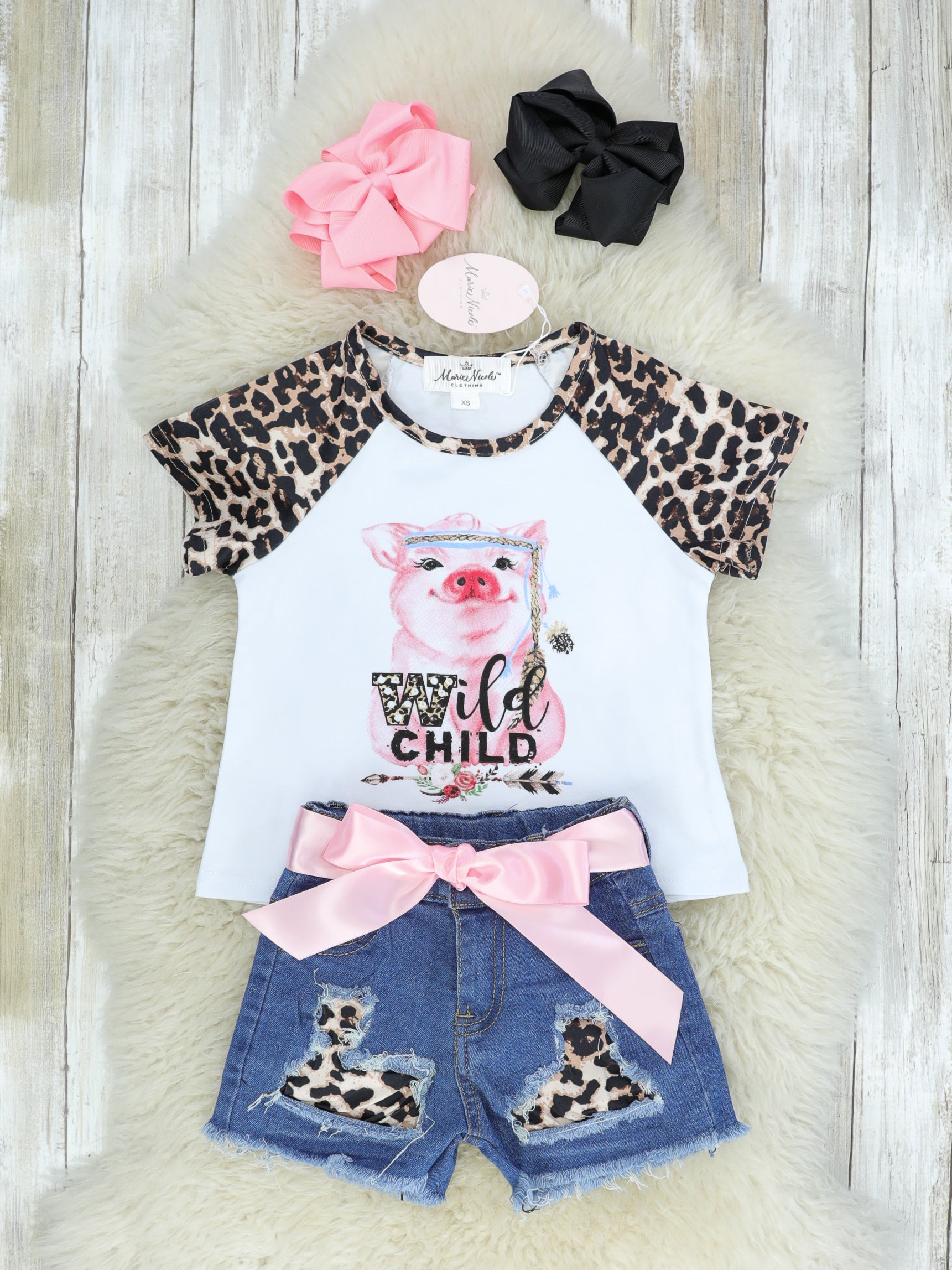The cutest piglet outfit for your WILD CHILD! We love the leopard print sleeves and matching leopard patches on the distressed denim shorts.